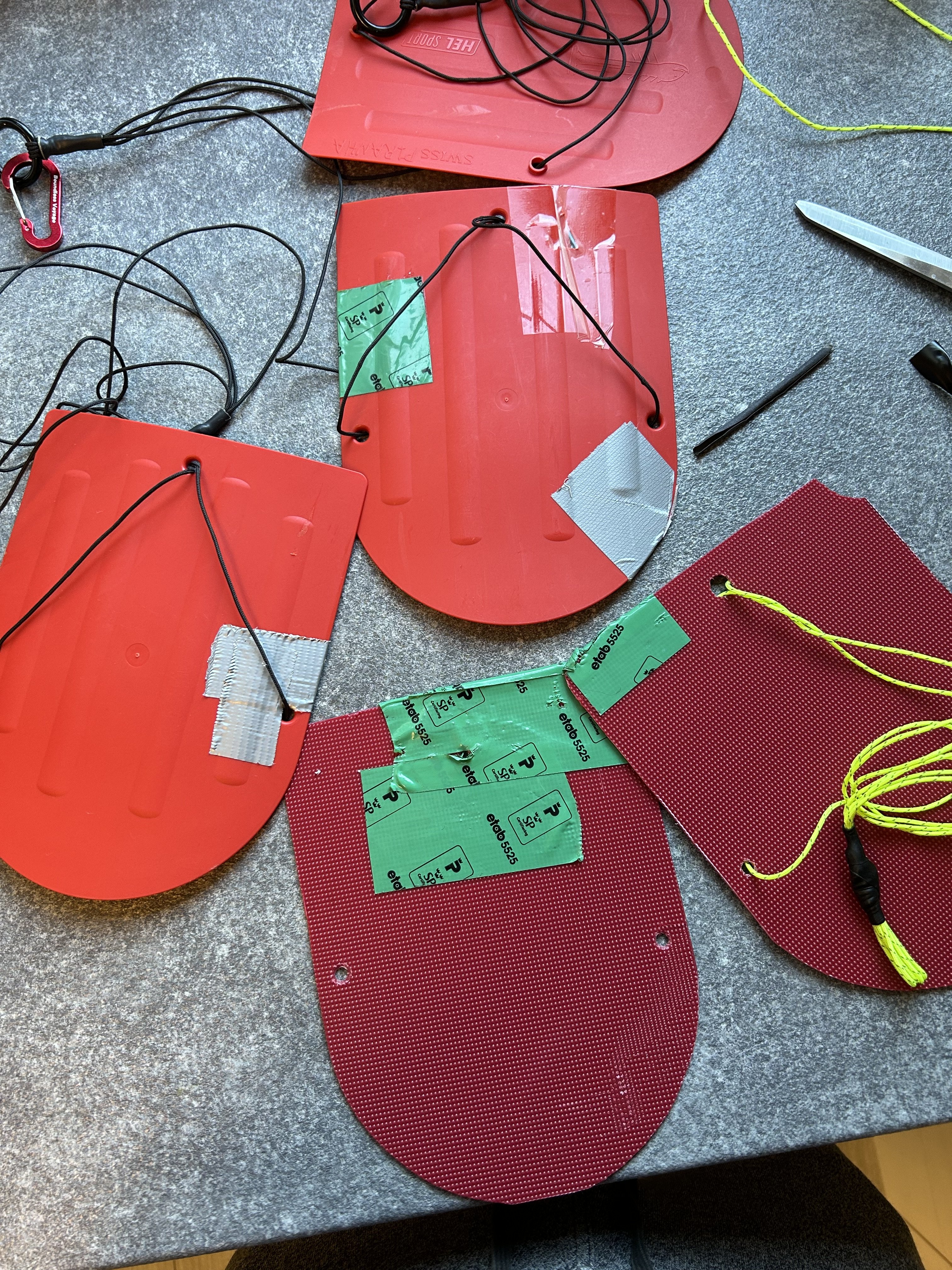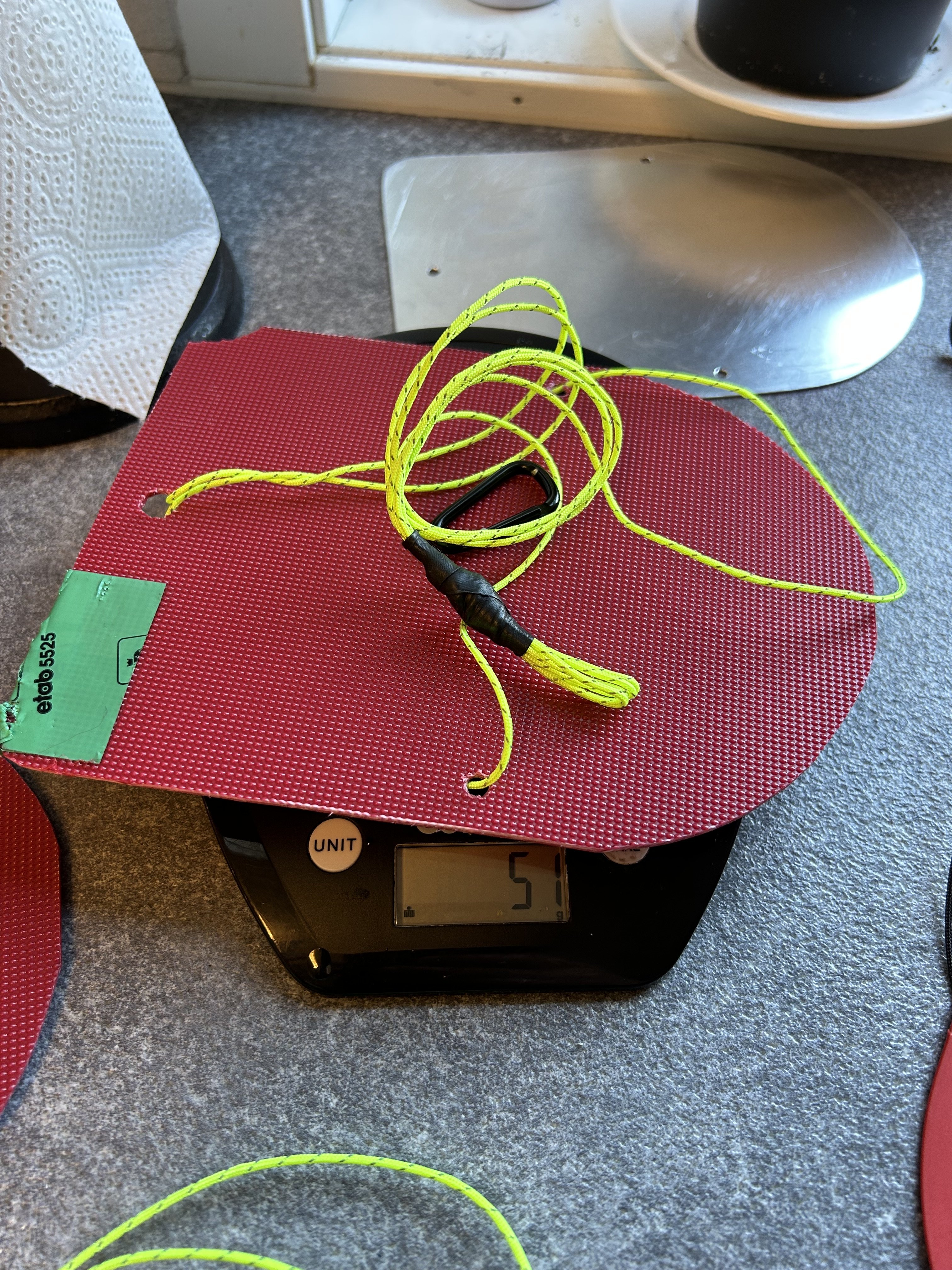 Jeg hadde tenkt å bruke 4mm maljer i hullene, men de var tom for maljetang på biltema, så da ble det uten. Jeg har dratt slipepapir gjennom hullene i stedet, for å unngå skarpe grader. Jeg har prøvd å gnage av snoren i hullene, men jeg har ikke fått det til, selv med denne tynne snoren. Når disse er plassert i snøen blir det heller ikke bevegelse på snoren imot hullkantene, så det er kun når du tar de opp, eller setter de ned, det blir bevegelse der. Så gnag er nok ett ikkjeeksiterande problem Skulle det allikevel skje på tur, eks. om man kutter de med spaden eller noe, virker de enda om en snor ryker, men litt redusert hold. Og det er svært enkelt å reparere: bare dra snoren gjennom på baksiden og knyt sammen. Man får også tykkere bardunsnorer som er svært motstansdyktig mot spadeblad og slikt. Men disse tynne som originalt er på snøankrene, og de jeg har brukt, er myke og lette, og pakker fint sammen i posen -