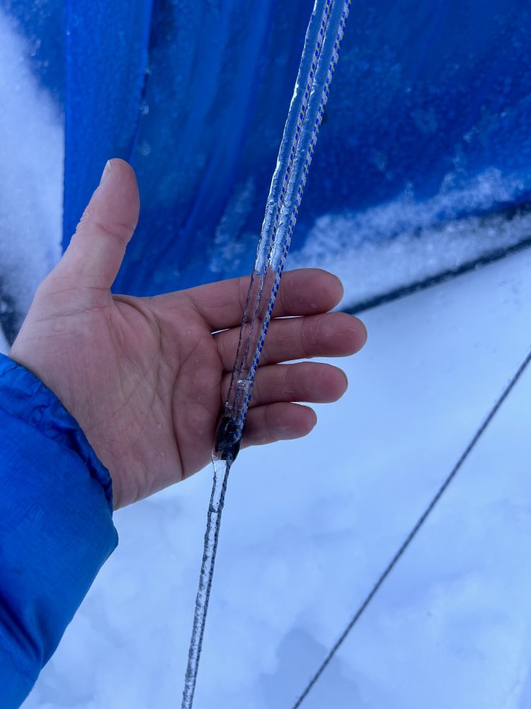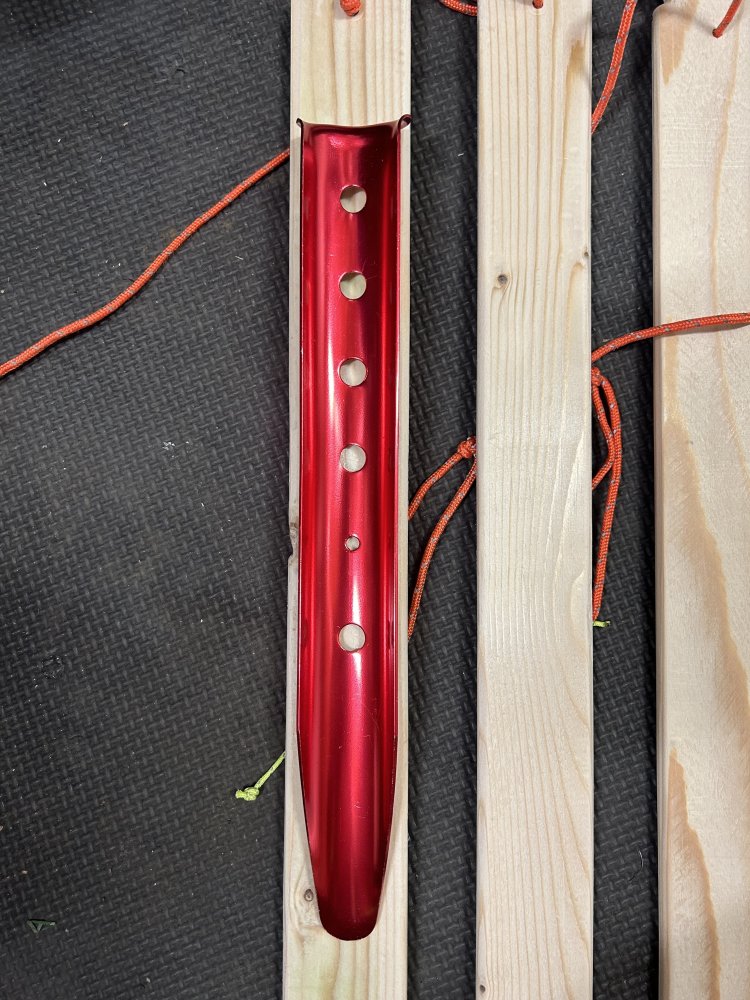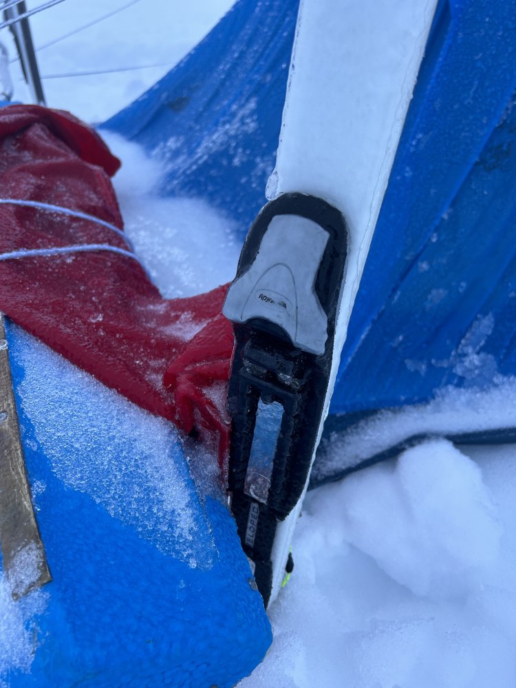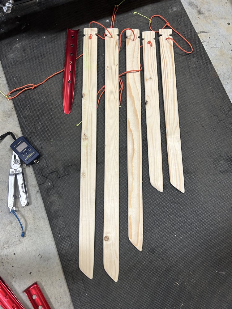 Da har disse fått kjørt seg på Hardangervidda. På bardunene liker jeg fortsatt absolutt best små snøankre i plast, med en liten karabinkrok som man fester til bardunen. Da kan man også bruke barduner med bare en strammer, (og evt, strikk i andre enden) siden bardunen ikke fryser fast i snøen. (Jeg skal kjøpe alu-plate på biltema, i 0,7mm eller 1mm tykkelse, og prøve å lage kopier. Det er neste prosjekt). Langs teltduken var trepluggene akkurat like gode som jeg håpet. Hakket på toppen er ikke noe særlig å skryte av, det hadde vert bedre med en tapp eller leppe. Og siden de mangler leppe må de settes ganske på skrå hvis du vil være sikker på at ikke pluggfestet skal skli opp. Men du verden, man har jo rikelig med lengde, og de sitter veldig bra. Ellers brukte jeg også Åsnes Spitsbergen Expedition fjellskistaver. Trinsen er lett å skru av/på, på denne modellen, så da satt jeg de ned med spissen uten trinse. Det var også betydelig bedre og enklere enn å stikke håndtaket ned i snøen. En løsning jeg kommer til å bruke flere ganger!