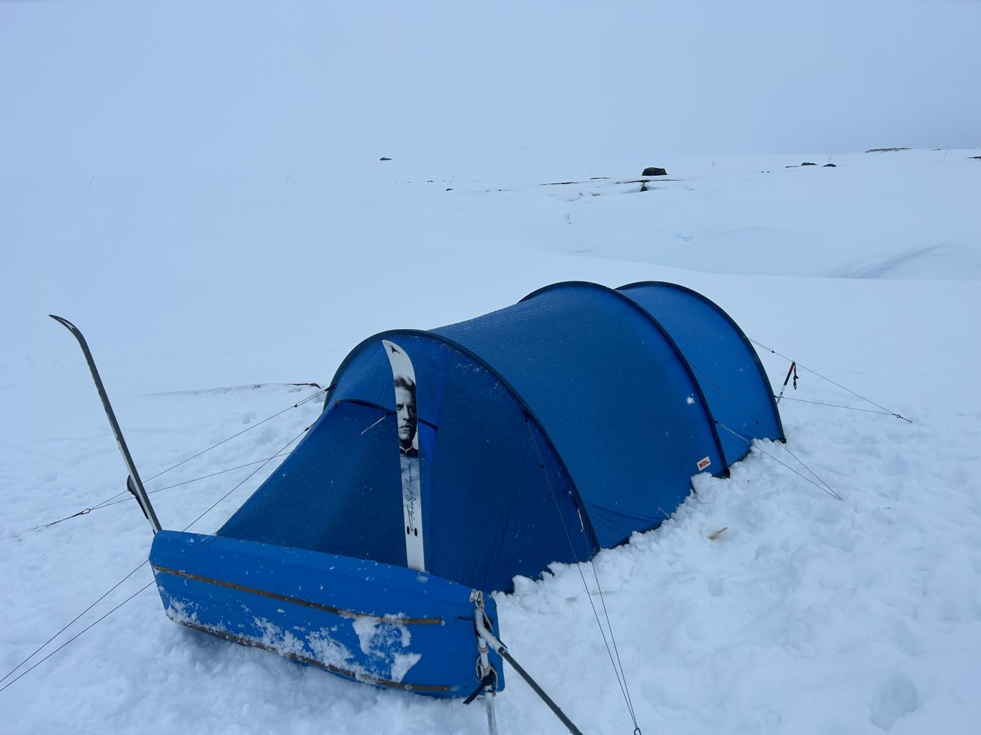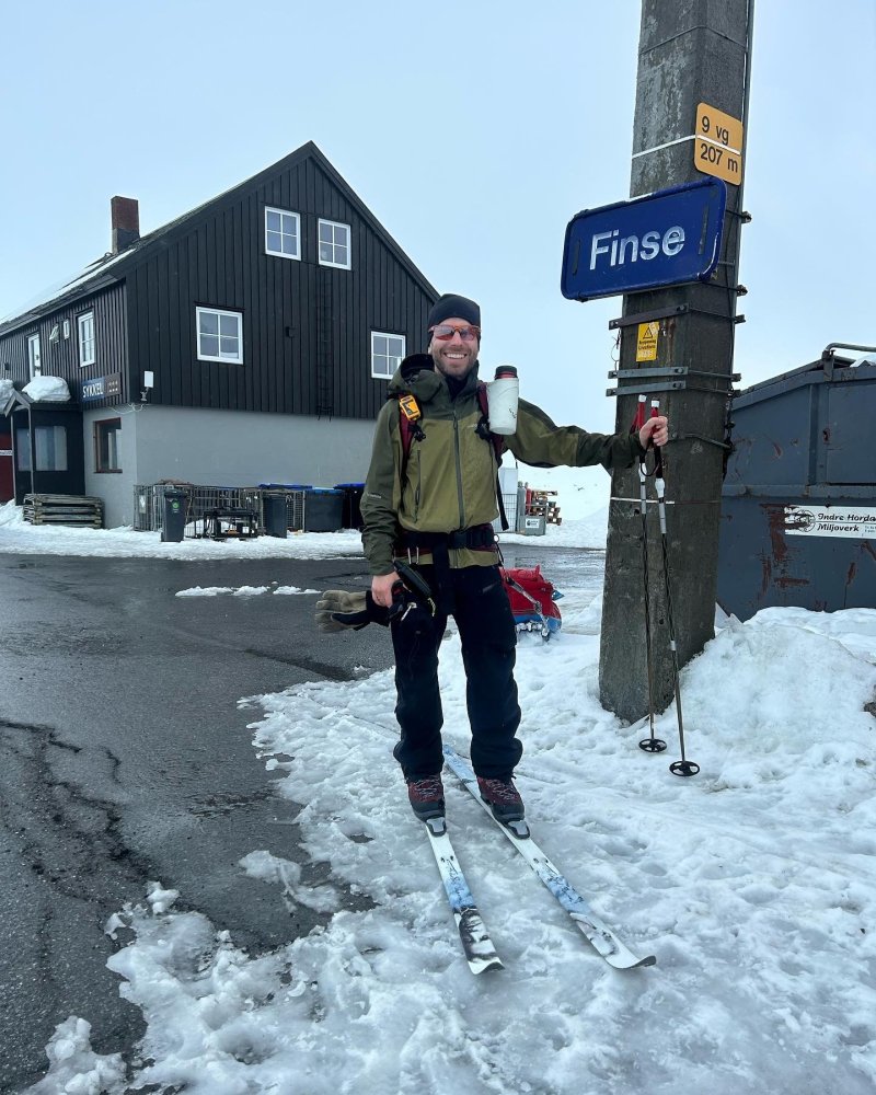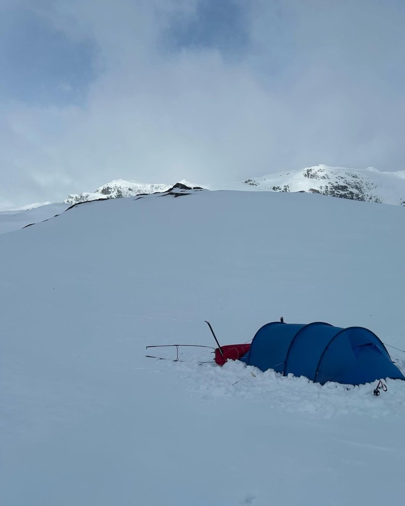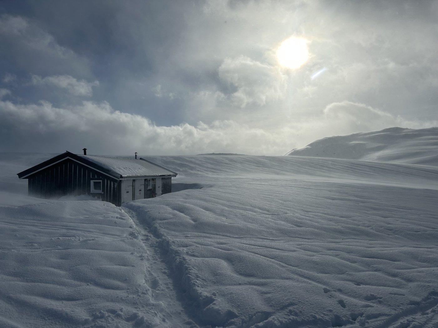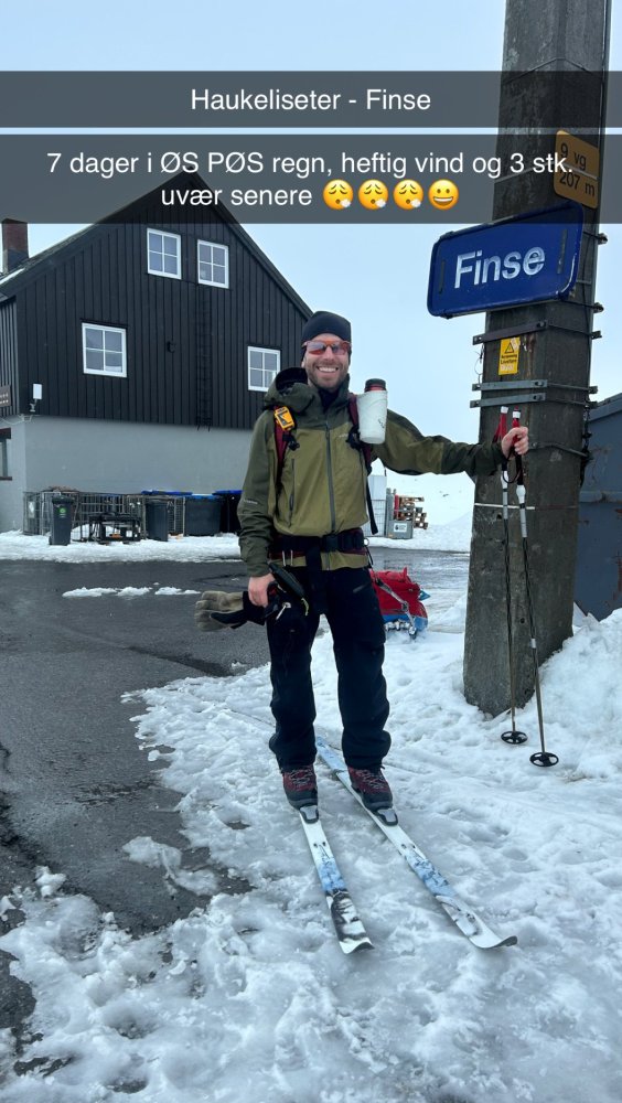 For ett eventyr det var å krysse Hardangervidda, alene. Og for ett (u)vær det har vert! 😅 To dager før jeg reiste var det -19C og gnistrende vinterføre! Uken etter at jeg har kommet hjem skal det igjen være stabilt med kuldegrader, og tørr fin snø. Jeg pleier ikke å være så heldig med været, og har måttet håndtere det værste man kan få på vintertur: ØS PØS REGNVÆR! Hadde jeg ikke vert Bergenser, ville jeg dauet på vidda 😅 Dag 1 av 7: Haukeliseter - Mannevatn Distanse: 11km Temperatur: -2C - +2C Sikt: Stort sett whiteout* Vær: Snø, regn Vind: Rundt 1-5 m/s. Startet sent på ettermiddagen etter å ha gått av bussen ved Haukeliseter. Det hadde snødd i mage dager, så det var dyp snø. Det var rundt null grader, vindstille og snøvær. Det ble noen heftige høydemeter, med en tung pulk på slep. Jeg har jo med mat, utstyr og drivstoff for 7 dager på tur. Planen er å følge kvistet rute innover fjellet. Det var stort sett whiteout, så jeg ser ikke forskjell på himmel og bakke. Kvistene er fjernet deler av strekningen (på grunn av villreinen), og en gruppe som kom ned sa jeg burde snu fordi det var umulig å finne veien og se hvor man går. Jeg forsikret om at dette gikk fint, og fortsatte. Jeg orienterte meg etter GPS, og jeg kunne skimte stavhullene i snøen, og noen steder skispor, etter de som kom ned. Da går jeg ihvertfall ikke utfor en kant. Jeg følger disse så lenge det går, og slår leir om jeg ikke har spor eller kvister å følge. Det sluttet å snø, og gikk over til REGN! Det skal ikke REGNE på hardangervidda i begynnelsen av April! Litt forbi Mannevatn kom kvistmerkingen tilbake. Første leir ble etablert, og det ble brukt en del parafin på primusen for å tørke våte klær utover kvelden. På vintertur pleier ting å holde seg ganske tørt, så dette regnet, kombinert med kulde, snø og vind, skapte mye utfordringer utover uken. BILDER: https://www.instagram.com/p/C5rIrX4sLai/?igsh=cG04bDJvMWc2ZjRt Dag 2 av 7: Mannevatn - Hellevassbu Distanse: 14 km Temperatur: 0C - +2C Sikt: Tidvis god sikt Vær: ØS PØS REGN! Vind: 6-12m/s, kastevinder ca. 15-19m/s Da jeg kom ut å skulle ta ned teltet var ALT glasert! Ett tykt lag is dekket alt av telt, barduner, ski og pulk. Det var yr og kald vind, altså underkjølt regn. Etter å ha banket og skrapt is av alt utstyr, gikk det over til ØS PØS regnvær! Dette var helt feil til å oppdage at membranet i ski buksen min er utslitt. Jeg kjente vannet trenge gjennom langs bena, og fyllte opp skiskoene til randen med vann ganske fort… Det hadde også snødd mye om natten, så jeg gikk i dyp våt løssnø med sørpe på toppen. Skituppen var ofte under snøen, og hvert stavtak sank 40cm ned i snøen, og trinsen tok med ett halvt kilo sørpesnø opp for hvert tak. Jeg rakk å tenkte at med disse forholdene kommer jeg ALDRI til å nå Finse, før også vinden tok seg kraftig opp, og sikten ble dårlig. Vannet surklet i skiskoene, og jeg visste at teltet var pakket ned helt vått. Etter 14km i sørpesnø ankom jeg Hellevassbu, og var helt utslitt. UAKTUELT å sette opp telt nå, og bruke hele natten på å tørke ting. Her var flere som hadde søkt tilflukt fra uværet, og ikke hadde beveget seg ut i dag. Det ble fyrt i alle vedovnene, og alt ble hengt opp til tørk. Utover natten hadde jeg høy hvilepuls, og hørte uværet ta seg opp utenfor hytten. Jeg kvapp og våknet hver gang hytten ristet. Det var gått over til kraftig snøvær, og om det i det hele tatt er mulig å bevege seg ute i morgen, blir det blodslit gjennom dyp løssnø… Shit, jeg kommer meg aldri til Finse… BILDER: https://www.instagram.com/p/C5rRtW1tlqN/?igsh=b2xnNWt5dnlwZDZn Dag 3 av 7: Hellevassbu - Bismarvatnet Distanse: 31 km! Temperatur: -4C - +5C Sikt: Stort sett veldig bra sikt. Vær: Mest sol! Og snøfokk Vind: Mellom 0-15m/s, kastevinder ca. 17-20m/s Alt utstyr og bekledning var tørket, og jeg var klar til å prøve meg ut. Jeg fant en søppelsekk til bagasjen, og laget en «regnskjørt» av en annen søppelsekk slik at jeg kanskje overlever i tilfelle mer regn på turen. Der blåste heftigere enn i går, og det føyket godt langs bakken, men vindretningen betydde medvind - så jeg prøver. En ting vind gjør, det er å lage bra SKIFØRE! All snøen fra natten hadde blåst bort, og regnet hadde fryst, så det var skareføre, og jeg kunne gå fort. Vinden bakfra er MYE bedre enn vind imot! Første par timene var det riktignok mye oppover. Og fokksnøen som kom bakfra smeltet når de traff bindingene som solen varmet opp, og det iste hele tiden mellom skosåle og binding. Isen og måtte fjernes ett par ganger i minuttet til tider. Aldri opplevd maken, men om det ikke fjernes kan man trakke ut bøylen av skotuppen, og da er turen over, for det er en av de få tingene som ikke går å reparere i felt. Fenomenet varte heldigvis bare en times tid. De fleste holder seg nok inne i dag på grunn av vinden, men jeg storkoste meg. Jeg så kun èn gruppe på tur, eller var fjellet folketomt. Jeg gikk innom Litlos Turisthytte og støttet de med å kjøpe meg en kaffe og noe attåt. Etter lunch ga vinden seg og Hardangervidda viste seg fra sin beste side! 😍 Etablerte camp på Bismarvatnet, og siden det kun har føyket snø i dag, og ikke regn, kunne jeg krype i posen varm og helt tørr! BILDER: https://www.instagram.com/p/C5sPcmFNQv3/?igsh=MWJ5NzN4NWVsZmRvMQ== Dag 4 av 7: Bismarvatnet - ved Trondsbu Distanse: 27 km Temperatur: -4C - +6C Sikt: Alt fra god sikt, til whiteout Vær: Skyer, litt tåke, og REGN (igjen)! Vind: 0-10m/s, kastevinder ca. 12-13m/s NYDELIG morgen! Kuldegrader og lite vind. Pakket ned leiren, og børstet alt omhyggelig fritt for snø slik at alt skulle pakkes tørt ned. I dag blåste det relativt lite, målt i «Hardangervidda-skala». Jeg traff på folk fra Sandhaug Turisthytte, de forteller at det skal komme regn i dag, og ekstremt mye vind i morgen. HVA!?! Jeg som trodde kampen mot uværet var over for denne uk