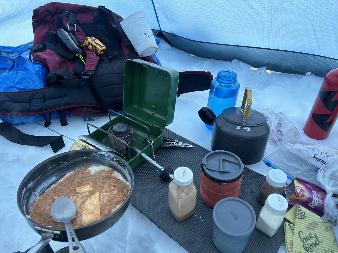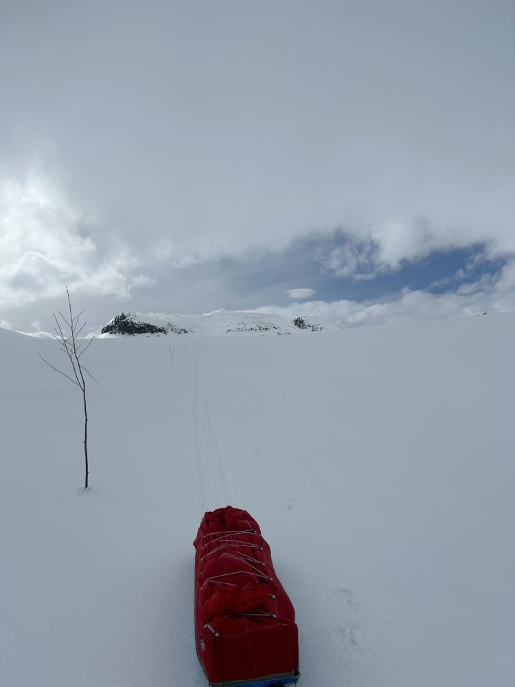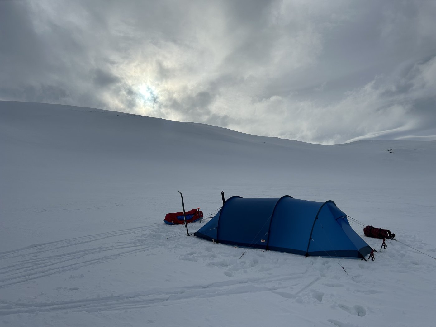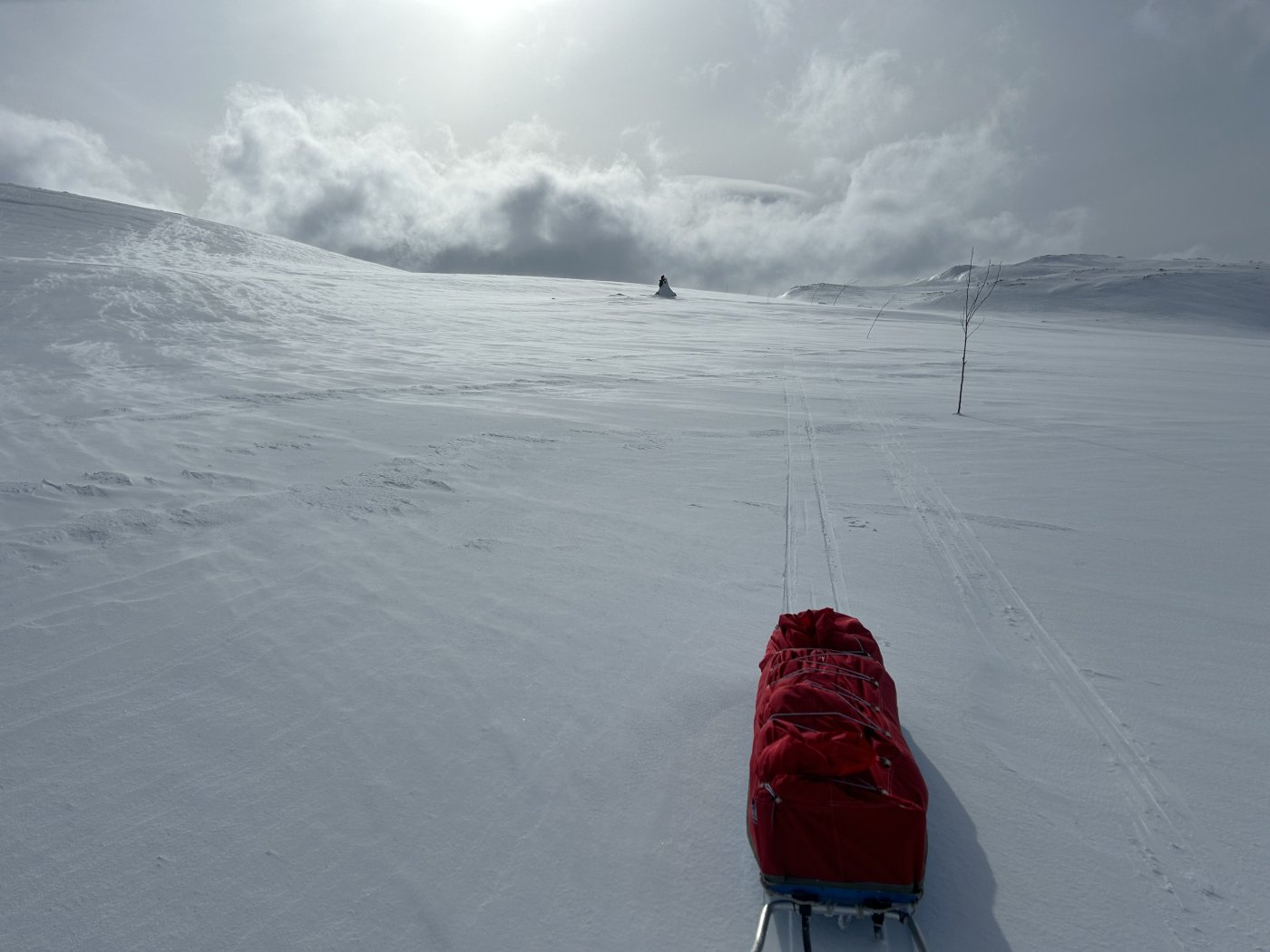 For ett eventyr det var å krysse Hardangervidda, alene. Og for ett (u)vær det har vert! 😅 To dager før jeg reiste var det -19C og gnistrende vinterføre! Uken etter at jeg har kommet hjem skal det igjen være stabilt med kuldegrader, og tørr fin snø. Jeg pleier ikke å være så heldig med været, og har måttet håndtere det værste man kan få på vintertur: ØS PØS REGNVÆR! Hadde jeg ikke vert Bergenser, ville jeg dauet på vidda 😅 Dag 1 av 7: Haukeliseter - Mannevatn Distanse: 11km Temperatur: -2C - +2C Sikt: Stort sett whiteout* Vær: Snø, regn Vind: Rundt 1-5 m/s. Startet sent på ettermiddagen etter å ha gått av bussen ved Haukeliseter. Det hadde snødd i mage dager, så det var dyp snø. Det var rundt null grader, vindstille og snøvær. Det ble noen heftige høydemeter, med en tung pulk på slep. Jeg har jo med mat, utstyr og drivstoff for 7 dager på tur. Planen er å følge kvistet rute innover fjellet. Det var stort sett whiteout, så jeg ser ikke forskjell på himmel og bakke. Kvistene er fjernet deler av strekningen (på grunn av villreinen), og en gruppe som kom ned sa jeg burde snu fordi det var umulig å finne veien og se hvor man går. Jeg forsikret om at dette gikk fint, og fortsatte. Jeg orienterte meg etter GPS, og jeg kunne skimte stavhullene i snøen, og noen steder skispor, etter de som kom ned. Da går jeg ihvertfall ikke utfor en kant. Jeg følger disse så lenge det går, og slår leir om jeg ikke har spor eller kvister å følge. Det sluttet å snø, og gikk over til REGN! Det skal ikke REGNE på hardangervidda i begynnelsen av April! Litt forbi Mannevatn kom kvistmerkingen tilbake. Første leir ble etablert, og det ble brukt en del parafin på primusen for å tørke våte klær utover kvelden. På vintertur pleier ting å holde seg ganske tørt, så dette regnet, kombinert med kulde, snø og vind, skapte mye utfordringer utover uken. BILDER: https://www.instagram.com/p/C5rIrX4sLai/?igsh=cG04bDJvMWc2ZjRt Dag 2 av 7: Mannevatn - Hellevassbu Distanse: 14 km Temperatur: 0C - +2C Sikt: Tidvis god sikt Vær: ØS PØS REGN! Vind: 6-12m/s, kastevinder ca. 15-19m/s Da jeg kom ut å skulle ta ned teltet var ALT glasert! Ett tykt lag is dekket alt av telt, barduner, ski og pulk. Det var yr og kald vind, altså underkjølt regn. Etter å ha banket og skrapt is av alt utstyr, gikk det over til ØS PØS regnvær! Dette var helt feil til å oppdage at membranet i ski buksen min er utslitt. Jeg kjente vannet trenge gjennom langs bena, og fyllte opp skiskoene til randen med vann ganske fort… Det hadde også snødd mye om natten, så jeg gikk i dyp våt løssnø med sørpe på toppen. Skituppen var ofte under snøen, og hvert stavtak sank 40cm ned i snøen, og trinsen tok med ett halvt kilo sørpesnø opp for hvert tak. Jeg rakk å tenkte at med disse forholdene kommer jeg ALDRI til å nå Finse, før også vinden tok seg kraftig opp, og sikten ble dårlig. Vannet surklet i skiskoene, og jeg visste at teltet var pakket ned helt vått. Etter 14km i sørpesnø ankom jeg Hellevassbu, og var helt utslitt. UAKTUELT å sette opp telt nå, og bruke hele natten på å tørke ting. Her var flere som hadde søkt tilflukt fra uværet, og ikke hadde beveget seg ut i dag. Det ble fyrt i alle vedovnene, og alt ble hengt opp til tørk. Utover natten hadde jeg høy hvilepuls, og hørte uværet ta seg opp utenfor hytten. Jeg kvapp og våknet hver gang hytten ristet. Det var gått over til kraftig snøvær, og om det i det hele tatt er mulig å bevege seg ute i morgen, blir det blodslit gjennom dyp løssnø… Shit, jeg kommer meg aldri til Finse… BILDER: https://www.instagram.com/p/C5rRtW1tlqN/?igsh=b2xnNWt5dnlwZDZn Dag 3 av 7: Hellevassbu - Bismarvatnet Distanse: 31 km! Temperatur: -4C - +5C Sikt: Stort sett veldig bra sikt. Vær: Mest sol! Og snøfokk Vind: Mellom 0-15m/s, kastevinder ca. 17-20m/s Alt utstyr og bekledning var tørket, og jeg var klar til å prøve meg ut. Jeg fant en søppelsekk til bagasjen, og laget en «regnskjørt» av en annen søppelsekk slik at jeg kanskje overlever i tilfelle mer regn på turen. Der blåste heftigere enn i går, og det føyket godt langs bakken, men vindretningen betydde medvind - så jeg prøver. En ting vind gjør, det er å lage bra SKIFØRE! All snøen fra natten hadde blåst bort, og regnet hadde fryst, så det var skareføre, og jeg kunne gå fort. Vinden bakfra er MYE bedre enn vind imot! Første par timene var det riktignok mye oppover. Og fokksnøen som kom bakfra smeltet når de traff bindingene som solen varmet opp, og det iste hele tiden mellom skosåle og binding. Isen og måtte fjernes ett par ganger i minuttet til tider. Aldri opplevd maken, men om det ikke fjernes kan man trakke ut bøylen av skotuppen, og da er turen over, for det er en av de få tingene som ikke går å reparere i felt. Fenomenet varte heldigvis bare en times tid. De fleste holder seg nok inne i dag på grunn av vinden, men jeg storkoste meg. Jeg så kun èn gruppe på tur, eller var fjellet folketomt. Jeg gikk innom Litlos Turisthytte og støttet de med å kjøpe meg en kaffe og noe attåt. Etter lunch ga vinden seg og Hardangervidda viste seg fra sin beste side! 😍 Etablerte camp på Bismarvatnet, og siden det kun har føyket snø i dag, og ikke regn, kunne jeg krype i posen varm og helt tørr! BILDER: https://www.instagram.com/p/C5sPcmFNQv3/?igsh=MWJ5NzN4NWVsZmRvMQ== Dag 4 av 7: Bismarvatnet - ved Trondsbu Distanse: 27 km Temperatur: -4C - +6C Sikt: Alt fra god sikt, til whiteout Vær: Skyer, litt tåke, og REGN (igjen)! Vind: 0-10m/s, kastevinder ca. 12-13m/s NYDELIG morgen! Kuldegrader og lite vind. Pakket ned leiren, og børstet alt omhyggelig fritt for snø slik at alt skulle pakkes tørt ned. I dag blåste det relativt lite, målt i «Hardangervidda-skala». Jeg traff på folk fra Sandhaug Turisthytte, de forteller at det skal komme regn i dag, og ekstremt mye vind i morgen. HVA!?! Jeg som trodde kampen mot uværet var over for denne uk