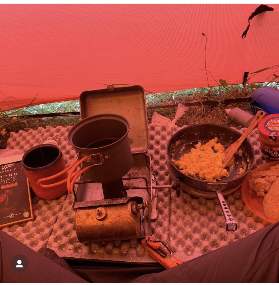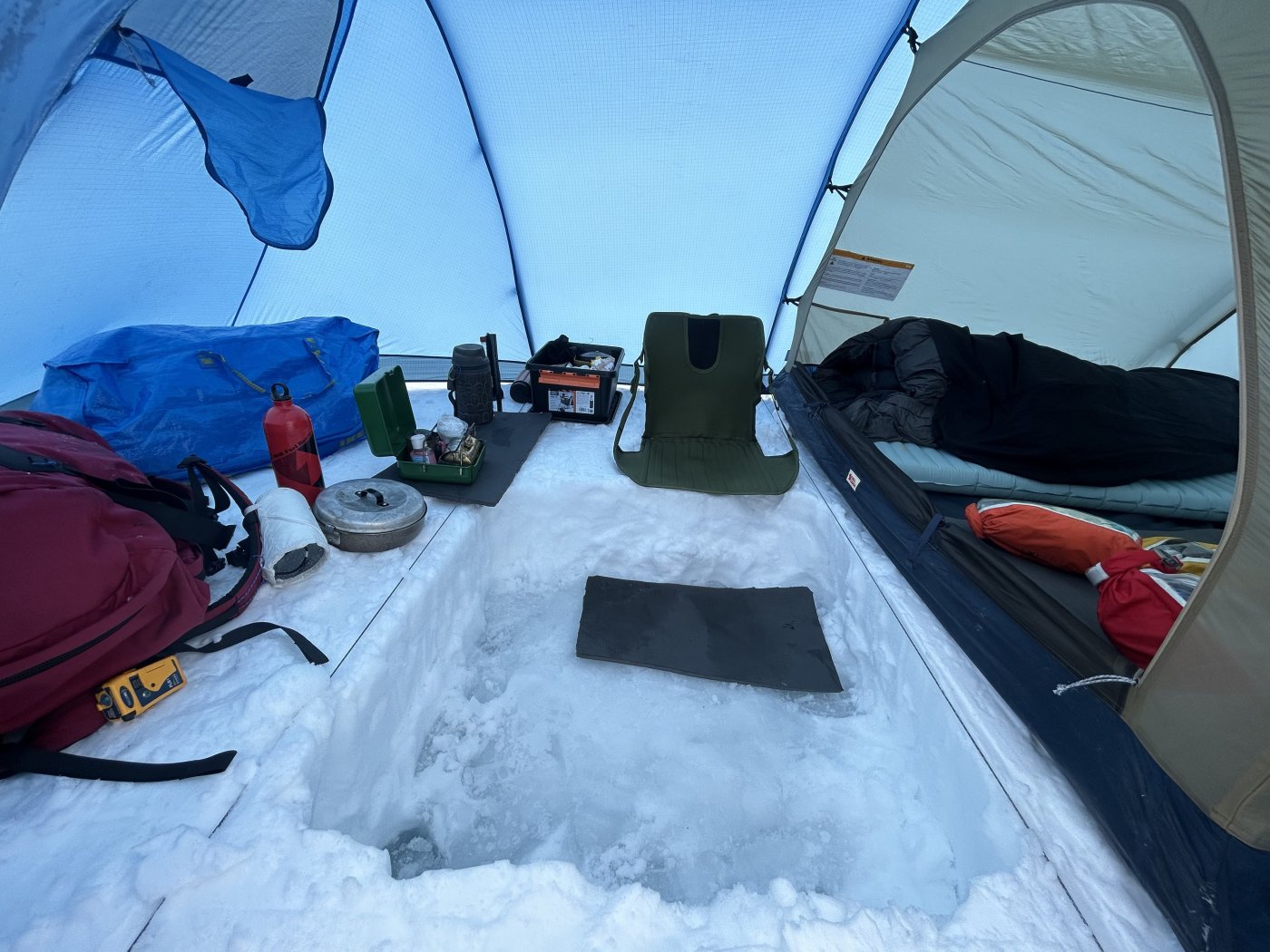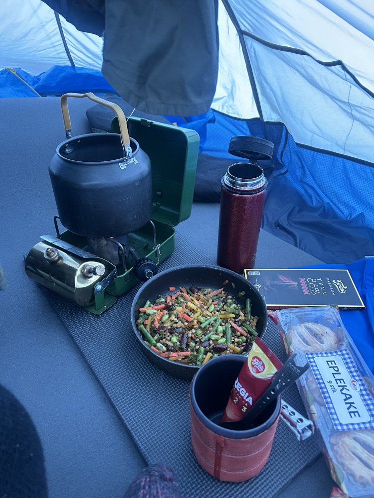 Jeg har ett skumunderlag som gulv. Det trekker jeg noen ganger over «dørteskelen», så får man kjøkkenbenk helt ut til forteltet: