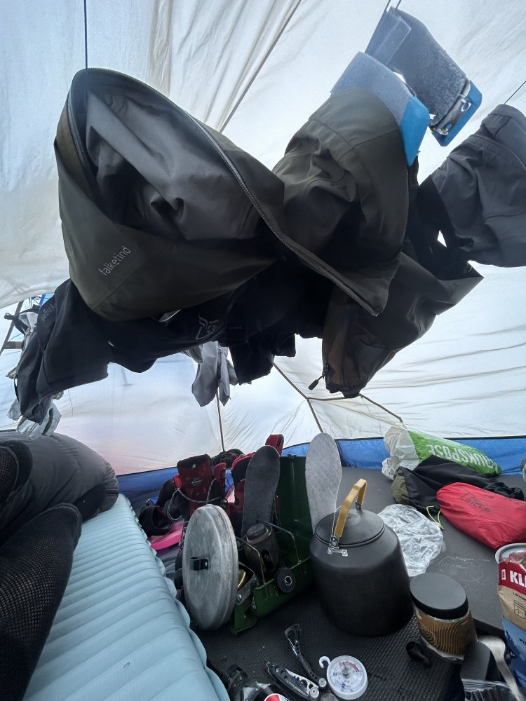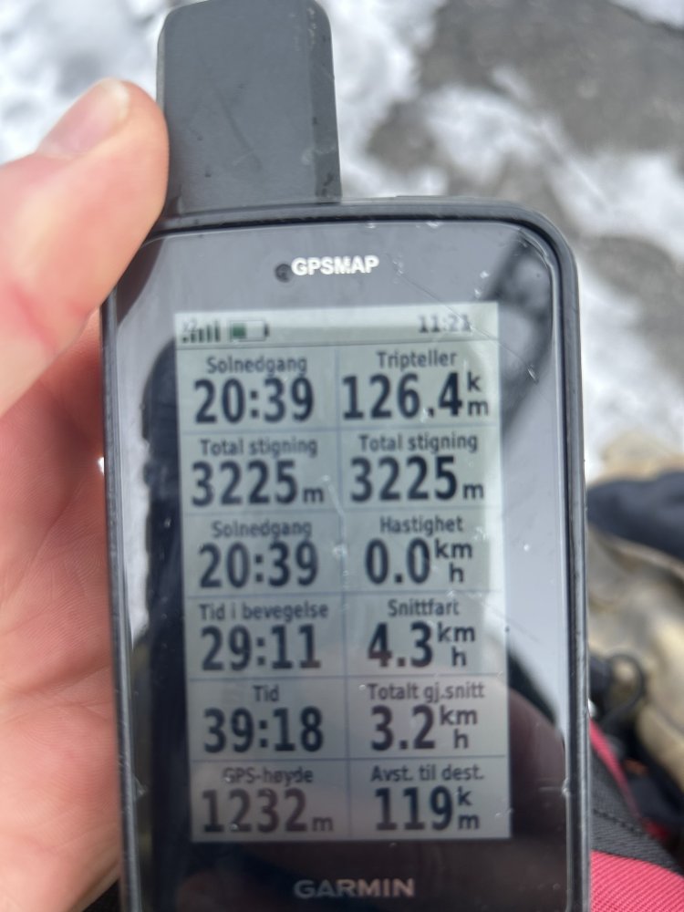 NERDERIER: (Slutt å lese her, hvis du ikke er interessert i rare detaljer ) Litt nerderier trengs, jeg lister opp noen momenter som jeg har erfart under turen: 1: Artic Bedding: Jeg har ikke dette, så ta dette med en stor klype salt. Men jeg så flere som brukte dette. Jeg tenker at med så ufattelig mye regn som jeg hadde på turen, så ville ikke denne kunne brukes, for den kan ikke tas klissvåt inn i teltet. Jeg hadde søppelsekker i pulkbagene mine (ikea poser med glidelås), for å holde ting tørt. Samtidig slet mange jeg traff med veltende pulker på skaren i den voldsomme sidevinden som man opplevde. Så lavt tyngdepunkt og lite vindfang var vesentlig til tider. 2: Pulkdrag: Jeg gikk halve første dagen med taudrag, og opplevde 4 velt. Skiftet til fast drag og hadde 0 velt resten av turen, selv i hard sidevind og skareføre. Samtidig tror jeg taudrag ville vert utfordrende i de lange nedoverbakkene på bristende skare hvor man hverken kan ploge eller svinge, og pulken har mye bedre glid enn skiene. Også når jeg hadde vindkast på godt over 20m/s flere dager, bakfra, så er det kjangs for at pulken vil gått forbi meg om jeg hadde brukt tau. Og tidvis måtte jeg gå helt inntil kvistene på grunn av dårlig sikt eller sugeføre hvor scooterspor var eneste stedet med god glid, da vil man gjerne slippe å styre med at pulken vil på andre siden av kvisten enn seg selv. 3: Skifeller: Jeg brukte mohair langfeller 30% av turen, mohair kortfeller 65% av turen og smørefritt mønster 5% av turen. Uten langfeller viller jeg måtte snudd før Hellevassbu. Utrolig mye enklere å komme seg fram med langfeller når det er vanskelig og/eller bratt med pulk. Mohair feller glir også meget bra på snø. 4: Klestørk: Å tørke klær på kroppen under slike forhold var bare å glemme. Det er inn i teltet å skifte til tørt og fyre brenner som gjelder. Sikkerhetsnåler var genialt til å sikre at hansker, lue og annet tøy ikke faller ned på primusen når alt rister i vinden. Jeg hadde noen i repkittet mitt. Så sikkerhetsnåler skal henges opp på torkesnorene i alle teltene mine nå 👍 Jeg gjorder faktisk snøsmelting og matlaging i innerteltet flere dager, da med god lufting. Fordi kondensen regner voldsomt fra ytterteltet når det er sørpesnø, regner ute, og teltet rister i vinden. Alt i ytterteltet ble vått når det blåste. 5: Divstoff: Jeg bodde 2 netter på hytter, og en kveld hentet jeg overvann for å slippe snøsmelting. Det gikk kun 1.3 liter parafin, selv med timesvis med tørking. Jeg tror det var en fordel å ta med Optimus 111T, fordi denne kan stilles lavt og fortsatt brenner meget bra. Da går det lite parafin, og med redusert lufting i innerteltet blir det allikevel over 20-30 grader ved taket. Forbruksdetaljer: Lørdag: Steke middag, koke vann, tørke tøy, fyring for varme. Søndag: Smelte snø, koke vann til frokost, litt varme under spising av frokost. Mandag: Koking av overvann til middag, en periode med lett tørking og varme. Tirsdag: Koking av vann til Frokost, litt varme under spising. Smelting av snø og koking til middag. Mye tørking av vått tøy og støvler. Onsdag: Smelting av snø og koking til frokost, samt oppvarming for tørk av kondens. Torsdag: Koking til middag og smelting av snø, samt masse fyring for tørk og varme. Fredag: koking til frokost, og fyring for varme og tørk av kondens. 6: Strømforbruk: Hodelykt: Nesten ingenting Iphone: ladet 2 ganger. Mest i flymodus, bilder, litt podcast i teltet, og ett par nedlastede filmer. Garmin GPSmap 67 logget hele turen, og ble brukt aktivt. Den brukte 50% av batteriet. Brukte kun kartet i teltet. 7: Vekt: Pulk+sekk+mat+taudrag+stivt drag+mat+fuel etc. Ca 40 kilo. Mat for 7-8 dager (rikelig). 8: Klut: Kluten må faktisk få bli nevnt også. En Wettex-klut, slik som blir hard som papp om de tørker helt, var fantastisk god å tørke søl og kondens med. Faktisk innvendig i pissblaute sko kan den suge opp en del fuktighet også. Jeg tørket egentlig hele ytterteltet for kondens før jeg pakket ned, så hadde jeg tørr camp å sette opp. Klipset løs halve innerteltet, og tok resten ut via ventilen i fotenden: I innerteltet var det veldig lite kondens under turen. Og i de tilfellene der var fuktig, fyrte jeg brenneren en stund før jeg krøp ut av posen. EDIT: 9. Brenner: Valgte Optimus 111T denne gangen (stillebrenner). Jeg var svært fornøyd med valget, selv om jeg kunne valgt eks. MSR XGKII, Simmerlite eller 111 bråk, som også er i samlingen. Fordelen synes jeg er: - Brenner perfekt på parafin/tennvæske. Dette er mindre eksplosivt og merkbart drøyere i bruk enn bensin. - Perfekt og kontant flammeregulering. Stenger med en gang man skrur igjen, ingen etterflamme etter den stenges. - Brenner veldig blått og fint, også på lavt nivå. Dette gir mindre forbruk ved kosefyring i innerteltet, når man ikke har behov for mye effekt. - Ingenting å sette sammen, så veldig kjapp å få i gang. - Kjapp å pakke ned, kompakt i pulken, og veldig bra beskyttet som den er. Kan slenges rett i pulken eller pulkbagen, og ferdig med den. Lighter, tennstål, rødsprit, og en liten trakt passer alt i kassen. - Stille, og god flammespredning til steking. - Veldig stødig. Samt gode kjelestøtter. - Lite fotavtrykk når den er i bruk (krever lite plass). - Lite som kan gå galt, om den er bra vedlikeholdt. - Eneste ulempene er at den veier litt mer enn eks. XGKII med tilbehøret, men vektforskjellen blir meget liten på en så lang tur. Og den blir litt varm under når den er i gang veldig lenge til tørk/varme. Det har jeg løst med å legge leathermanen under, eller vippe opp brenneren og stikke reguleringsrattet inn mellom brenner og kassen. Brennerunderlaget jeg bruker er tilskjært av gymgulv fra biltema, som er lett og har god friksjon.- 20 svar