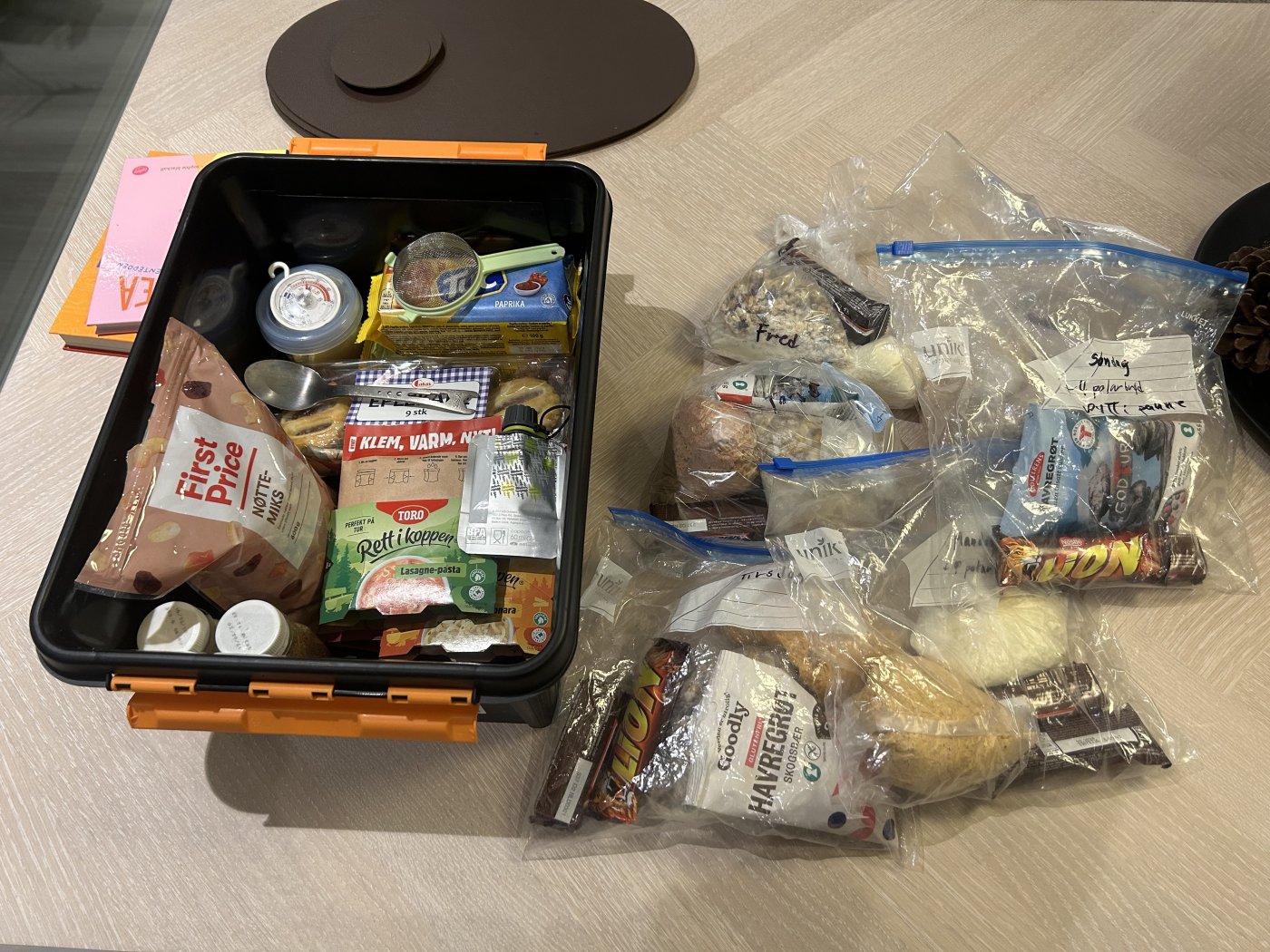 Gjør noe nytt med maten også, denne gangen. - De to første dagene blir det ferskmat til middag. Dvs. hamburger dag 1, pytt i panne dag 2. - Veksler mellom havregrøt m/babygrøt, og risgrøt til frokostene. Kan kokes, siden jeg har med dyp stekepanne. Så har jeg pakket litt annerledes. I posene er dagsrasjoner. Disse puttes ned i en pakkpose i rekkefølge. I den sorte kassen har jeg tilbehør som smør, kanel/sukker, salte kjeks, ett par rett i koppen, eplekake, og 600grams pose med nøtteblanding, pluss en reserve drytech, skje, kaffe, te, kakao etc. Jeg har plass til dagens rasjon i kassen, sammen med alt kjøkkentibehør, så da blir det forhåpentligvis enkelt å ha system på tingene- 68 svar