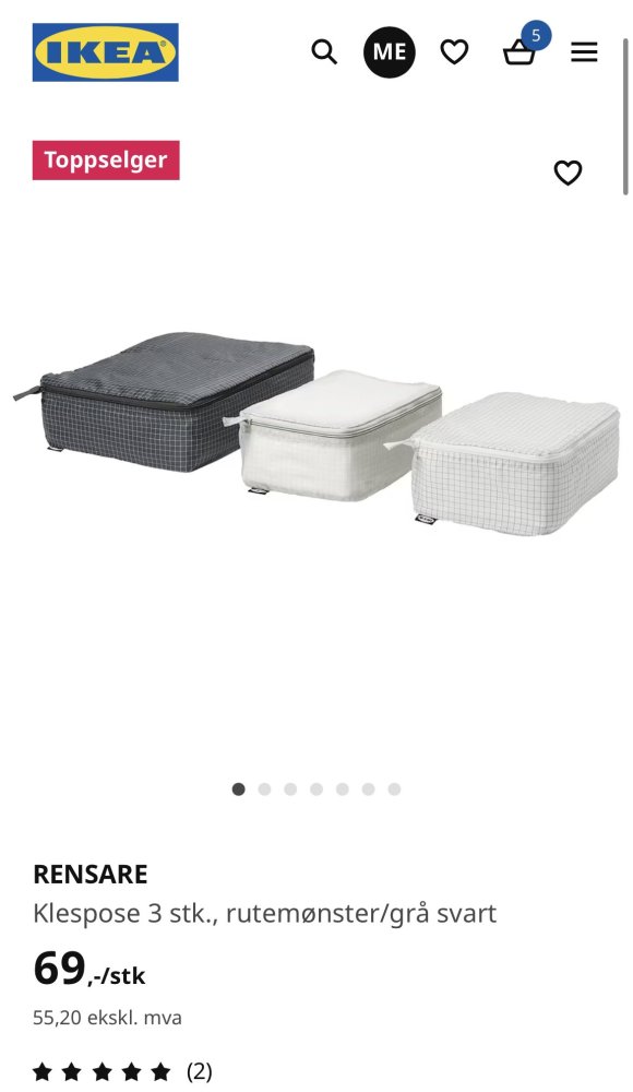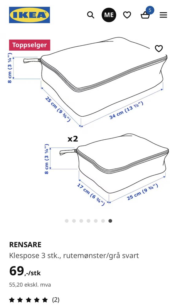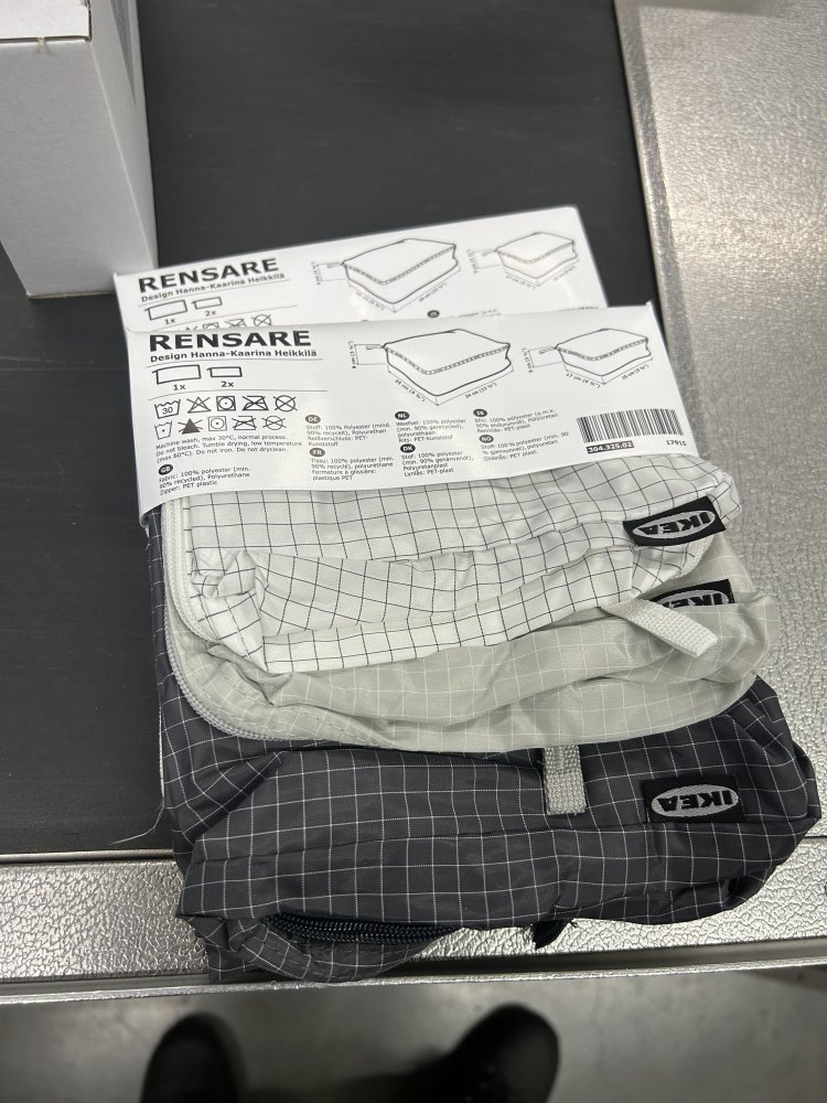 12. Pakkposer, firkantede. IKEA Rensare Artikkelnummer 304.325.02 Pris: 69kr for 3 stk. Dette er typen som er laget av tynt nylonstoff, så de er helt myke. Tilsvarer egentlig Exped sine «Mesh organiser», men står littegrann bedre av seg selv. De er lett i vekt, så man trenger ikke å bekymre seg for det. Helt geniale til å organisere ting i teltet, pulken og sekken. Men de er ikke vanntette. Link: https://www.ikea.com/no/no/p/rensare-klespose-3-stk-rutemonster-gra-svart-30432502/