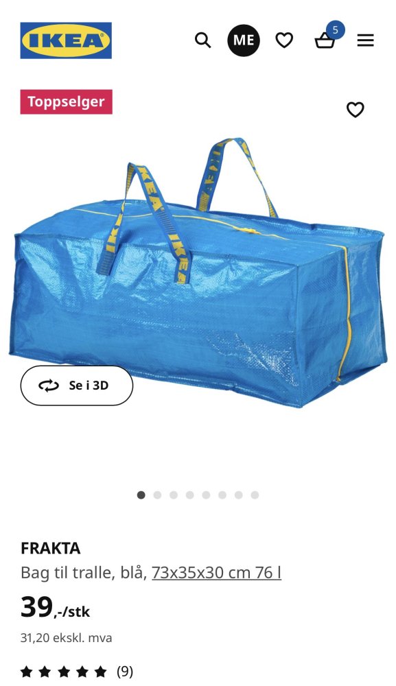 9. Transportbag til bruk på kajakktur (pakkes lett ned i lasterommet). Fungerer også fint som pulkbag. IKEA Frakta Artikkelnummer 172.283.40 Helt topp til alt mulig. Særlig på kajakkturer brukes disse til å frakte bagasjen når man tømmer skottene. De er tilnærmet vektløs. https://www.ikea.com/no/no/p/frakta-bag-stor-bla-17228340/