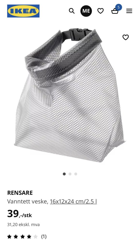 16. Mye av turutstyret vi bruker finner man svært gode alternativer til på IKEA. Til en brøkdel av prisen. Jeg synes ikke man skal kjøpe søppel, men det er mer enn god nok kvalitet på mye av varene fra IKEA. Det er så mange gode alternativer, at forhandleren fortjener en egen tråd tenker jeg. Særlig de som er ny innen friluftsliv kan spare veldig mye penger på å finne rimeligere, og like gode, alternativ utenom friluftbutikkene. Jeg fyrer i gang tråden med noen eksempler under. Legg gjerne inn deres egne IKEA tips i tråden Jo flere, jo bedre! Legg gjerne inn bilde, navn, kort beskrivelse, artikkelnummer, vekt hvis du vet og evt. link. (Linker utgår på dato, så nytten av linken forsvinner etter en stund).