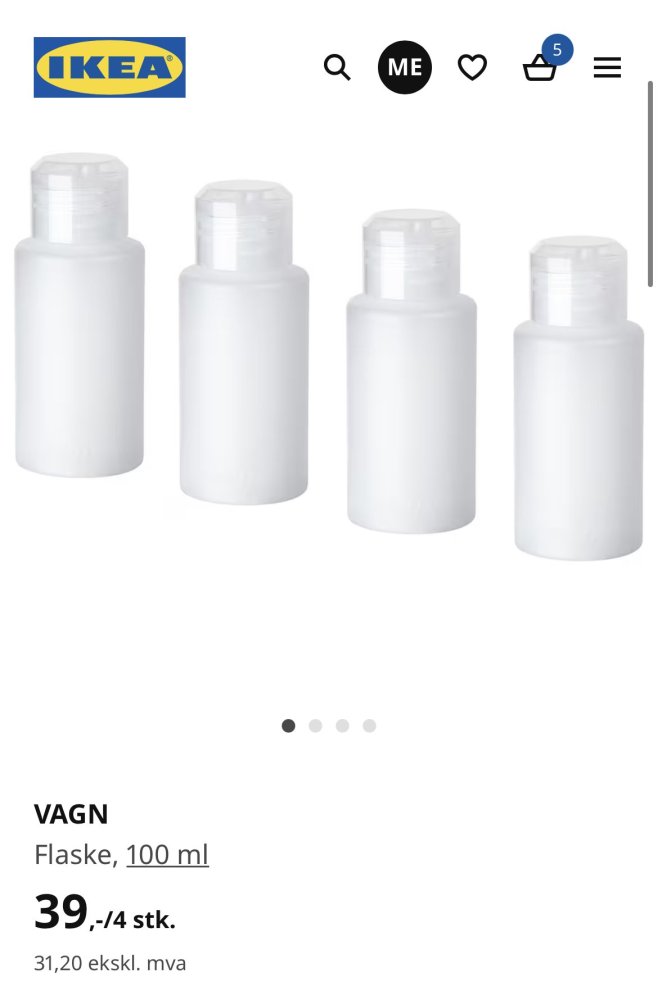 8. Flasker, 100ml. IKEA Vagn Artikkelnummer 505.188.92 Pris: 39kr for 4 stk. Flasker for rødsprit, solkrem, såpe, håndsprit, sukker, kanel, kaffepulver, krydder, ketchup, sennep, matolje etc. Disse har skrulokk, med flikklokk. Personlig synes jeg flikklokk kan være en risiko for at det åpnes i sekken, og man bør sjekke om de er tette. Man kan teipe/lime igjen flikklokket, og bruke skrulokket, om det er mest hensiktsmessig. Men flikklokk fungerer vanligvis helt fint. Link: https://www.ikea.com/no/no/p/vagn-flaske-50518892/