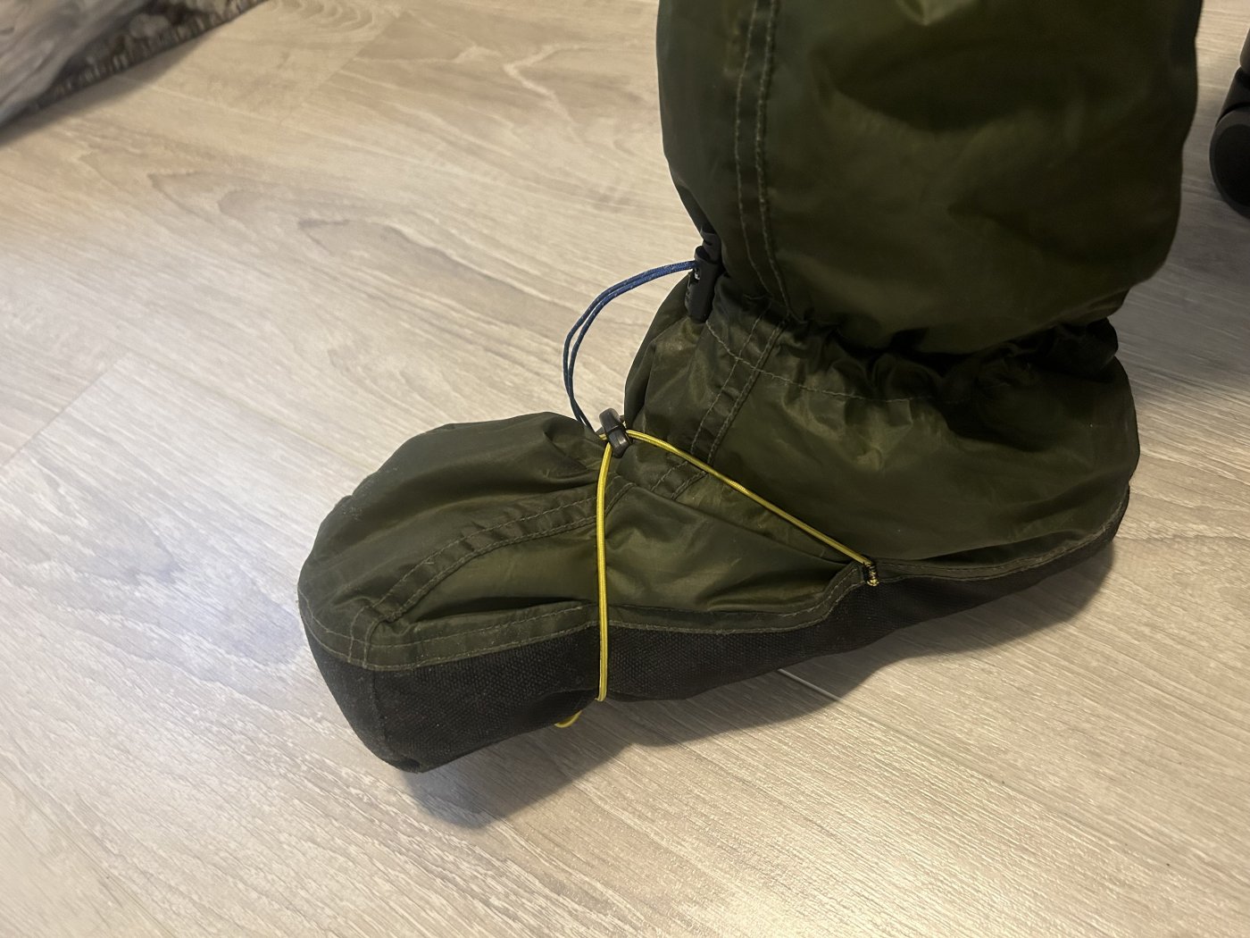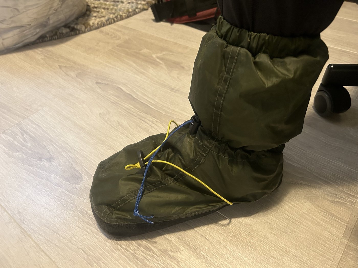 Helsport sine Bivuakksko veier 265 gram for paret, det er mer levelig å drasse på (De gule strikkene har jeg sydd på selv). Men disse western mountaineering booties (ikke expedition), virker også veldig bra. Virker lette og myke nok til å ha på nedi soveposen også, og da slipper man egentlig sokkeskift på helgeturer.