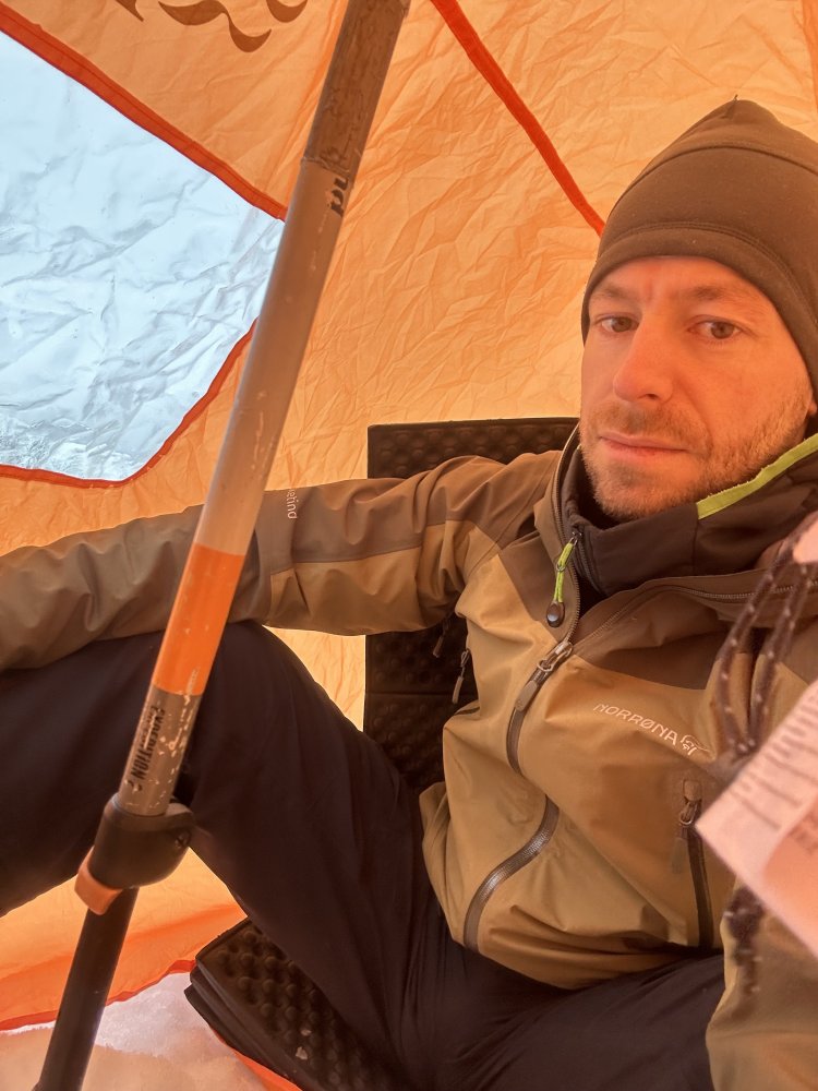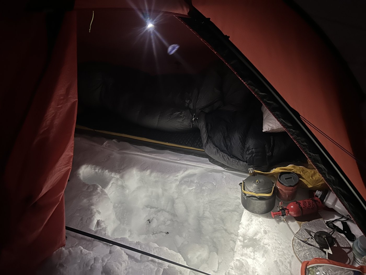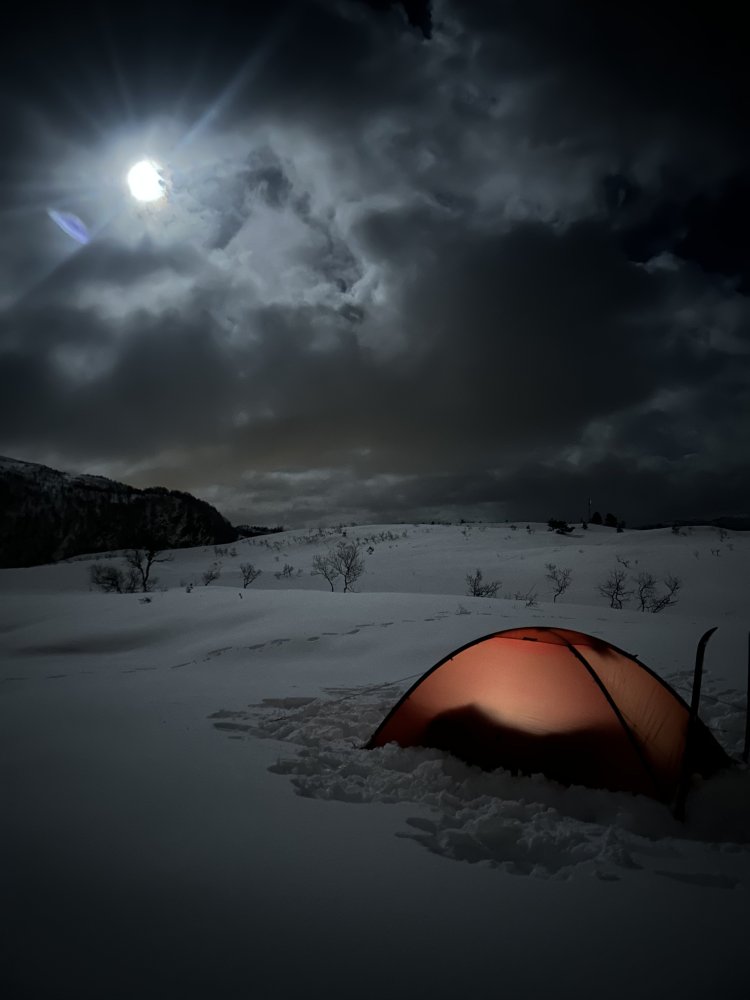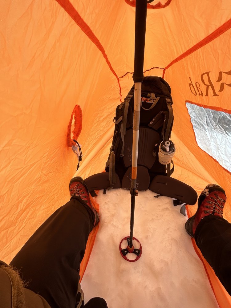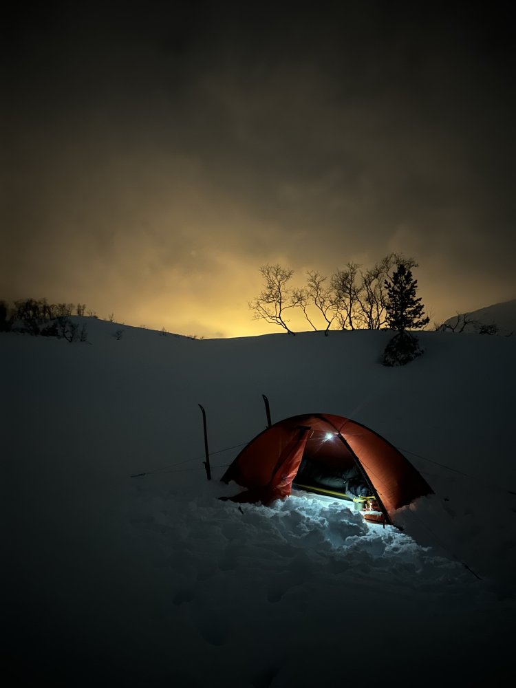 Tok meg en natt i fjellet. Snø og regn om hverandre. Ett par plussgrader. En veldig kort tur, men hensikten var å teste ut Unna uten innertelt på vinteren. Benyttet derfor selvsagt kjangsen til å teste ut (leke med?) 2-manns nødteltet. Jeg tok liggeunderlaget under rompen og opp langs ryggen, da ble det godt og varmt i ryggen. Og med ryggsekken som «person nummer 2» ble det lunt og trivelig inni der. Fullt mulig å ta av hansker og spise uten at man blir kald eller at ting blåser bort. Men det er ikke stort. To med atletisk kropp klarer fint å sitte der og spise lunch i le for elementene. Men to store karer bør gå for en større variant hvis den skal brukes til mer enn å redde livet. Å sitte sånn i timesvis blir vondt for korsryggen, så da er nok en liggevariant bedre. Jeg kunne tatt noken tak med spaden og gravd en liten fotgrop, og fått mer plass og bedre sittestilling. (I sterk vind vil det nok være en fordel med stramming nede. Det skal jeg sy på).