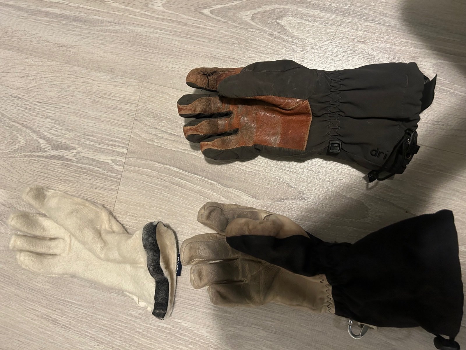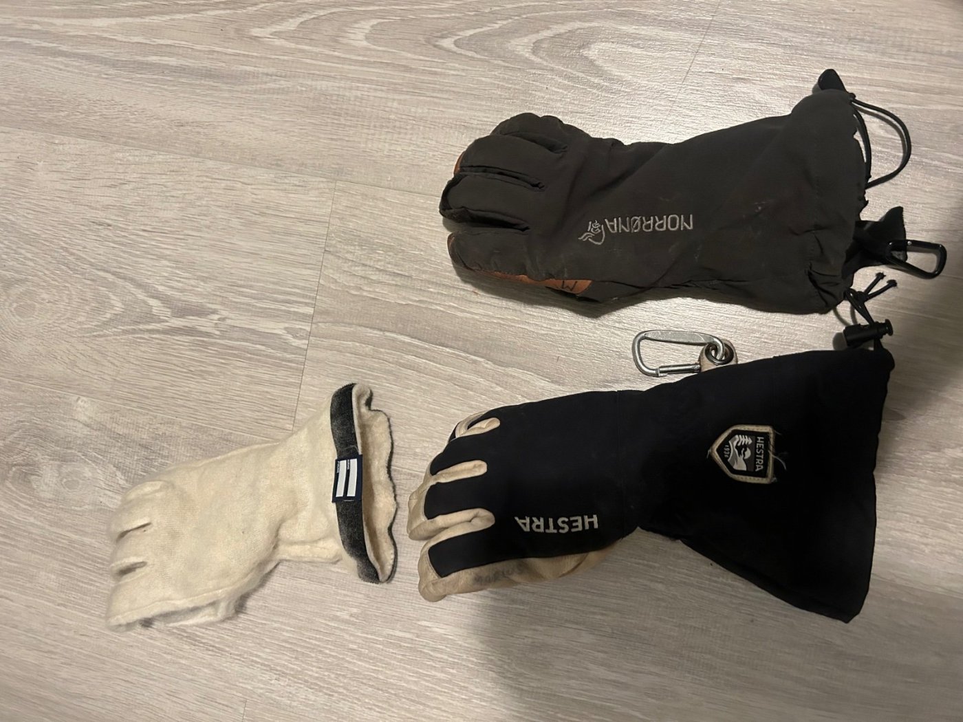 Mulig ett hanskesystem med en type langrennhanske (uten skinn som suger vann), pluss en tykkere hanske utenpå, og skallvott man kan trekke over? På den måten har man langrennshanskene og god fingerførlighet. Dette er også varmt nok når man er i høy aktivitet. På vei bortover/nedover, eller når det er kaldt, kan man ta hansken over uten å bli helt handicappet i hendene. Blir dette også for kaldt kan man dra over skallvottene, jeg pleier å ha snor på disse slik at de kan henge og slenge når jeg må regulere varmen eller gjøre ting som er vanskelig med votter. Jeg kjører liner innerst, hestra heli ski hansker med løst fór over, og skallvotter (ligger mest i lommen). Jeg vurderer å kutte ut liner og innnerhansken til fordel for en langrennshanske, og prøve modellen nevnt over i vinter. Jeg blir ofte svett på hendene på vei oppover, da er det digg med noe tynnere å gå med. EDIT: mine godt slitte trollveggen hansker passer inne Hestra Heli ski når jeg tar ut foret. Kanskje dette er en mer fleksibel løsning, trollveggen hanskene er ganske god fingerførlighet med, og ikke så alt for varme på vei oppover. Jeg kan prøve en løsning på hver hånd i vinter, og se hvordan det funker. Skallvottene som passer utenpå har jeg ikke avbildet.
