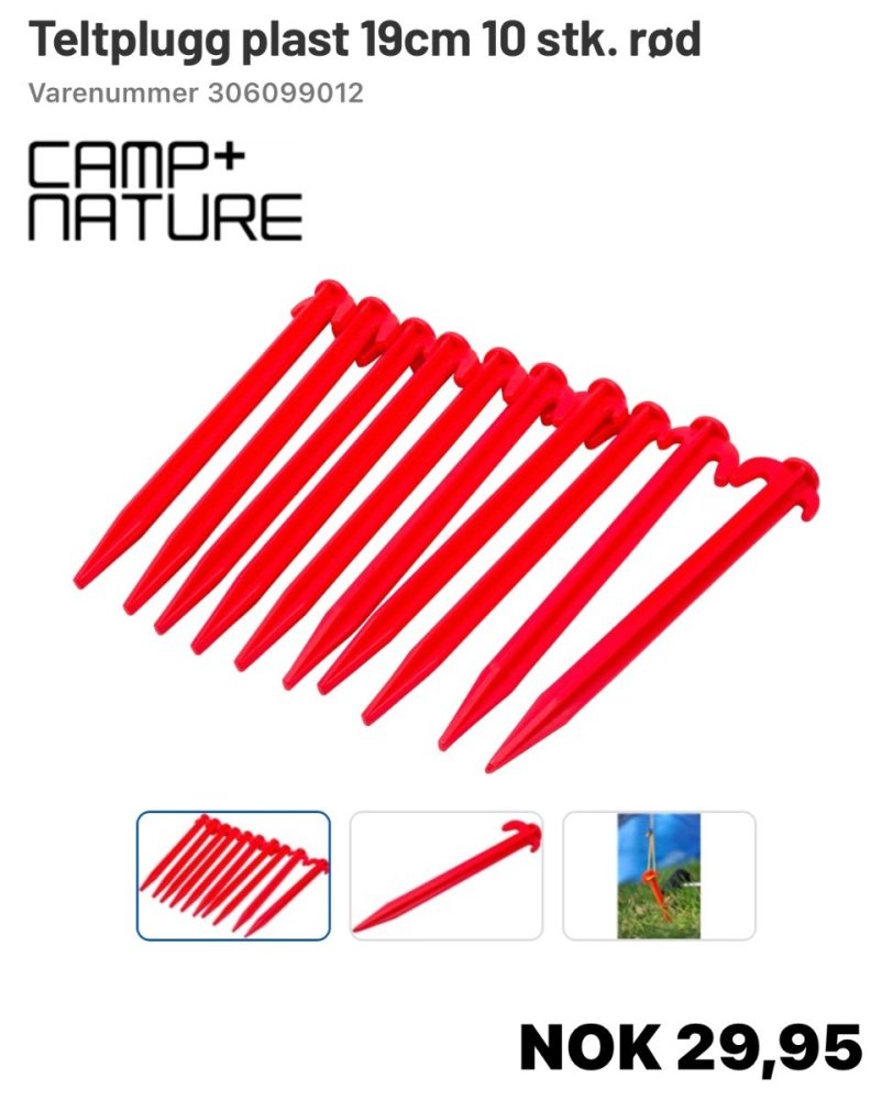 Forsåvidt enig. Det er sjeldent jeg har banket plugger nedi. Alltid trakket de nedi, og jeg har aldri bøyd eller brukket en vanlig-kvalitet metallplugg på den måten. Det er kun på tur med campingvognen jeg banker ned plugger, fordi det er mykere plastplugger. De plastpluggene til forteltet er forsåvidt lengre enn en vanlig telplugg, men av en solid og myk plasttype som gjør at de veier omtrent det samme. De bøyer seg og finner veien mellom steiner og pukk, men blir jo utslitt etter mange nok møter med stein. Ser for meg at til basecamp-bruk, store lavvoer og denslags, er dette godt egnet, siden de holder mye bedre enn vanlige friluftsplugger. Jeg bruker en pluggutdrager. 13 gram stk, under 3kr stk.