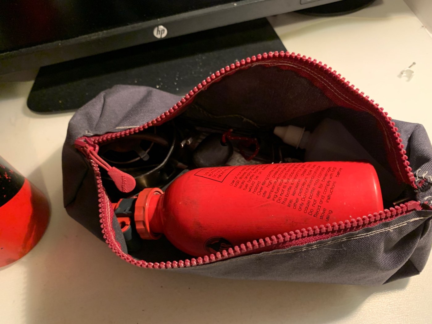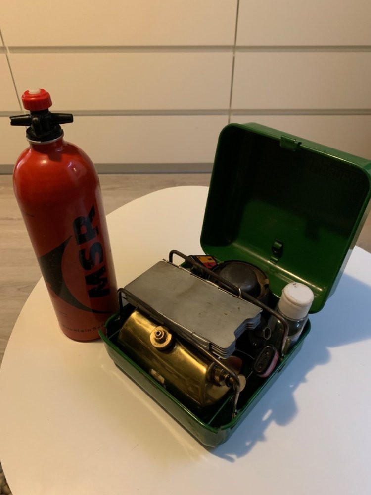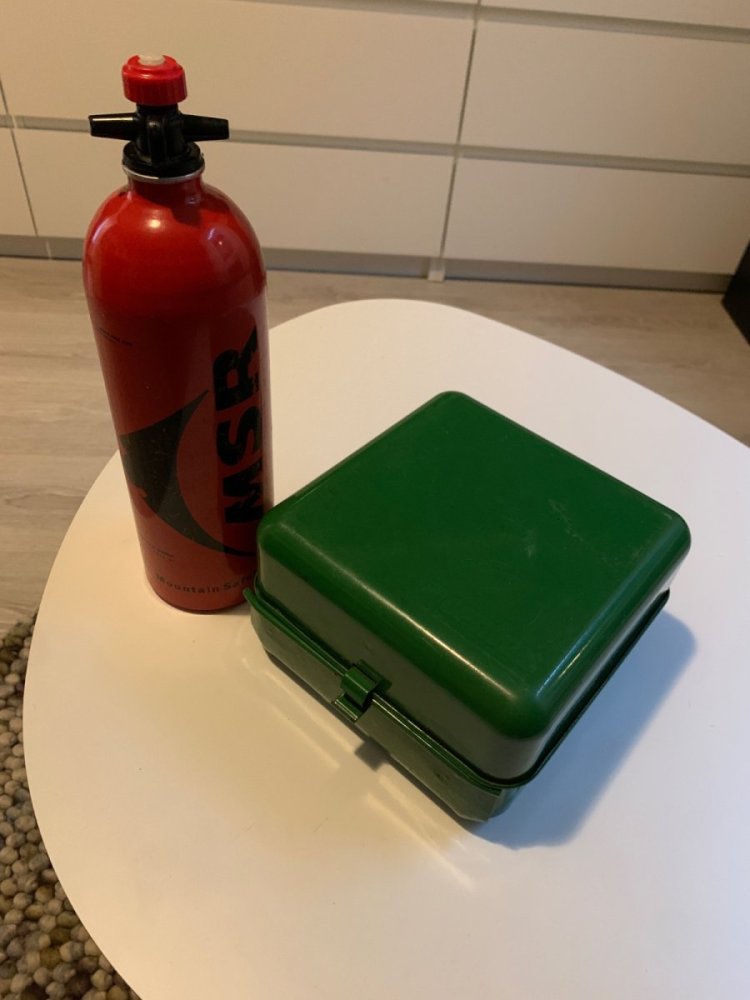 23. Ser ut som ett bra opplegg dette. Jeg har noe lignende, ett gammelt patent som tar mye mindre plass, tåler betydelig mer og har stillebrenner som går på bensin og parafin på samme dyse. (Har tilsvarende med bråkebrenner, men vinterstid er stillebrenner fint i teltet synes jeg). Dette kan trakkes på uten at noe blir ødelagt. I kassen er vindskjerm, to lightere (evt. tennstål, 2 dl rødsprit (bruker litt over 1/2 dl i uken til forvarming). Trangiatut til sølefri tankfylling, passer MSR flasker og traniaflasker mm.