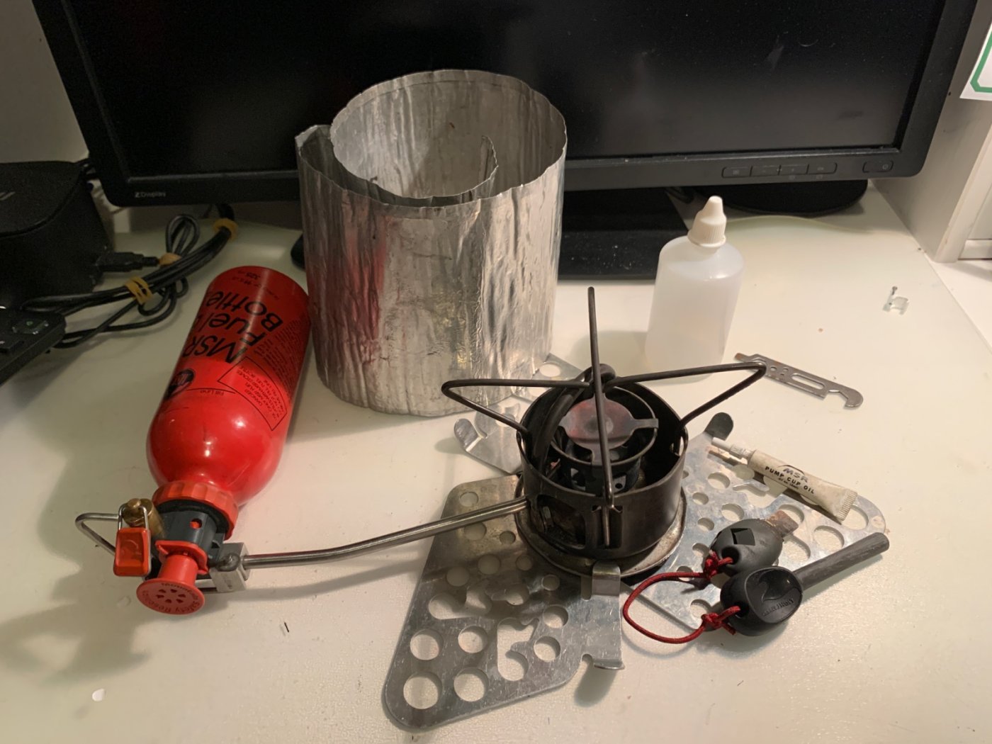 22. du har jo en XGKII, og da klarer man seg med bare en sammenleggbar trillium base på 80 gram. Da flytter man omkring ved å holde i flasken, det fungerer ypperlig. Synker ikke ned i snøen, og sklir ikke avgårde (kun flaksen er glatt). Det blir ett kompakt oppsett, jeg sydde meg ett penal en en gammel parkdress. Fyrer man med denne i innerteltet oppå ett skumunderlag blir det litt varmt midt under brenneren. Jeg har fått noen svake merker på ett skumunderlag når den stod på ett slikt hele kvelden uten å flyttes. Flytt litt av og til, eller brett og legg vindskjermen under, eller ett kjelelokk under, om den skal stå på samme sted oppå ett skumunderlag lenge.