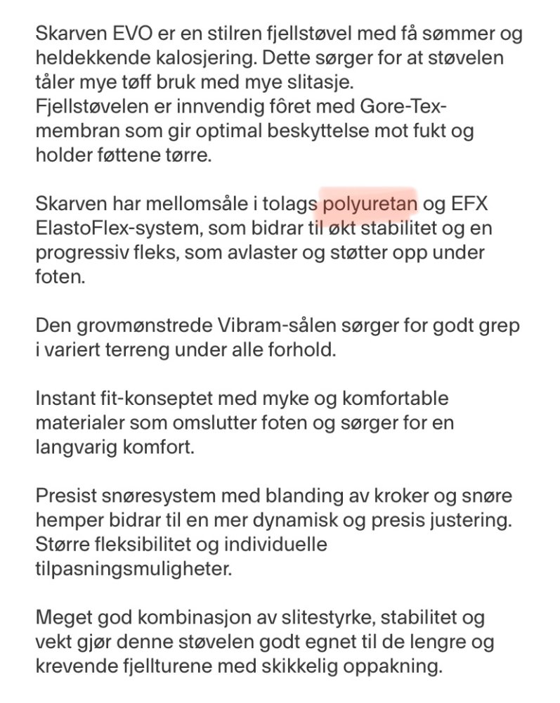 Mange kurante støvler har mellomsåle i PU. Eks Crispi Skarven EVO: PU er jo det beste materialet for de som bruker støvlene mye. Holder dempeegenskapene bedre enn EVA, som mister dempeegenskapene raskere. Ulempen er at dersom de blir pent brukt dør PU av alderdom før skoen er utslitt. Nyttig å vite, synes jeg.