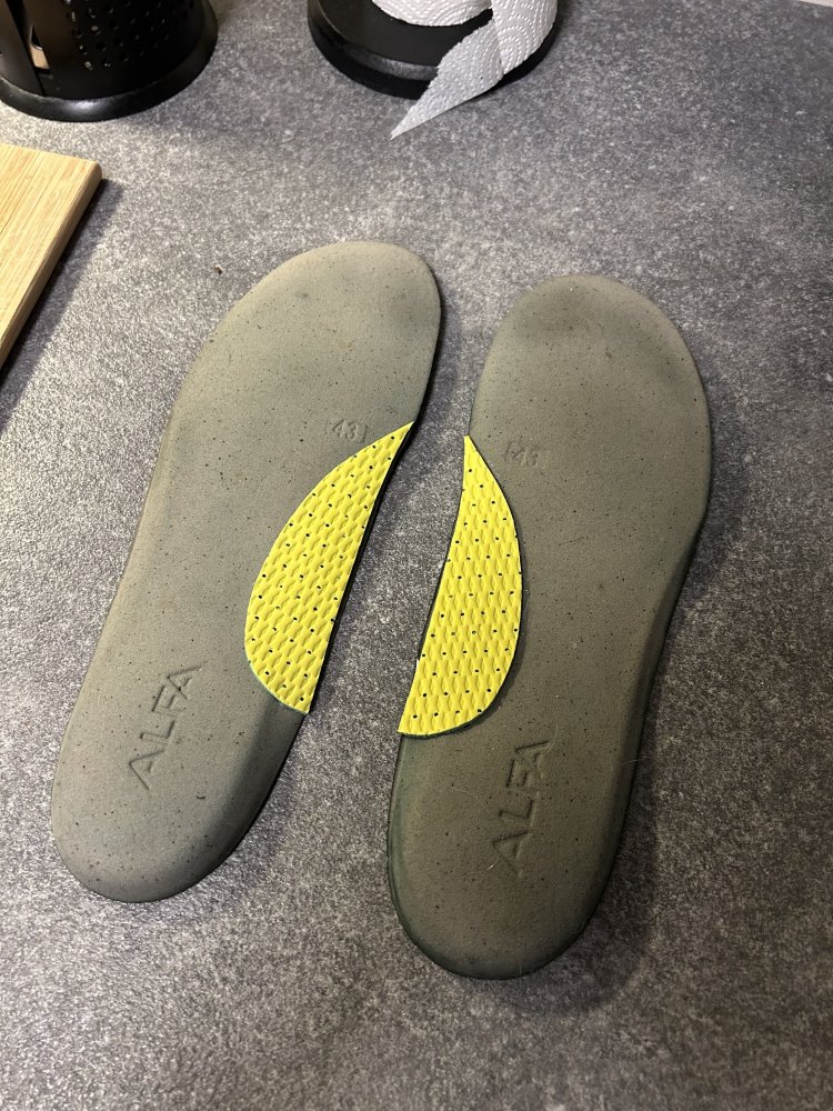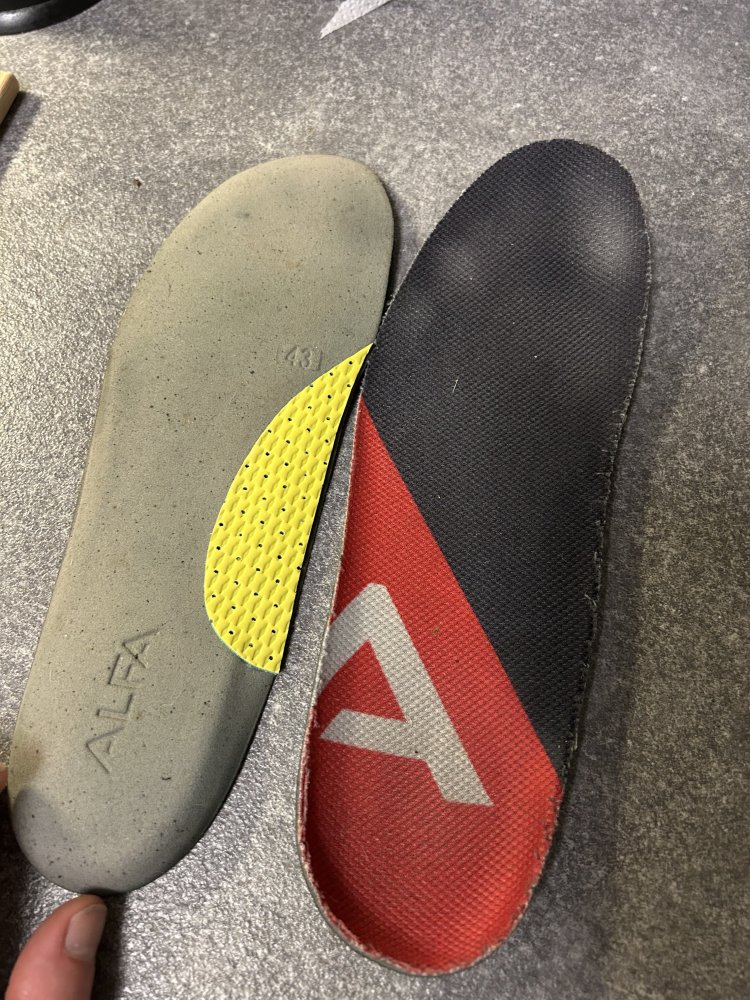 Det har vært noen innlegg om sko i det siste, på forumet. Jeg tenkte å bidra litt slik at sommerens turer kan bli bedre for noen Gode sko kan være ukomfortable om fotsengen ikke passer foten. Særlig på lange turer. Den vanligste måten å ordne dette på er ved hjelp av å kjøpe nye innleggssåler i butikken, bruke varmetilpassede såler, eller få laget ortopediske såler. Jeg har mange par av disse typene, men det blir aldri helt perfekt. Det som går igjen er: - Formen blir ikke helt 100% slik jeg vil. - De er ofte veldig harde. - De bygger ofte for mye i skoen. - De er dyre. - Etc. Noe jeg har bedre erfaring med, som alltid fungerer, er å lage mine egne. Fordelene med dette er: - Veldig billig. - Formen blir 100% slik jeg vil. - Kan tilpasses hver sko individuelt. Man slipper samtidig å skifte såler mellom skoene. Hver sko får sin såle. - Fotsengen blir myk og komfortabel, også på lange turer. - Veier lite. - Bygger lite, så dette kan gjøre i alle sko. Også dresskoene For min del er det så enkelt som at jeg ønsker litt mer myk og behagelig fotbuestøtte. Dette hjelper i tillegg mot overpronasjon. Jeg kjøper derfor noen billige skumsåler, eller tar noen gamle skumsålepar fra utslitte sko, og klipper til fotbuestøtte som limes/teipes under den originale medfølgende skosålen. Er det en volumiøs sko, kan man legge denne nye sålen oppå den gamle for å få en tettere passform i skoen (eks. i Alfa Walk King og M77 har jeg doble såler). I noen sko limer jeg flere lag med fotbuestøtte, og da blir påfølgende lapp gjerne mindre enn den første. Tilpasses akkurat slik man vil, med lapper der man føler for selv i den aktuelle skoen. Min favoritt er skumsåler. De er lette, myke, gir demping, og er permable slik at det ikke blir like klamt i skoen som ved bruk av tette gel-såler. Alfa sine standard såler synes jeg passer det meste om man skal erstatte den originale innleggsålen helt. Som lapper man limer under, kan hva som helst av mykt materiale brukes. Bildeeksempelet er fra en fjellstøvel jeg bare ønsker litt mer fotbuestøtte, og bruker derfor en bit fra en tynn gul skumsåle jeg hadde liggende. Lykke til-