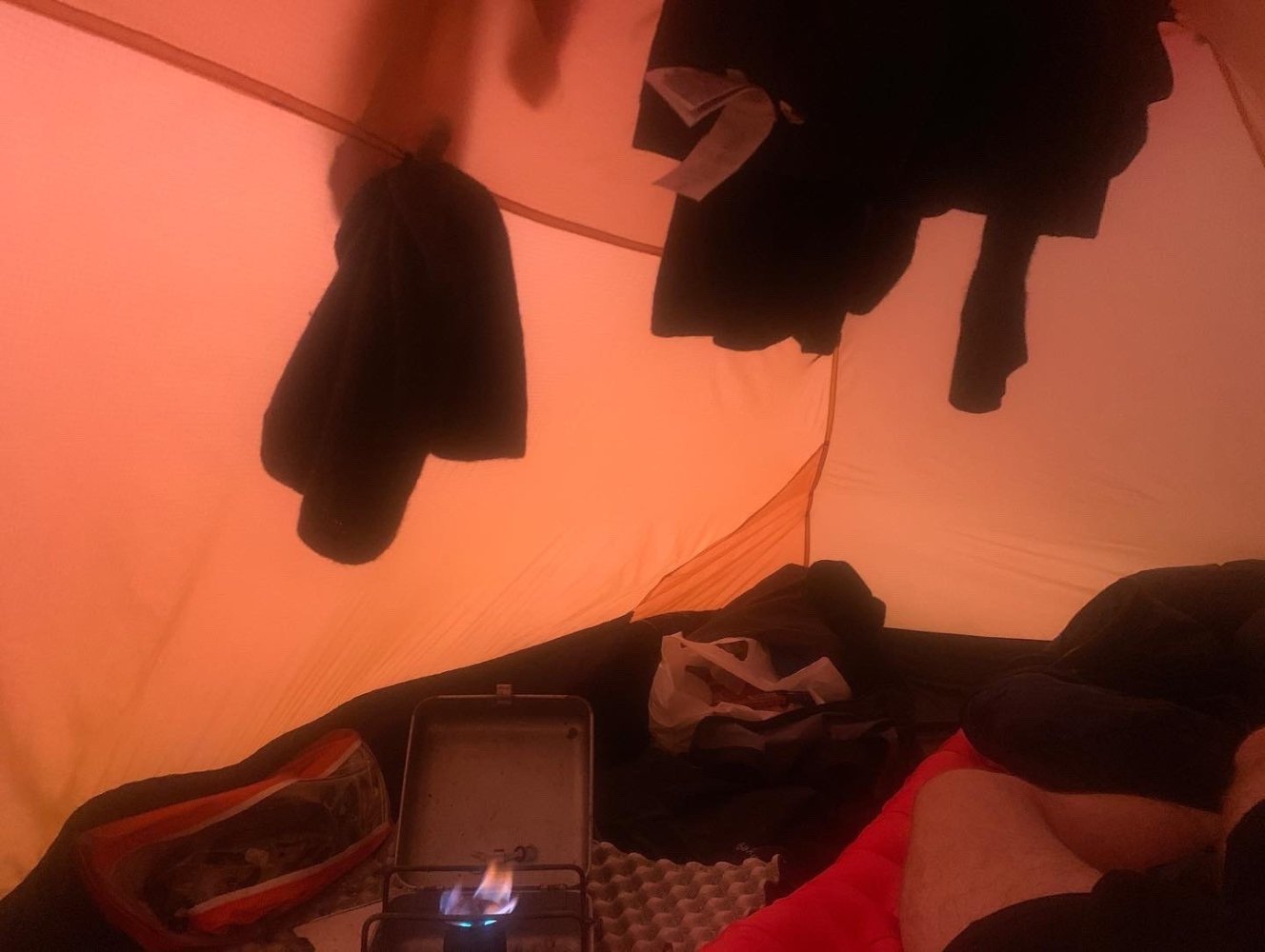 Å komme seg opp i knestående i fotenden på ett lavt tunneltelt er ingen selvfølge når man sklir rundt på underlaget og teltbunnen i ett stappfullt telt i panikk. Det er gjerne i andre enden det begynner å brenne. Man må ta høyde for dårlig arbeidsstilling om man baserer redningen sin på kniv. Men samma kan det være - regner med du skjønte poenget, det trengte egentlig ikke noe svar. På lange turer i dårlig vær er det liksom ikke mye alternativ til å fyre i teltet om man skal ha en noenlunde behagelig tur. Med søkkvåte klær, uvær ute og det eneste tørre og varme stedet er i soveposen, så blir det fyring i lukket innertelt med lufting for min del. Hilleberg Unna er ikke det største, men det går: Så får det heller være med at det er farlig. Jeg kjører heldigvis ikke motorsykkel, det er jo ekstremsport sammenlignet med dette…- 243 svar
