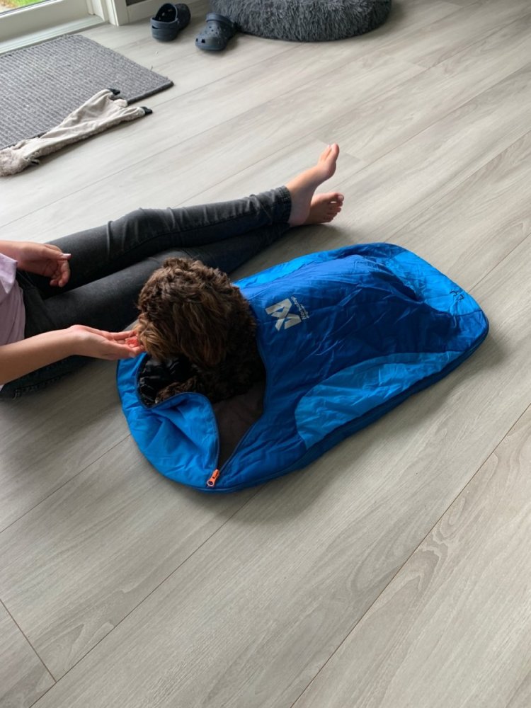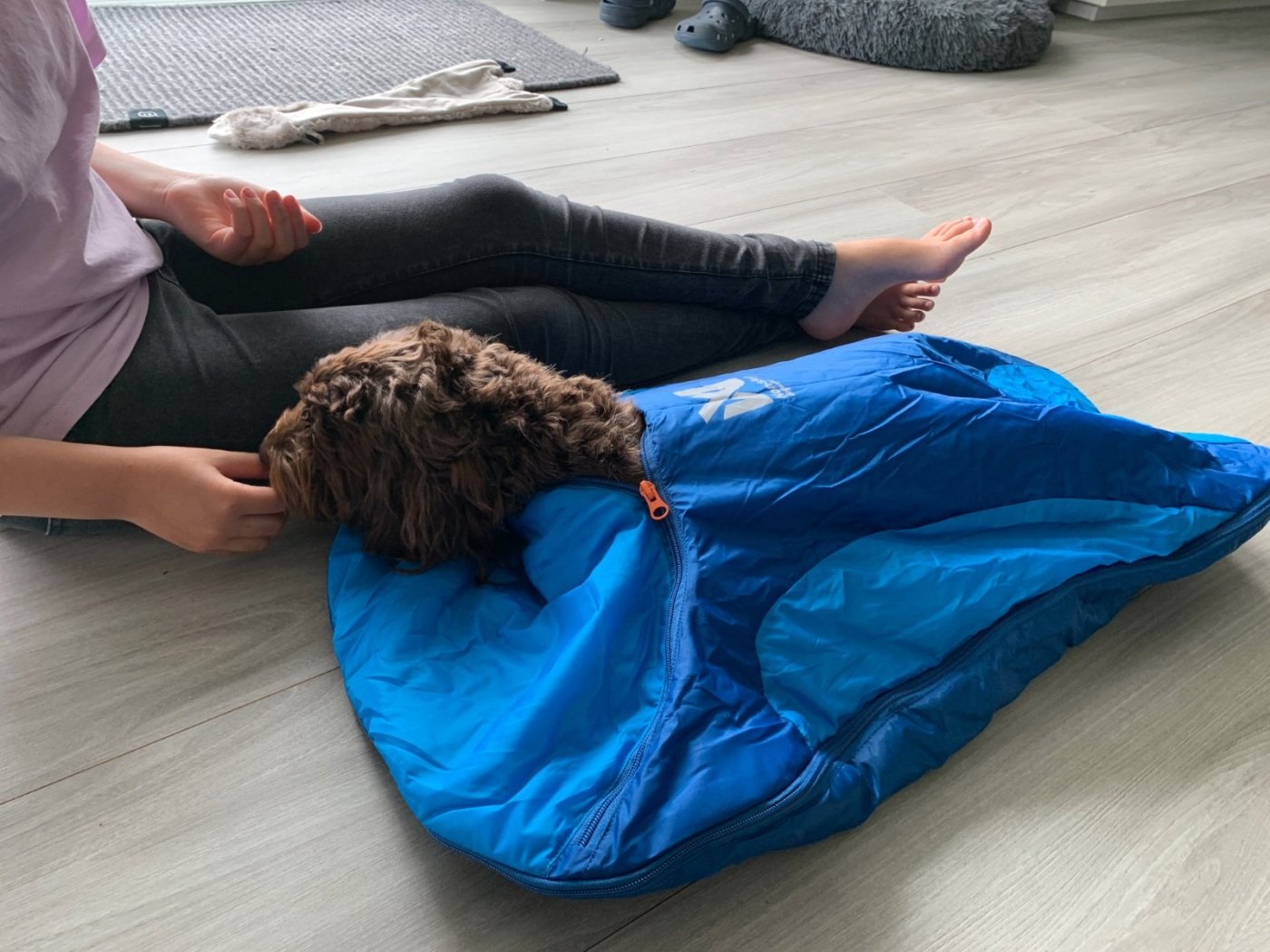 Jeg synes denne hvileposen fra Non stop virker bra. Glidelås rundt hele veien, og den har åpning i både front og hekk, og kan lukkes rundt halsen på hunden om man vil. Fulgte med kompresjonspose, og størrelse S tar kun plassen til en liten vannflaske i sekken. Vi øver litt: