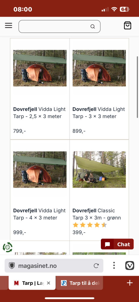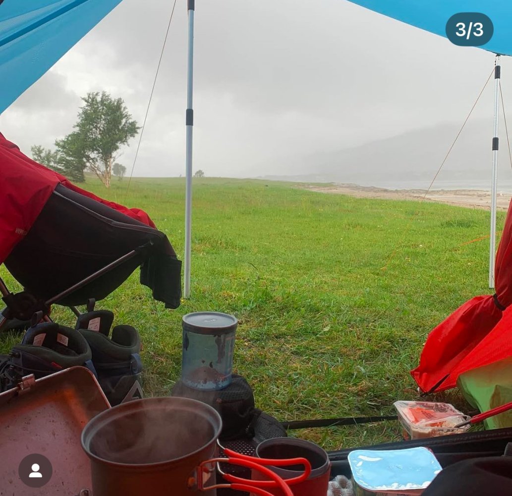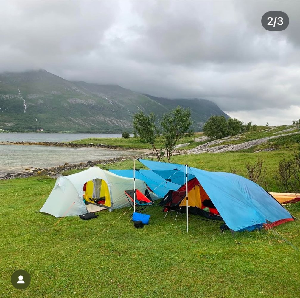 For å illustrere hva jeg mener. På bildene pisker vinden og regnet bakfra, mens vi sitter i stolene utenfor teltet og har taco-fredag: (Kort video med lyd av vind og regn). https://www.instagram.com/p/Cf9q1C7M7i1/?igsh=MWk3c2tkZjRkMWw4cw== Men bare en tarp, uten et telt, stein eller stokk mot vinden, blir tarpen trykket med mot bakken av vinden, eller det blir av andre grunner ikke optimalt.