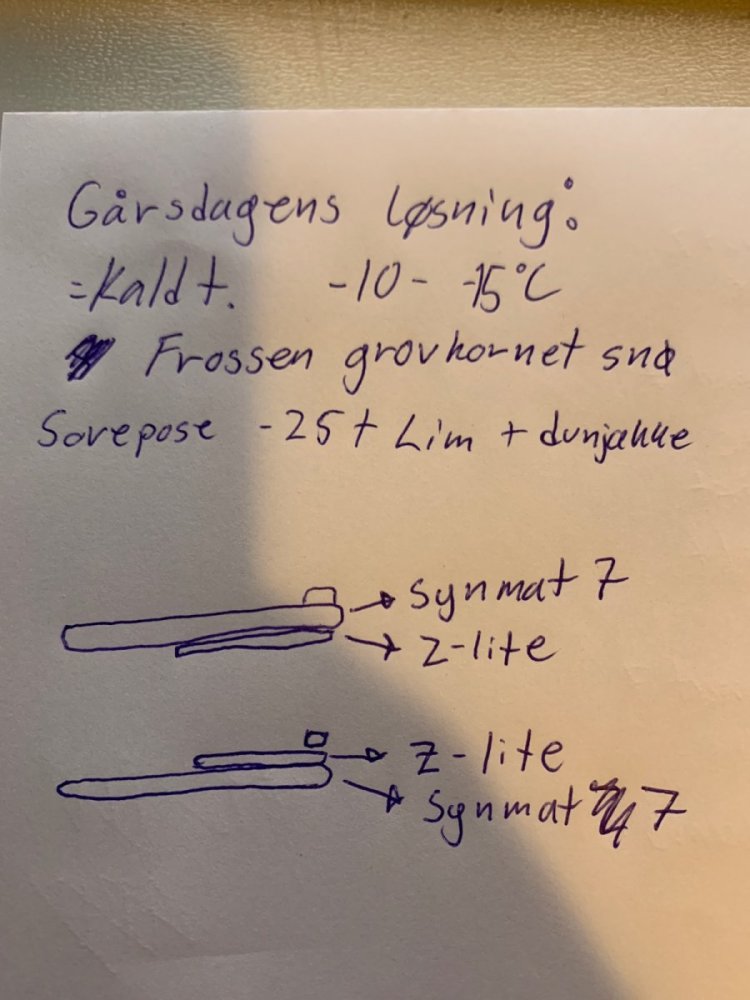 Faktisk, dette er noe jeg lurer på etter gårsdagen. Fordi at jeg merket jeg ble litt hustrig ila natten, og det var trolig -10C (helt sikkert ikke kaldere enn -15C). Helt tørr, ulltøy, dunjakke, luffer på bena, lue, etc. Jeg kjente ikke kulden, og det var varmt i posen, men jeg våknet allikevel noen ganger av at jeg frøs. Når jeg tok hånden på ryggen og spesielt rompen kjente jeg at huden ned mot bakken var kald. Skiftet da om og la skumunderlaget øverst, men ingen forskjell. Jeg blåser opp luftunderlag godt, jeg liker harde senger. Jeg sov på frossen bakke dekket med steinhard grovkornet frossen snø, jeg har opplevd det samme når jeg har sovet på en bunnfrossen betongkai, men jeg kan ikke huske at det samme har skjedd på tørr vintersnø på hardangervidda i -30C. Gårsdagens liggeunderlagsløsning var dermed for kald: Spørsmålet blir da egentlig: 1: Ville alternativ A blitt noe varmere? Blir det luft konveksjon i underlaget som gjør at varmen fra rompe/rygg transporteres mot føttene i underlaget og stikker av mot bakken? (Det hjalp ikke å ta skumunderlaget oppå, så kanskje det ikke er poeng i å ha lagt skumunderlag? 2: Hva tror dere er varmest av alternativ A og B? 3: Når det gjelder alternativ C, tror dere at det vil ha mye for seg å ta med en bamse i fullengde, eller tenker dere at den halv-lengde bamsen vil gjøre det meste av nytten? ( @Terka , @Tessatroll , @Espen Ørud eller noen andre, har kanskje prøvd ut noe av dette på sine vinterturer? ) -