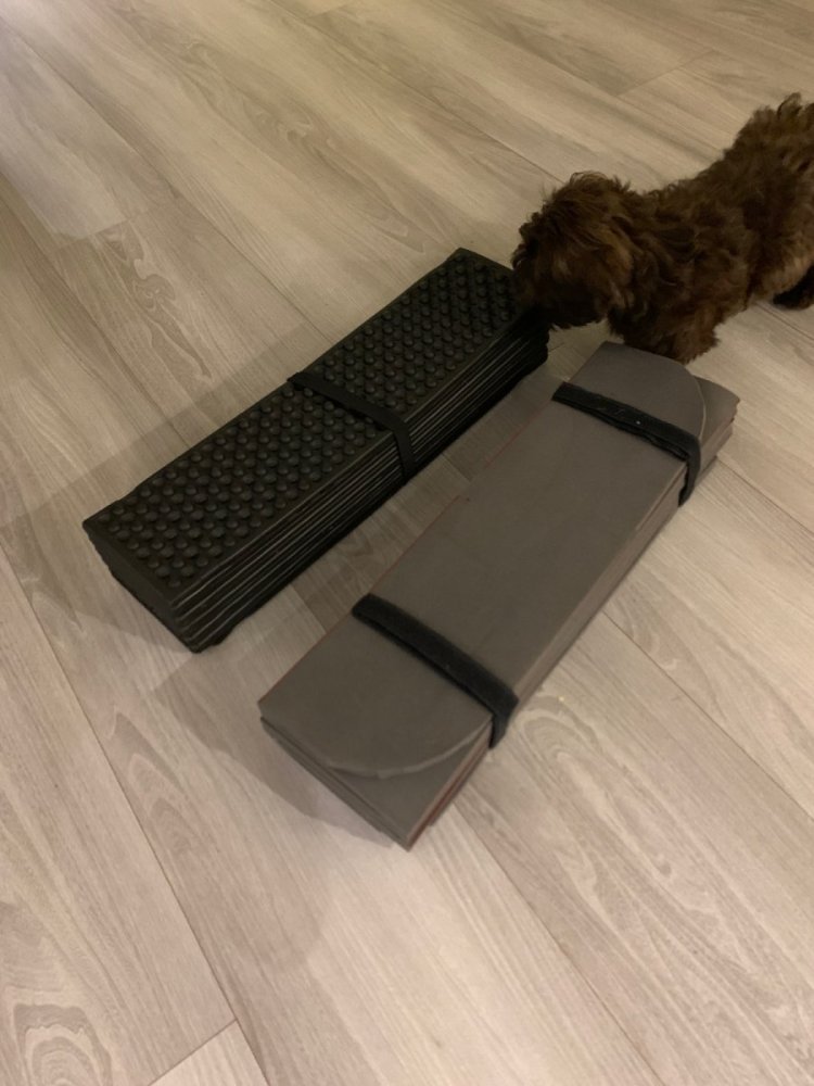Takk Det er en Bichon Havanais tispe, ca 4 mnd gammel nå Jeg har kuttet bamsen nesten helt igjennnom i brettene vha tapetkniv, det er en mm igjen. Teipen er fra byggvaren, og lå temperert for å hefte best mulig. Den er knallsterk, vannbestandig og kuldebestandig så om man kutter helt gjennom bamsen gjør det nok ingenting. Paraktisk test på gulvet viser at det fungerer helt ypperlig 👍 Så planen nå er å ha det tynne svarte brettbare Urberg som overmadrass på synmaten, det føles komfortabelt ut. Bamsen som rekker fra nakken og ned til midt på lårene legges under synmaten. Blir ikke det varmt nok, så gir jeg opp😅 -