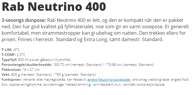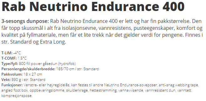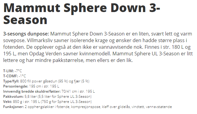 Hei forum (mitt første innlegg). Etter mange timer med godt lesestoff av mange kunnskapsrike mennesker må jeg legge ut mitt første spørsmål selv:) Jeg har aldri eid en dun sovepose før. Har allerede to (ja, kanskje overkill) syntetiske vinterposer av typene: Mammut - TYIN MTI Winter Bison , -18°C (står kun det, antar det er Tlim) , 36x33 cm pakkvolum , 2520 gram , "vanntett" fotende og hodet. og Mountain Hardwear - Lamina Z, Blaze (reg) , T-lim: -26°C , 34x29 cm pakkvolum , 2380 gram For en 3-sesongs pose er det kanskje greit å gå ned på volum i sekken fremfor en "støtsikker" fiberpose? (Ellers hadde jeg vurdert bl.a. Mountain Hardwear Hyperlamina Flame) Da har jeg kommet frem til 3 stk: Mountain Equipment Helium 400, Mammut Sphere Down 3-season, Rab Neutrino 400 (evt Rab Neutrino Endurance 400?) Jeg er selv rundt 70 kg , 178 høy og atletisk slank. Det gjør ingenting om noen tenker at disse posene kan bli litt kalde på netter der gradestokken går mot blå. Jeg har også en lakenpose av typen Sea To Summit Extreme +15°C på 390 gram dersom jeg ser behovet. Legger ved det test.no skriver om posene.. Gi gjerne tips, råd eller del erfaring på dunposer vs fiberposer. Er spesielt intrs i å høre erfaringer på det som blir skrevet om Mammut Sphere Down 3 sesongs posen. Er den dårlig på å holde fukt og vann ute? Liker veldig godt Rab Neutrino posen da den har hydrofob gåsedun. Også, er Endurance versjonen av Rab posen verdt de ekstra pengene?