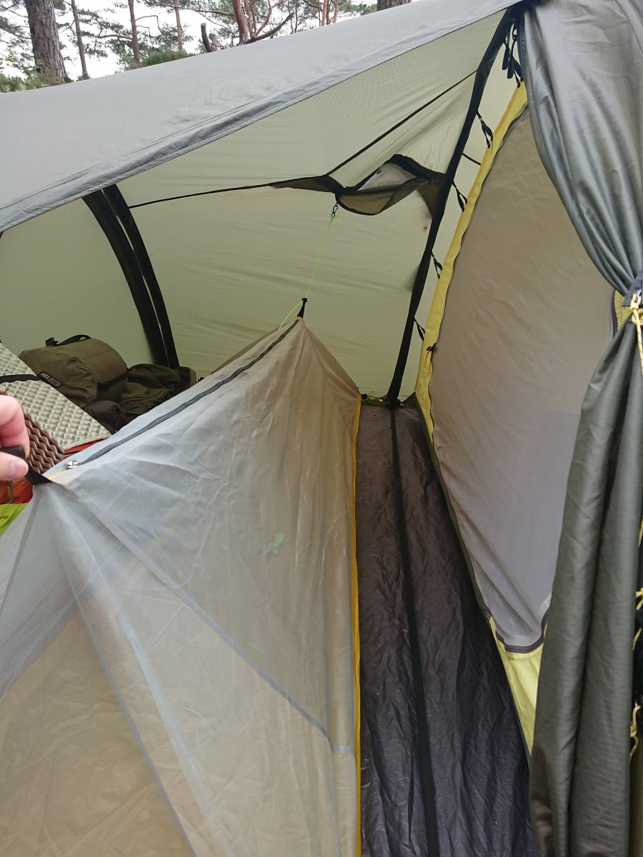 Vi er fem i familien og pleier å ha med oss en 4-mannstelt på tur som vi kombinerer med et 2-mannstelt og/eller hengekøyer. Av og til passer det best å sove alle i et telt, så jeg har laget et lite gjesterom til meg i forteltet på 4-mannsteltet. Et lite myggtelt fra e-bay, litt strikk og noen karabinkroker ble til en enkel løsning som kan strekks ut og festes på kvelden. Det er ikke veldig romslig, men tett for insekter. Det kostet ca 200,- og veier ca 300g tilsammen. Kanskje ikke noe for en uke i strekk, men for en natt eller to fungerer det helt fint. Noen andre som har erfaring med tilsvarende løsninger?