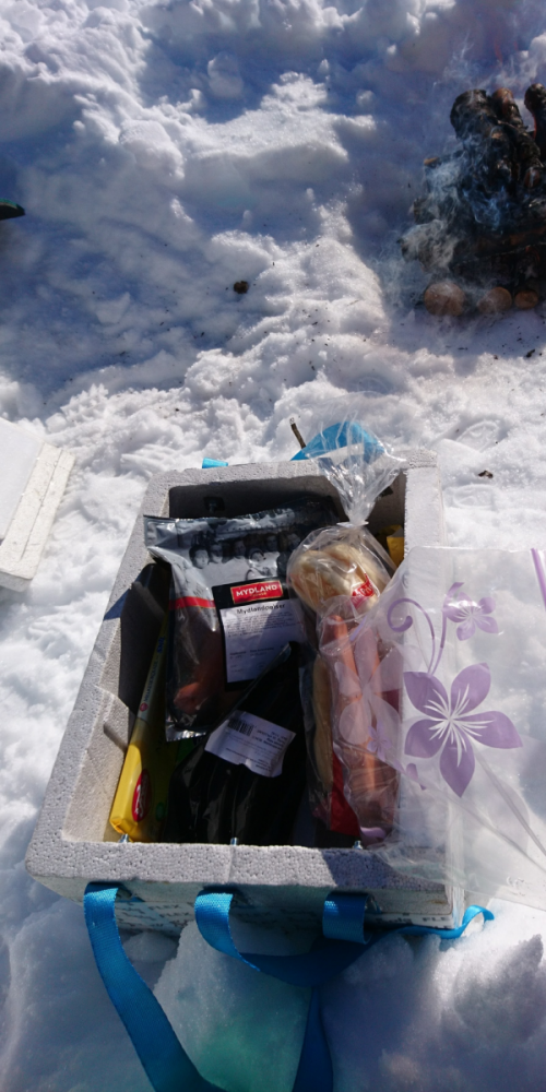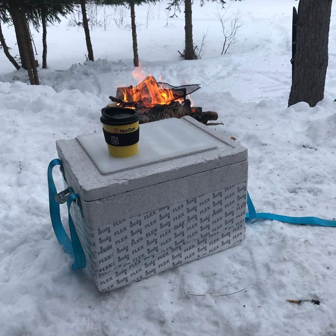Har laget to matkasser av isopor. Klyvd en 40x60cm isoporkasse fra cateringfirma. Limt på 3cm isopor på ene siden, tapet den med vannfast teip. Laget håndtak og låsing. Limt på en skjærefjøl. Har jeg bord i teltet. Genial til mat, pils, batteri og slikt. Pleier om morgenen og kvelden å legge i lunkene vannflasker i kassen. Holder pluss hele døgnet.
