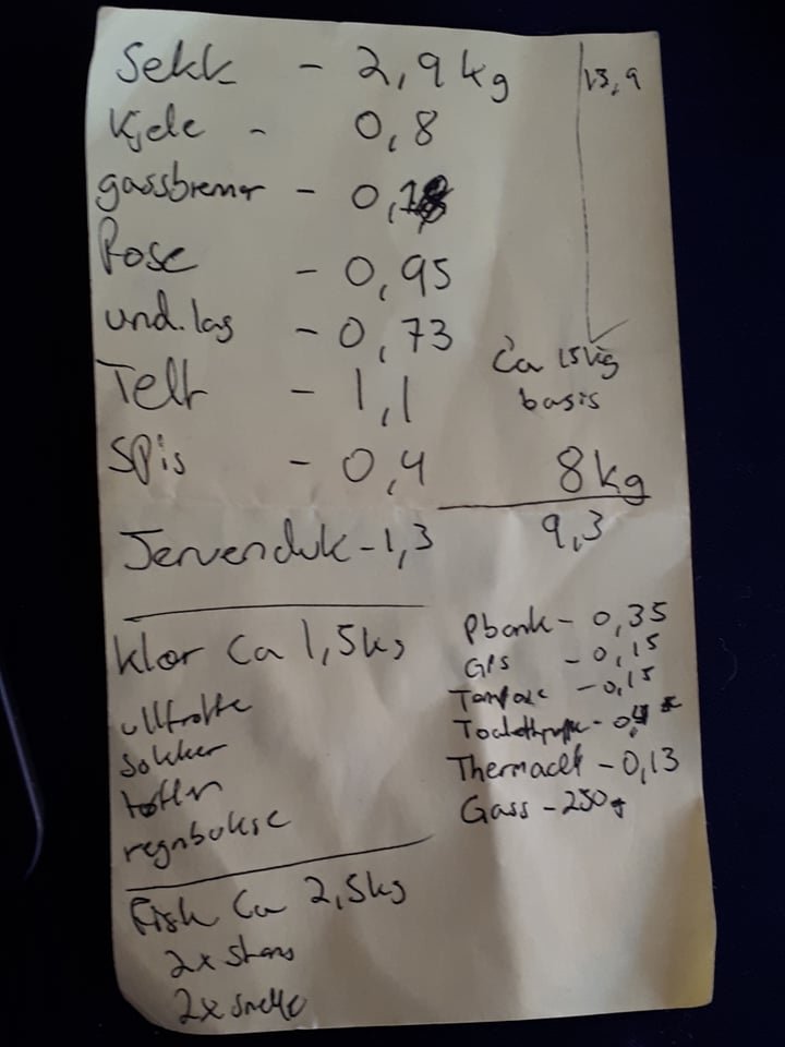Hei. Nettopp gjennomført en 3 dagers tur i fjellheimen her i Nord med en kompis. Til begges overraskelse veide sekkene over 21kg. Vi hadde selvfølgelig med mye komfort (Cognac og bok😀), men trudde ikke det skulle bli så tungt likevel. Fant fram penn og papir å fant ut av selve basisutstyret (telt, sekk, kokkeleringsutstyr, sovepose, klær, fiskeutstyr, orienteringsutstyr o.l) kom på rundt 15 kg, med utstyr jeg egentlig trudde skulle være lett. Lurer på om jeg på sikt skal erstatte mye med utstyr, omså bare noen hundre gram lettere, for å få ned totalvekten.