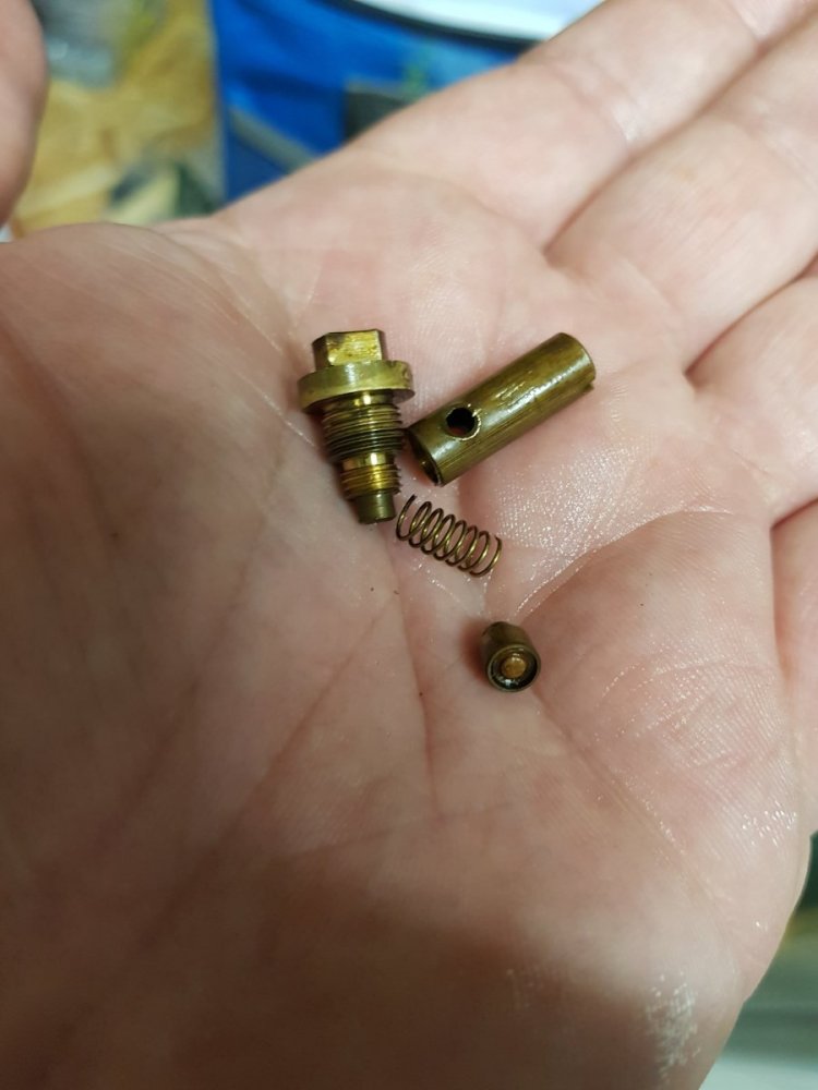 7. Så.... Da har vi fått ut ventilen i pumpehuset 😊 Det løste seg med et kobberrør som jeg klemte litt flat i den ene enden. Regnet med at kobberet gav seg før messingskruen. Men.... er ventilen til å "dele opp" ytterligere? Synes jeg skimter ei fjær inni der 😊 Mvh Yngve