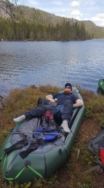 Ettersom båten jeg har er litt stor, blir den hakket for stor til å ha på sekken oppblåst og for stor til å kunne rulle sammen og ha på sekken (hadde 25kg-oppakning og stor sekk). Det fungerte i enkelte tilfeller, men var rimelig heavy. Nå som jeg har testet båten over litt tid sitter jeg faktisk med tanken om å kjøpe en liten solo-variant i tillegg... 😄