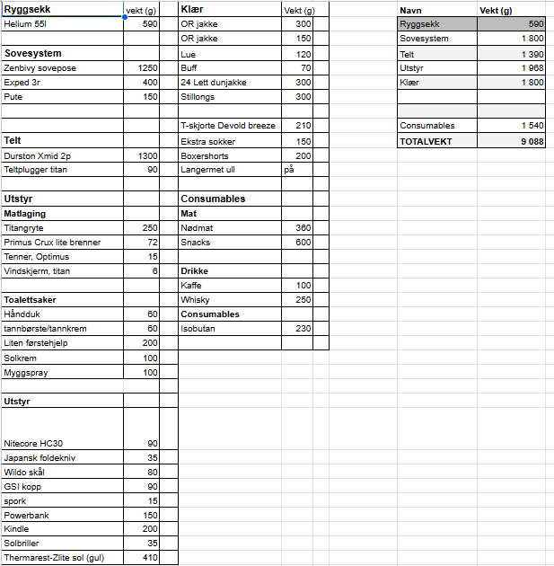 1. Det er gøy å skvise vekt. Jeg pakker ikke ultralett, men jeg prøver å komme langt ned i vekt sånn at jeg ha det komfortabelt på tur. Årets tur til Tafjord ble som følger: merk, veid vekt her er minus mat og snacks, så faktisk vekt på dagen var nokså likt det regnearket og planen sa det skulle bli.
