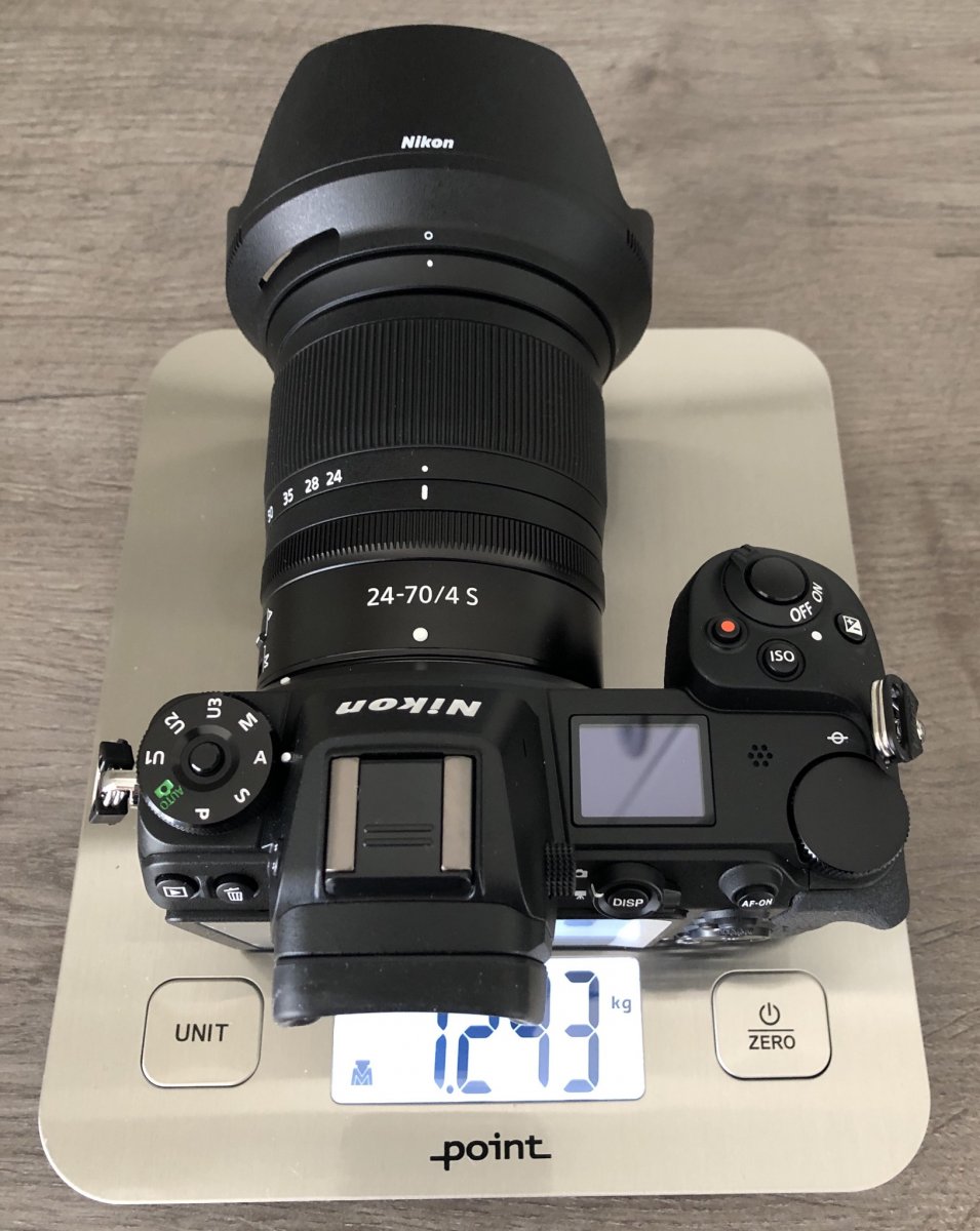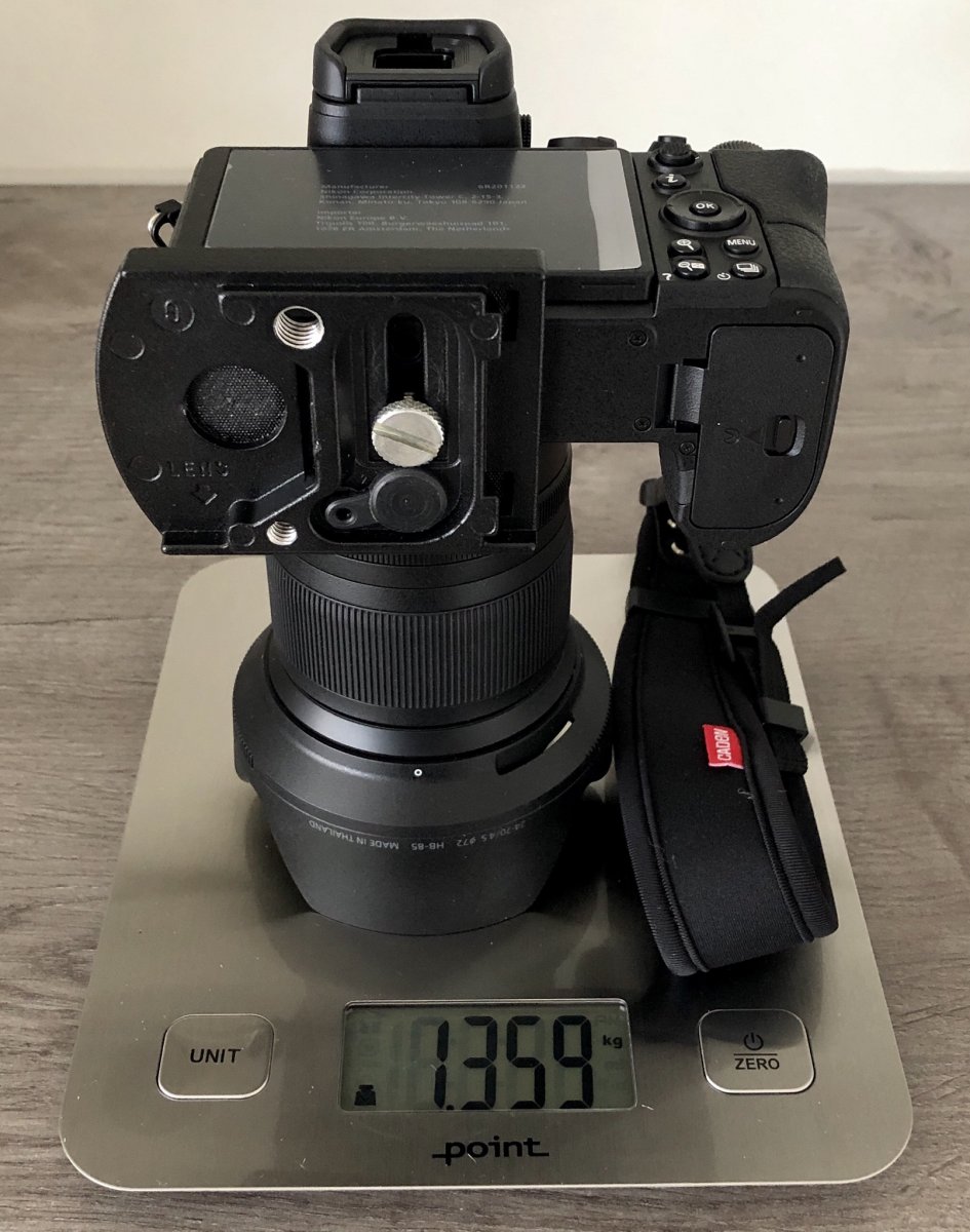 Jeg er også godt fornøyd med grepet på Z6 - stort og godt å holde i. Med crop-brikke x1.6 ville jeg ha mer vidvinkel. Med Z6 ønsker jeg mer tele 😊 Vekt med og uten stor stativplate: Edit: Vekt er også inkl beskyttelsefilter for objektivet. Tipper rundt 1200gr uten filter.
