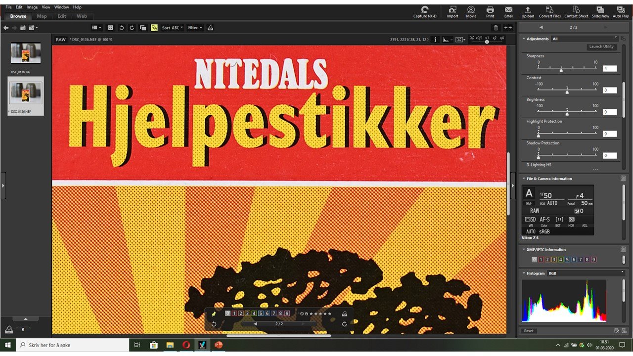 Litt mer nerding i møkkaværet Måtte prøve på nytt, denne gangen på 50mm. Full åpning som forrige gang, dvs. blender f/4. Utrolig god nærgrense på objektivet!! Nikon holder hva de lover og skarpheten over hele fjøla er imponerende god!!! Fokus er på "Hjelpestikker"-teksten. Stabilisatoren på selve CMOS-brikka er effektiv og kostnads- og vektbesparende da man kan kjøpe optikk uten stabilisator. Går fint å ta håndholdte bilder på 1/50 sek, men ish 4 av 10 blir superskarpe og de andre 6 overraskende skarpe i 100% skjermvisning. Skarpheten før konvertering til JPEG og posting her på forumet er en god del bedre, dvs noe forsvinner i konverteringsprosessen, men slettes ikke dårlig for det 50mm Edit: De to siste bildene på nærhetsgrensa og i 100% størrelse. Fokus plassert på "es". 70mm f/4 Edit: Jeg la til 70mm f/4 som er like skarpt som på 50mm. Ikke vanlig at optikk er like skarp all over, i hvertfall ikke på fullformat. I hvertfall inntil diffraksjonsuskarphet slår inn en gang etter blender f/11.