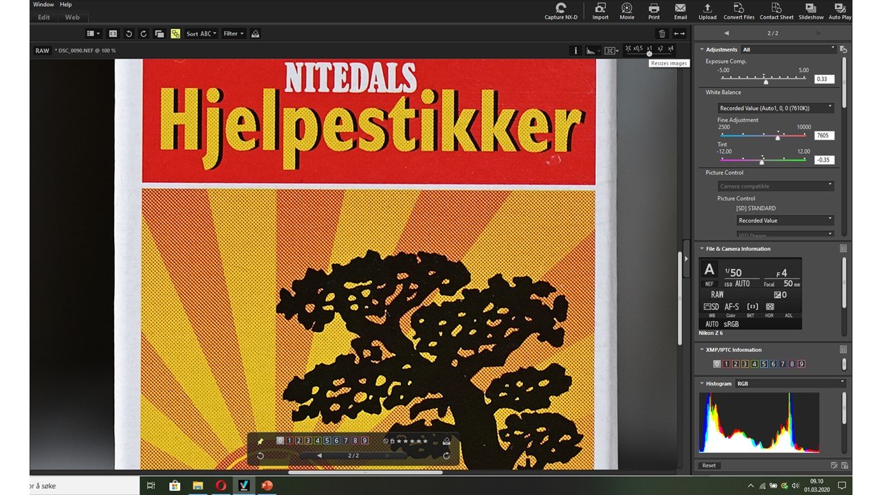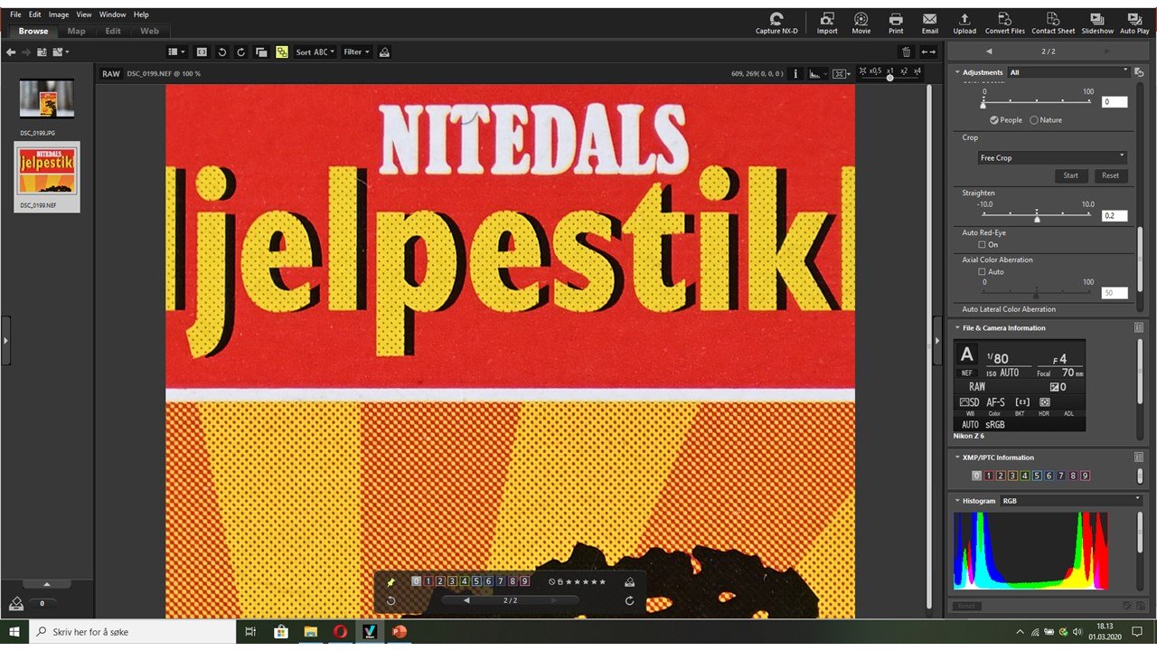 Jeg har ikke brukt kameraet lenge, men jeg synes det blir bedre og bedre i bruk. På en måte er det avansert, men samtidig enkelt. Menysystemet er funksjonelt og bra. Det er vanskelig å sammenlikne med speilrefleks pr nå, men et par klare fordeler og ulemper har jeg gjort meg opp. Jeg tror speilrefleks vil leve lenge da det har sine klare fordeler. Fordeler: lettere og mindre enn dslr lettere å blåse bort støv på CMOS-brikka da denne er synlig(har holdt seg støvfri til nå) lite nok til dagligdags bruk som dagsturer etc. stabilisator på CMOS-brikka Ulemper: den elektroniske søkeren er overraskende bra, men den optiske søkeren på speilrefleks er uten tvil bedre litt stort som turkamera med endel vandring dårlig batteritid Jeg er imponert over medfølgende optikk, Nikkor Z 24-70mm f/4 S. Dette er skarpt fra full blenderåpning (f/2.8-versjonen skal være enda bedre og et referanseobjektiv). Et prøvebilde rundt 80% crop under på blender f/4 og håndholdt. Jeg fikk også installert både ViewNX-i og Capture NX-D, noe som holder mer enn nok til mitt bruk.