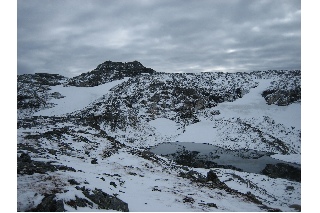 Vel oppe ved varden blir vi overraska av sterk vind, og ei merkeleg lita revne i tåkelaget. Vi kryp i ly bak varden, og blir vitne til korleis tåka sprekk opp, og vi etterkvart får god utsikt til andre fjelltoppar, og mektige Blåsjø. Synest litt synd på han som var føre oss, men reknar med at han har sett utsikta før. Ser i topp-boka at det ikkje har vore så mange andre her i sommar og haust. Fin tur nedigjen i eigne spor, ser toppen klart på vegen ned igjen (bilde). Brukte 6,5 time t/r Mostøl.