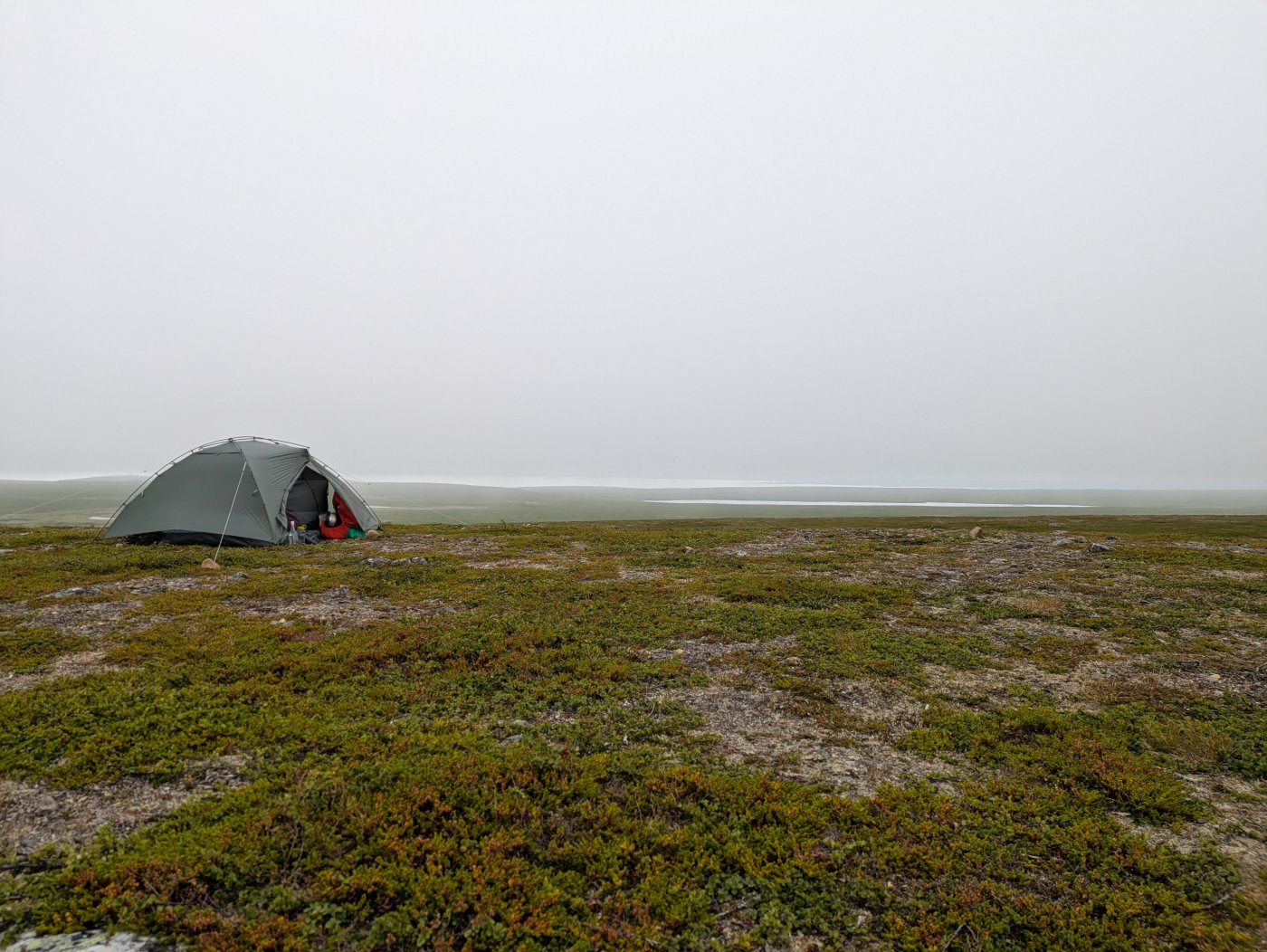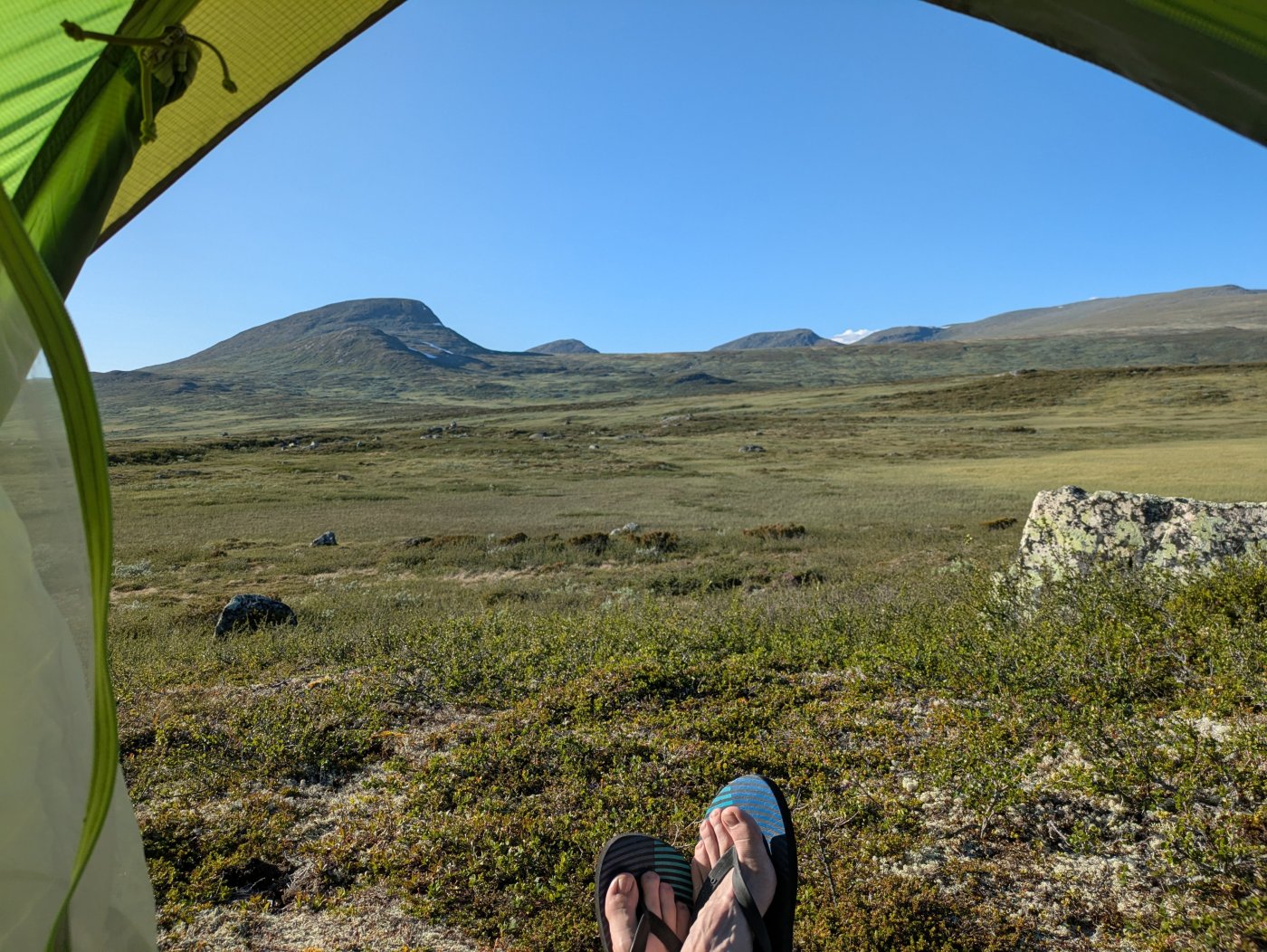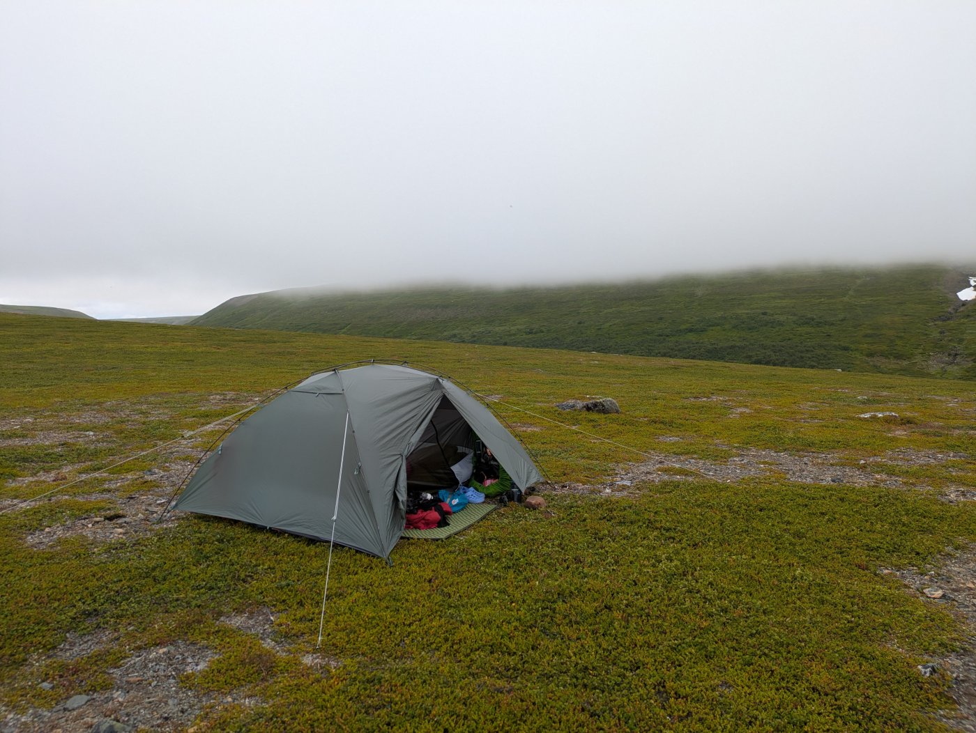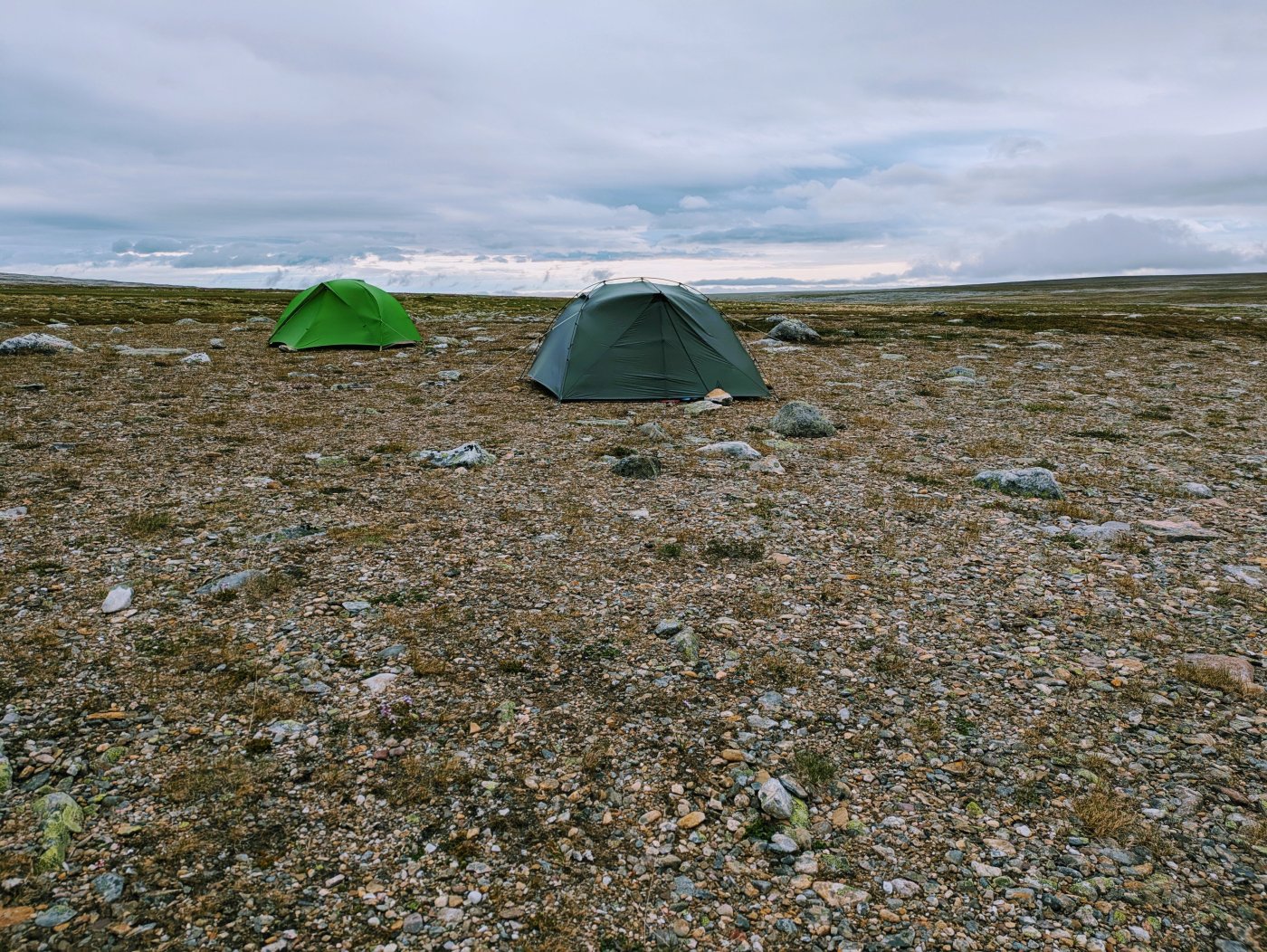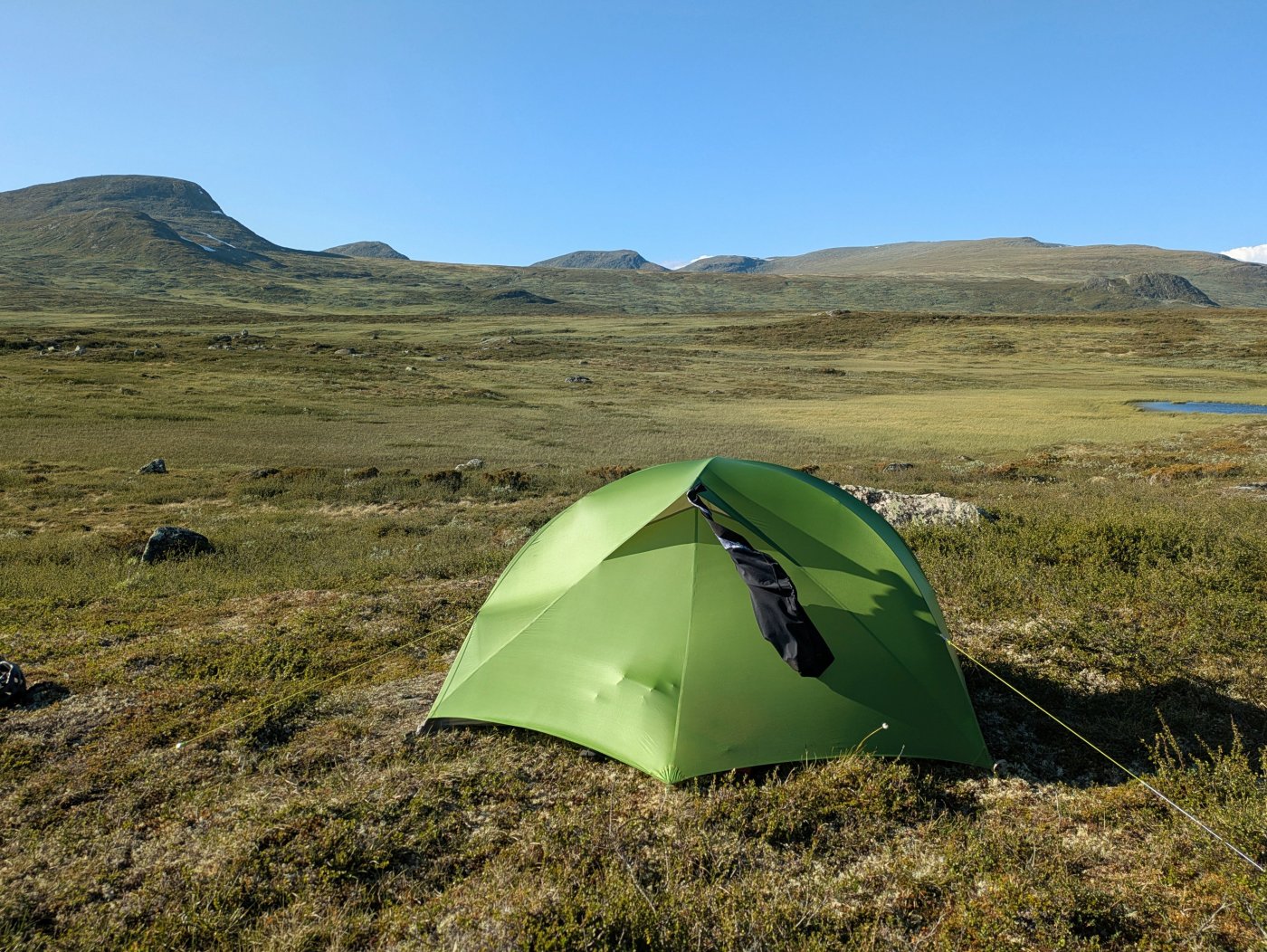 Det er også av stor betydning hvilket telt du har. Et lite selvstående kuppeltelt av typen Hilleberg Unna får jeg lurt inn nærmest overalt. Har du 3-manns tunelltelt med stort fortelt trenger det mye større plass og krever bedre underlag til plugger. Jeg bruker forøvrig også Norge i bilder når jeg planlegger turer, men det er ikke alltid virkeligheten stemmer med den imaginære perfekte teltplassen jeg har sett meg ut.