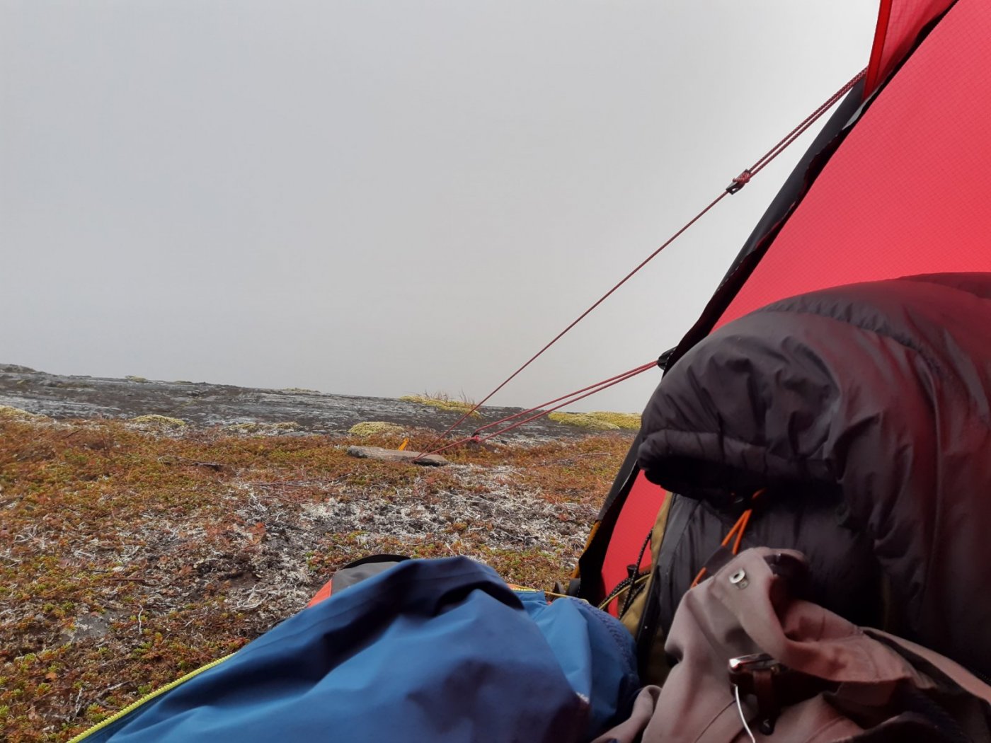 1) Tåke, vind og regn kan vere vakkert, men det fordrer gjerne at ein har eit trygg og varm tilhaldsstad. Eit lite einmannstelt der ein ikkje fyrer, er ikkje ein slik trygg og varm tilhaldsstad. For meg er Akto ikkje eit regnværstelt/hausttelt, men eit godværstelt. I løpet av turen fantaserte eg om å kjøpe Nammatj eller Staika, eller kanskje enda betre begge to.
