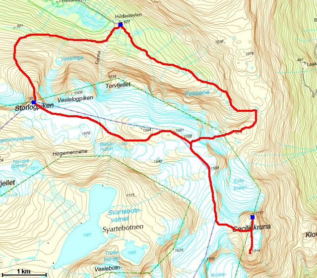 Sommerferien 2005, nærmere bestemt 9. august hadde jeg og onkel et mål som vi hadde drømt om i lang tid. Hver gang vi syklet inn Oldedalen for å nyte Briksdalsbreens sprekker, passerte vi et vakkert fjell som heter Ceciliekruna/Sisiliekruna (1717 moh). Mektig stiger fjellet opp av Oldevatnet i Stryn kommune, ja dette måtte bestiges! Vi var litt i tvil om dette fjellet kunne bestiges uten brepassasje over Eidsbreen, eller om snøfonnene mellom Kruna og Storlogpikjen var uforsvarlig å gå på. Etter en prat med kjentmannen Halvard Muri var vi overbevist om at dette ville gå. På morgenen kjørte vi fra Bøasætra og på de svingete veiene helt til Hildastøylen i Innvikdalen. Vel, våre etterkommere vil sikkert le når de ser filmen vår fra veiene her i Indre Nordfjord? Vel framme ved Hildastøylen, etter å ha betalt litt bompenger satte vi i vei innover dalen og fulgte ryggen opp på pkt. 1274. Her skulle vi peile mot en stor stein i himmelranden i vest. En diger kampestein gikk vi mot, synes jeg huske. Det ble en del vandring på snø til vi var oppe på platået rundt pkt. 1582. Oppstigningen hit gikk meget greit for seg, det er bare å improvisere hvilken vei som er best å gå. For de med breerfaring er den letteste veien til topps om Eidsbreen. Bortover flatene mot Ceciliekruna skimtet vi en perle i sør, langt bak de lange snøviddene. Det var selveste Snønipa (1827 moh), rapport fra den turen kan man se på filmen vi har laget (les: på signaturen min). På toppen så vi nordover mot Sunnmørsalpene, innover Jostedalsbreen, vestover mot Ålfotbreen og Gjegnen og østover mot Meleinsnibba og Ramnefjellbreen. No ser eg atter slike fjell og dalar, tenkte jeg. På vei tilbake gikk vi ned ryggen fra Storlogpiken (1553 moh), men på veien dit passerte vi et stilig isvann som var blått som var på grensen til indigoblå. Ikke rart det kalles ”Blekkhuset”. Siden klokken var så mye rakk vi ikke å stikke nedom Veslelogpiken (1508 moh) også. På Storlogpiken fikk vi en nydelig solnedgang over Nordfjorden, og den fulgte oss nesten helt ned i Innvikdalen. Knærne fikk kjørt seg da vi småløp nedover mot bilen. Rett før bjørkeskogen begynte møtte vi på en morenerygg som gikk parallelt med dalen. Den førte oss nesten ned til bilen, og var veldig fin å følge! Det smakte godt med kylling og pommes frites da vi var kommet tilbake på hytta, fikk brent av noen kalorier der tenker jeg!