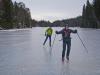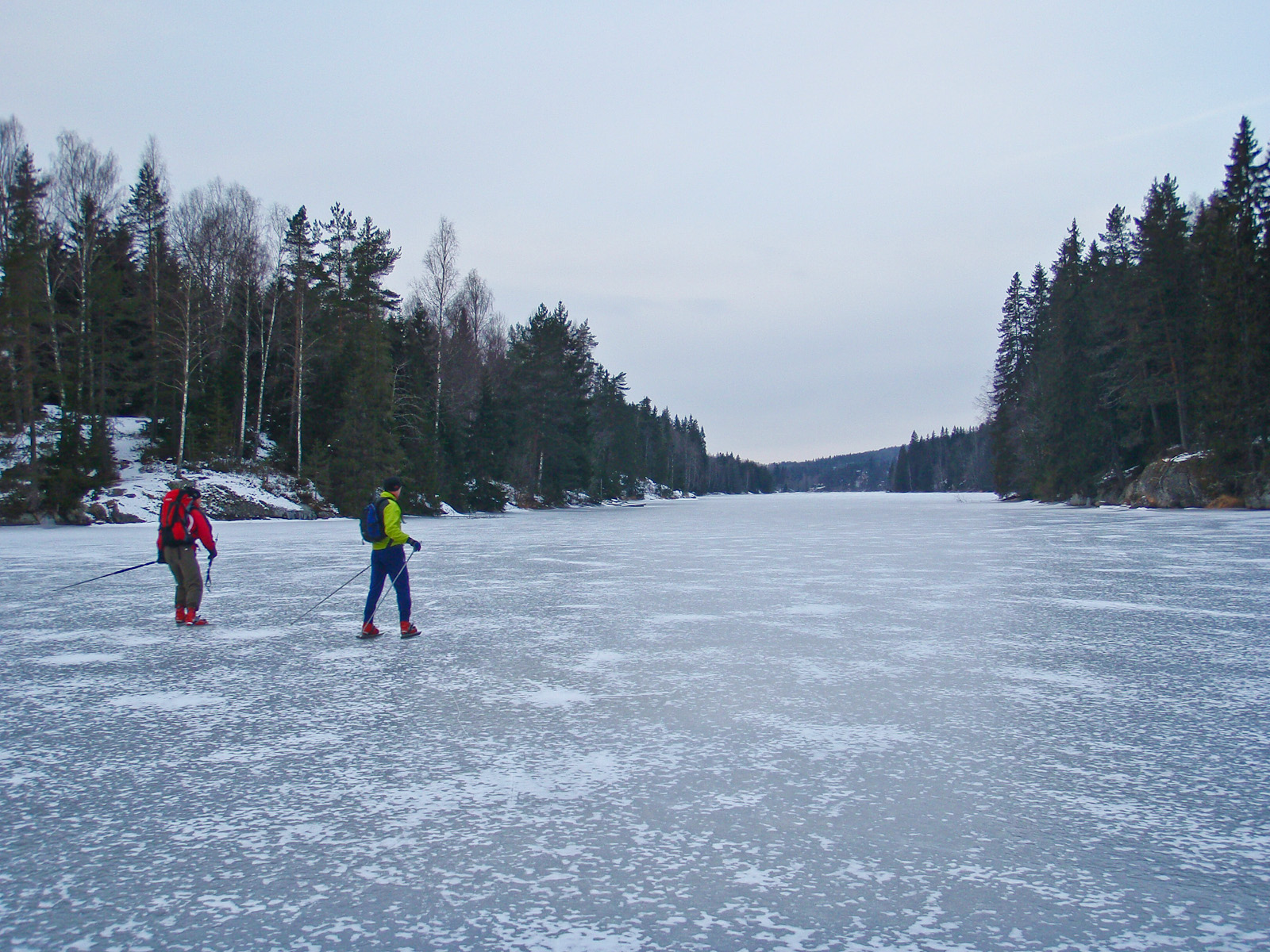 Fine forhold på vannene rundt Østmarka nå! Lørdag tok jeg, pappa og Halvor oss en snaut 3 mil lang skøytetur fra Våg i Ytre Enebakk til nordenden av Langen med retur. God is stort sett over alt, men vær forsiktig i trange sund med gjennomstrømmende vann. Så på GPSen at vi nådde en maksfart på 33 km/t, så det tyder på at det gikk unna. Utnytt muligheten mens den er der nå!