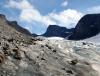 Aiaiai!.. da jeg våknet kjente jeg det i låra etter i går. Men været var bra med blå himmel over Leirdalen, så jeg måtte ut på tur. Utenfor bildøra på Ytterdalssætri lå det tett med telt og en plakat det stod ”Til topps 91” eller noe sånt. Skulle trudd det var en speider-jamboree! Sekken var godt pakket, til og med tauet skulle brukes til en rappell i dag. Bakkene opp mot Heimre Illåbrean bestod stort sett av gress og buskkratt før jeg kom til Heimre Illåe. Her var det typisk brelandskap der isbreen hadde gravd og herjet. Det er ganske goldt og kjedelig å gå på slike steder og jeg gledet meg til å komme høyere opp. Etter en bakke låra følte var lang nok stod jeg til slutt på Fremste Storgrovhøe. Jeg tok en telefon til Jørn der jeg sa at nå kunne han angre, været er faktisk bra nok for tur! Storjuvbrean lå under meg sprekkete og svær sikkert godt egnet til islek. Nå bar det bort til Bakarste Storgrovhøe før jeg måtte klyve ned og bort til Storgrovtinden. Nok en gang gjorde sekken det vanskeligere enn normalt ned hit så jeg måtte være tettere på alerten enn med ”0-kg sekk” som vanlig. Jeg var spent på hvordan det skulle bli videre mot Heimre Illåbreatind. På noen bilder husket jeg en 20 m høy hammer der jeg ikke ville funnet på å gå usikret. Men litt ut mot vest fant jeg en liten omgåelse som gikk ned til en hylle under hammeren. Jeg fulgte den helt til en 4-meter høy hammer sperret mot videre ferdsel. Hadde jeg kommet motsatt vei med lett sekk hadde jeg nok gått her usikret, men når jeg først hadde drasset med meg tau og sele kunne jeg like gjerne ta en rappell. Brukte en 120 cm ferdigslynge rundt en blokk og så firet jeg meg ned. Grei skuring til Heimre Illåbreatind, delvis på egg som kan omgås til høyre. På sadelen mot Søre Illåbreatind la jeg fra meg sekken og sprang opp til den toppen. Veien opp bød på klyving på egg og riss hvis man tok den direkte varianten. Skardstind så virkelig mektig ut herfra, en stor og høy vegg som reiset seg til værs. I slike stunder føler man seg liten. Etter å ha returnert til sekken tok jeg meg ned til Heimre Illåbrean som jeg fulgte helt ned til tunga der jeg kom opp. Breen var isglassert, men nokså ruglete at jeg faktisk fikk god friksjon med skoene. Jeg hoppet over noen sprekker og ved siden av meg rant det flere bekker med fossende smeltevann. Undervegs kom det en skikkelig regnskur som heldigvis passerte ganske fort. Etter breen holdt jeg venstre skar ned igjen, altså ikke der elva rant. Ruta mi bød på litt klyving på glatte sva og ellers en del hyllegåing. Så gikk jeg mer mot nord før jeg skar av mot vest og Ytterdalssætri. Det lønte seg da jeg slapp en del krattkrangling som jeg fikk på vei opp. Speiderleiren hadde dratt sin kos da jeg kom ned til bilen. Jeg dro ned til Lom der jeg møtte Håvard og Mayhassen over en matbit. Turdata: 8 timer 1940 høydemeter 15,5 km 5 topper > 2000 moh.