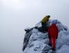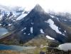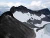 Denne dagen skulle jeg egentlig hvile nede i Lom, men den gang ei. Værmeldingene var gode og Øyvind var keen på å klatre. Den sjansen lot jeg ikke løpe fra meg og målet for dagen ble Austanbotntraversen. Da vi startet fra Berdalsbandet lå det dystre skyer rundt toppene, men vi fortsatte i håp om at det skulle sprekke opp. Steinene var glatte på vei opp mot Austanbotntind S-2 etter nattens regnvær. Jeg hadde en dårlig følelse inne i meg om at tåken ikke ville forsvinne og at det glatte fjellet ville gjøre turen videre VELDIG spennende. Det siste stykket opp mot S-2 var nokså utsatt da man ble tvunget ut på en hylle ut mot veststupet. Jeg tok ingen sjanser og dyttet sekken min foran meg før jeg kløv opp. Øyvind trengte ingen hjelp med sekken selvsagt. Plutselig drev skyene forbi og vi fikk utsikt framover. Det var pinakkelen vi så! Den hadde jeg hørt veldig mye om, og det var nesten uvirkelig å endelig se den i virkeligheten. Men det så ikke direkte lett ut å komme opp til den, spesielt ikke med utstyrslessede sekker. Vi tok 30 minutter pause for å vente på solen og at fjellet skulle tørke mer. Jeg tok på meg svaskoene som jeg uansett skulle bruke etter pinakkelen. Øyvind spurte om han fikk lov til å gå opp til pinakkelen usikret. Selvsagt OK for meg, bare jeg fikk topptausikring. Det var en lettelse å klatre sikret opp hit. Klatringen lå nok rundt grad 3, og det vanskeligste var et 2-3 meter langt riss med kun håndfeste. Deretter måtte man traversere litt til høyre på en list i fjellet før en var så godt som oppe. Vi hev en 120 cm slynge over pinakkelen, og sammen med de mange andre slyngene utgjorde det vårt rappellfeste ned nordsiden. Rappellen var ikke lang, max 5-6 meter. Mens jeg kveilet sammen tauet hadde Øyvind laget en standplass lenger oppe. Når en går med Mayhassen i taulag blir det selvsagt ikke letteste rutevalg. I stedet for å gå svaene til høyre gikk vi direkte opp til Austanbotntind S-1, nesten ved kanten av veststupet. Standplassen var en stor og fast blokk i fjellet, og Øyvind ledet opp mens jeg sikret. Etter noen meter kom første utfordring, et 4-er opptak med dårlige sikringsmuligheter. Løsningen ble at Øyvind satt to såkalte ”psykiske sikringer” som absolutt ikke var noen bomber, men bedre enn ingenting ved et eventuelt fall. Resten av ruta var utsatt og luftig, men ikke vanskeligere enn grad 3. Etter kort tid hadde han laget en standplass i rappellfestet på S-1 og jeg kunne starte klatringen. Jeg følte det var kjekt med klatresko, og jeg kom meg opp uten store problemer. På toppen ble det ”give me five” og gledesjubel før vi fortsatte bort den luftige eggen til bratta opp mot Austanbotntind V-0. Nå var det sol og fint vær så vi kunne ikke dy oss med å sende en MMS til Jørn. Du gikk glipp av en kremtur der dessverre, hehe. Vi fulgte ryggen direkte opp til V-0 i stedet for å holde mer til høyre som man vanligvis gjør. Øyvind ledet uten å sette mer enn 1 kile, og den kilen løsnet så fort han skulle dra inn tauet etter å ha satt siste standplass på V-0. Klatringen var på 2 taulengder og ikke vanskeligere enn 3+ antok vi, men dog utsatt og luftig. Et sted måtte jeg klemme meg inn mellom to steiner, og sammen med sekken satt jeg meg nesten fast. Det gikk på hengende håret. Sekkene ble satt igjen på V-0 og vi sprang bort til St. Austanbotntinden. At det er så fryktelig luftig på toppen synes jeg absolutt er oppskrytt, her er det god plass og det er nok flere punkter man møter om man kommer fra vest som er luftigere. Etter hvert returnerte vi til sekkene og spaserte ned den inngraverte stien i svaene før vi ruslet over en egg. Tidligere på sommeren kan det nok være verre å gå her på grunn av en snøfonn som nå var bortsmeltet. Ned til sadelen mot V-1 måtte vi over et luftig nedtak før vi kløv opp til toppen. For litt over en uke siden var vi her med klatrekurset i regnvær og ble sikret (påbudt). Det følte jeg absolutt ikke behov for i dag. Fra V-1 var det kun en parktur bort til V-2, undervegs tittet vi ned den bratte renna der noen skikjører suser ned. Det kaller jeg ekstremt! Mot bilen økte temperaturen og vi tok noen avslappende pauser før vi var nede. Turen ble feiret med en bedre middag på Fossberg Hotell i Lom, no burger today! Turdata: 8 timer 10 km 5 topper > 2000 moh.