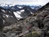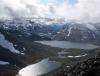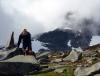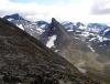 I dag hadde yr.no ikke meldt noe annet enn knallvær. Men i natt hadde det snødd, og snøen gjorde det slik at tåken på toppene ikke forsvant med det første. Jeg, Halvor og boxeren Maja gikk inn for planen og håpet været ville forandre seg. Vi fulgte steinura opp til Leirhaugen og fortsatte høydedraget til der oppstigningen til Leirløyfte startet. På toppene lå det kritthvit snø, og vi gruet oss litt til å forlate de tørre steinene her i «lavlandet». Opp Leirløyftet gikk det greit bare vi fulgte letteste vei, og boxeren hadde ingen problemer. Halvor var litt nervøs og holdt bikkja i bånd i tilfelle den skulle rote seg utfor noen bratte sva. Da vi kom opp på Vest for Tverrbottinden V-1 ville Halvor gå i forvegen mot Store Tverrbottind mens jeg sprang bort på Tverrbottinden V-1. Det var såpeglatt nysnø så jeg prøvde meg ikke på direktevarianten. I stedet fulgte jeg flanken i sørsiden og gikk en slags renne opp til toppen. Tåka hang rundt toppene, men av og til fikk jeg et par glimt av Bukkeholstindene på den andre siden av Søre Illåbrean. Halvor trodde ikke at det fantes så store isbreer som Søre Illåbreen i Jotunheimen, så jeg forklarte ham at det finnes flere andre som er på samme størrelse eller større i nasjonalparken. Etter Store Tverrbottinden møtte vi en kar som hadde gått motsatt vei av oss. I likhet med oss forbannet han seg over meteorologenes feilmelding i tillegg til den sleipe snøen. Ikke før vi kom til Midtre Tverrbottinden Sør begynte skyene å fordufte for godt og sola slapp til! Jeg hadde nesten gitt opp håpet om å gidde å gå bort til Tverrbytthornet, men nå som finværet kom ombestemte jeg meg. På Midtre Tverrbottinden Sør lå det en stor og flat snøfonn. Da vi skulle fortsette ned i sørøstura begynte jeg etter hvert å lure på om jeg gikk mot et stup. Jeg så jo ikke om denne breen var en skavl siden den var horisontflat. Heldigvis endte den ikke i stup. Ura ned mot de Søre Tverrbottinder bød på lett klyving som bikkja var litt skeptisk til. Halvor og Maja returnerte til Leirvassbu ned skaret mellom Søre Tverrbottind og Tverrbytthornet. Det siste jeg sa til dem var «førstemann tilbake» før jeg sprang oppover ryggen mot Tverrbytthornet. Etter hvert begynte det å snø tett i tett, men heldigvis var det kun en byge. Snøen gjorde fjellet sleipt, og jeg gadd ikke prøve på å klatre opp den røde hammeren jeg kom til lenger oppe på ryggen. I stedet trakk jeg ned en svaete og grusete renne til høyre før jeg fant et sted der hammeren kunne omgås greit med klyving. Deretter gikk jeg opp på ryggen igjen og kort tid senere stod jeg på Vestre Tverrbytthornet. Herfra gikk det en ganske luftig egg videre før det gikk lett opp på selveste Tverrbytthornet, sommerferiens siste topp! Det var faktisk sol og varme da jeg stod på toppen og utsikten ble nytt noen minutter før jeg måtte ned den relativt løse sørflanken mot Kyrkjeglupen. Så var det bare å småjogge DNT-stien bort til Leirvassbu som jeg ankom knappe 45 minutter etter jeg forlot Tverrbytthornet. Likevel kom jeg 10 minutter etter Halvor! Sommerferiens store toppfangsts ble feiret med kylling og karamellpudding på Lemonsjø. Så bar det hjem til Asker, og byens mas og kjas. Turdata: 7t 30min 1590 høydemeter 16 km 7 topper > 2000 moh.