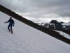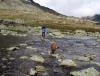 Halvor, meg og til og med boxeren Maja fikk en god natts søvn på koselige Leirvassbu. Været var meldt bra i forvegen, men da vekkerklokka kimet kl. 08.00 lå det tunge skyer rundt toppene. Æsj! Jeg hadde ikke lyst til å gå noen lang tur i gråvær, så vi sov en time til i håp om at det så lysere ut da. Det var ikke blitt noe merkbart bedre, men tur ble det uansett for i morgen var det meldt knallvær. Hvis ikke hadde vi nok reist hjem... Maja var glad for å være med, og hun fikk gå løs under oppsyn over Høgvaglen og inn i Semeldalsmunnen. Målet for dagen var Austre Rauddalstind og Høgvagltindane. Vi møtte et stort turfølge fra Olavsbu i det vi trasket oppover mot Rauddalsbandet. Jeg hadde lyst til å prøve å nå Austre Rauddalstind direkte fra nordøst, men da vi nærmet oss og det i tillegg kom en regnbyge tok vi ikke sjansen med tanke på at vi hadde med en lite fjellvant boxertispe. Vi trakk over noen snøfonner og inn i Simledalen. Her var det nokså goldt terreng øverst ved bandet, men lenger nedi dalen er det friskt og frodig. Opp mot Rauddalsryggen fulgte vi fjellskråningen opp mot pkt-1930. Her var det noen små hamre vi slet med å få med bikkja, og på slutten var det noen sva der bikkja klarte seg lettere enn meg og Halvor (hun har klør!). Det var flere tydelige sprekker på breen ved siden av så det var ikke noe sted å gå uten tau. Opp til Austre Rauddalstind ble det gradvis brattere, og vi satte igjen bikkja ved gul-punktet like før toppen. Her var det litt småutsatt klyvingen på venstre side av en hammer. Selv om det var vått følte ikke jeg det som noe skummelt. Null sikt ved toppvarden, jippi!! Ikke noe sted å slå seg ned så vi returnerte straks til hunden. Planene om Høgvagltind ble forkastet delvis på grunn av været, og delvis på grunn av at vi var usikre på om vi rakk middagen på Leirvassbu. Ned til Simledalen skle vi raskt ned fonna vest for 1930-toppen (se video). Etter det klarte vi å tulle oss inn i noen bratte hamre som vi lett kunne ha omgått lenger mot øst, men vi kom oss nå ned med tiden til hjelp. Simledalen var faktisk en nytelse å følge bort til Gravdalen. Storutla var litt kinkig å komme over, men vi fant til slutt et sted å komme over tørrskodd. Grusveien tilbake er ganske kjedelig å følge, og det føltes ut som en evighet tilbake til Leirvassbu. Vi tok en titt på nødbua Nøgla som ligger ved stiskillet mellom Leirvassbu, Gjendebu og Skogadalsbøen, et stilig krypinn som man sikkert setter pris på om man kommer utfor en snøstorm en kald vinternatt. Filmsnutt: Turdata: 8t 15min 1250 høydemeter 25 km 1 topp > 2000 moh.