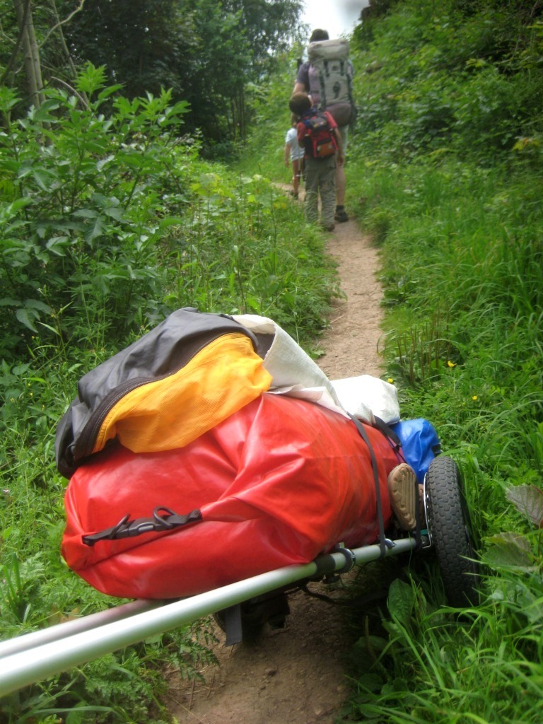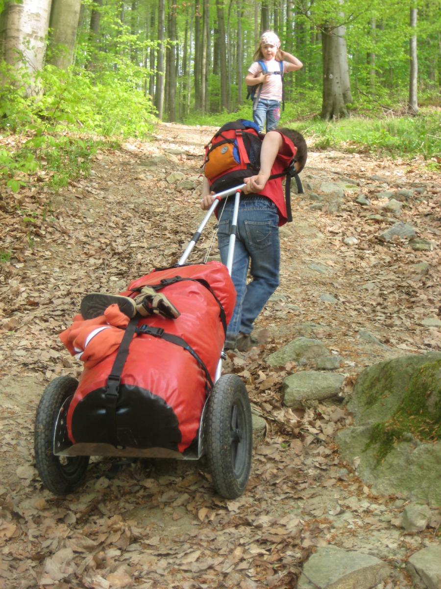 Takk for tipsene! „Tralle“ – det var begrepet jeg manglet – takk! @fjellrypa: Jeg bor i Tyskland, hvor det meste av vandringen foregår på grus-/kjerreveier, skogsti e.l. som ikke kan sammenlignes med sti i (høy)fjellet. Men jeg var forundret over hvor mye av turen trallen kunne brukes og hvor lite og kort den måtte bæres. @7homas: Monotraller som Monowalker er sikkert bedre å bruke i terrenget, men lasten veier mye tyngre på grunn av geometrien (ingen last over eller bak akselen). Dessuten må en monotralle festes på to punkter av kroppen (som en pulk) og kan ikke føres med bare en hånd. Det gjør en meget uflexibel. Som sagt, det dreier seg om telttur med små barn. Bare for meg alene ville jeg aldri tenke på å bruek en tralle i terrenget (unntatt ørkener e.l.) Jeg er alltid glad over deres videre erfaring eller vurdering med bruk av traller i norsk fjell. Hilsen, Philipp -