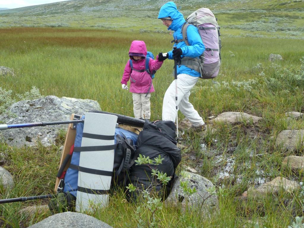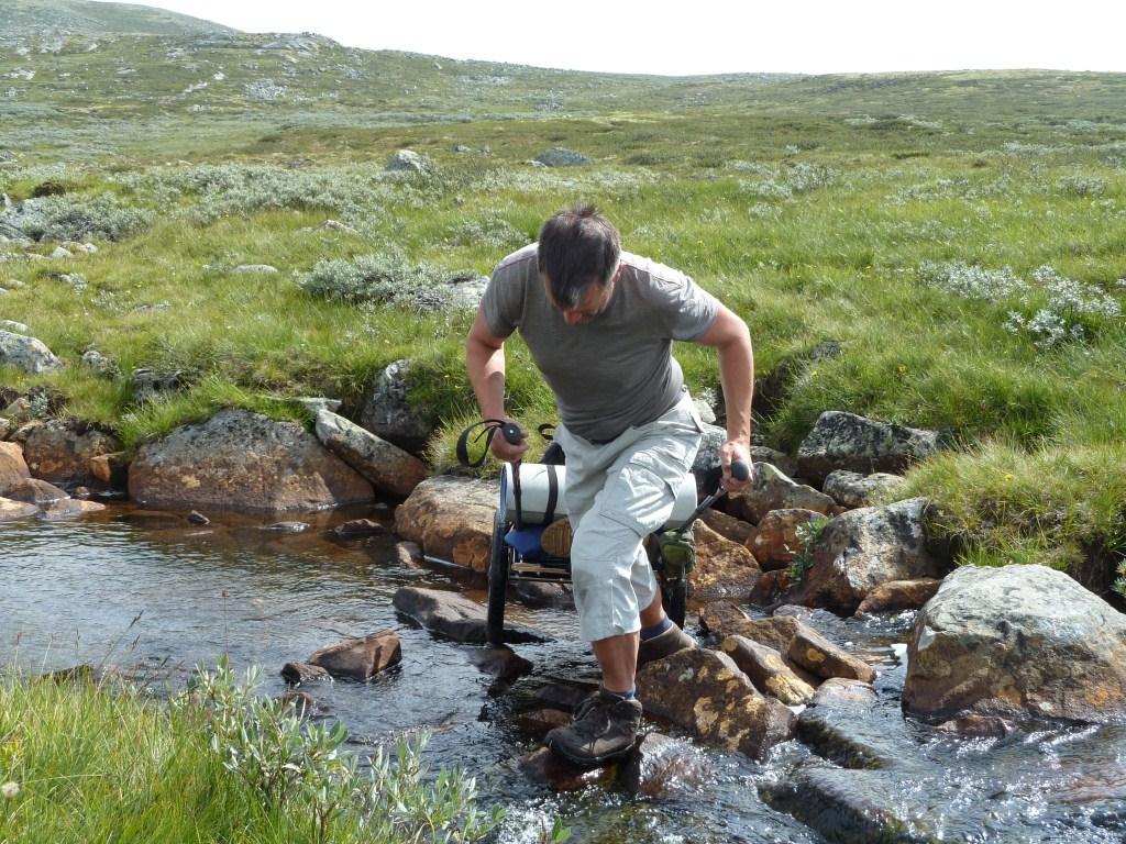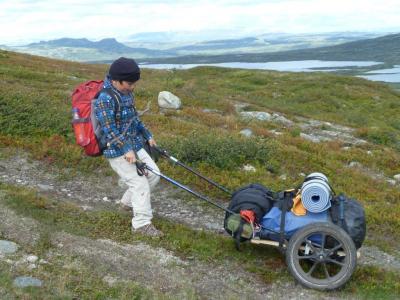Hei! Vi er tilbake fra Norge og jeg skal gi noen opplysninger om turen vår i Hardangervidda med den selvbygde trallen. Vi startet på Solheimstulen og gikk traktorveien til den krysser turstien Rauhelleren-Mårbu. Dette gikk helt bra, trallen med ca. 30 kg (mat for 4 personer og for > 8 dager, telt, kjøkken osv.) kunne spille ut sin stor fordel ovenfor en veldig (for) tung ryggsekk og var ganske lett å trekke. Siden svingte vi inn på turstien til Rauhelleren som først gikk bra og så, vel, ikke lenger så bra. Spesielt selve stien var tung å gå siden de store steinene er preparert ut av turgjengerne og gjør det vanskelig å komme seg frem – som ventet…Ifølge den tørre sommeren var det ofte lurt og godt mulig å unnvike over myra som var ganske tørre. Ned til Lågen og et stykke opp igjen videre mot Rauhelleren var jeg ganske fortvilet og ville helst kaste hele bagasjen i elven...men lot heldigvis være. Hengeren veltet ofte men bare ett sted og over brua måtte jeg bære. Videre over myra til Hansbu ved Rauhelleren gikk det igjen bra bortsett fra noen veldig gjørmete sted hvor hengeren sank inn helt til bagasjeplattformen. Fra Hansbu ved Rauhelleren gikk vi tilbake til Solheimstulen på stien via Dagfiskehyttun og fra bruen over Lågen ved innsjøen Hølen på den gamle traktorveien (som er i betraktelig verre tilstand her, altså ikke kjedelig å gå) over Høljabrotet til Ulvelilægret. Jeg er overbevist at vi kunne ha fortsett til Dyranut gjennom de sentrale og flate delene av Hardangervidda, men siden denne turen ikke ville by på stort andre opplevelser lot vi det være og snudde. I de steinete områdene ble hengeren meget sterkt belastet, hjulene ble punktert flere ganger og stavene bøyet, men vi kunne alltid fortsette. Noen ting ved trallen vil jeg endre, flere ting ville være fine å forbedre, men jeg frykter at jeg er litt for lat for det. Det ville være kult å ha en tralle med større, fjærete og litt skjevt stilte hjul og en bagasjeplattform som ligger dypere enn akselen, men en sånn konstruksjon er bortenfor mine ferdigheter… Fasitten for oss: i lett terreng, på store stier og på kjerre-/traktorveier kan en tralle godt brukes for bagasjetransport. Er du på tur med små barn og vil du ha med mat for mer enn noen få dager så er en tralle kanskje uunngåelig dersom du ikke er en Herkules (som jeg er ihvertfall ikke). Med spesiell tanke på Hardangervidda er jeg overbevist om at den kan krysses med en sånn tralle via traktorveiene og de stiene som er lettere å gå fra t. eks. Solheimstulen eller Imingfjell via Lågaros til Dyranut hvis man er villig å slite litt på noen steder og å gå delvis på kryss og tvers gjennom myra og buskaset. Da vi senere tok oss en tur fra Hjelle i Utladalen til Stølsmaradalen i Hurrungane NP med barna lot vi trallen selvfølgelig i bilen J. Siden det var bare noen få dager gikk det også bra med all maten i – den tunge - sekken. Hilsen, Philipp- 9 svar