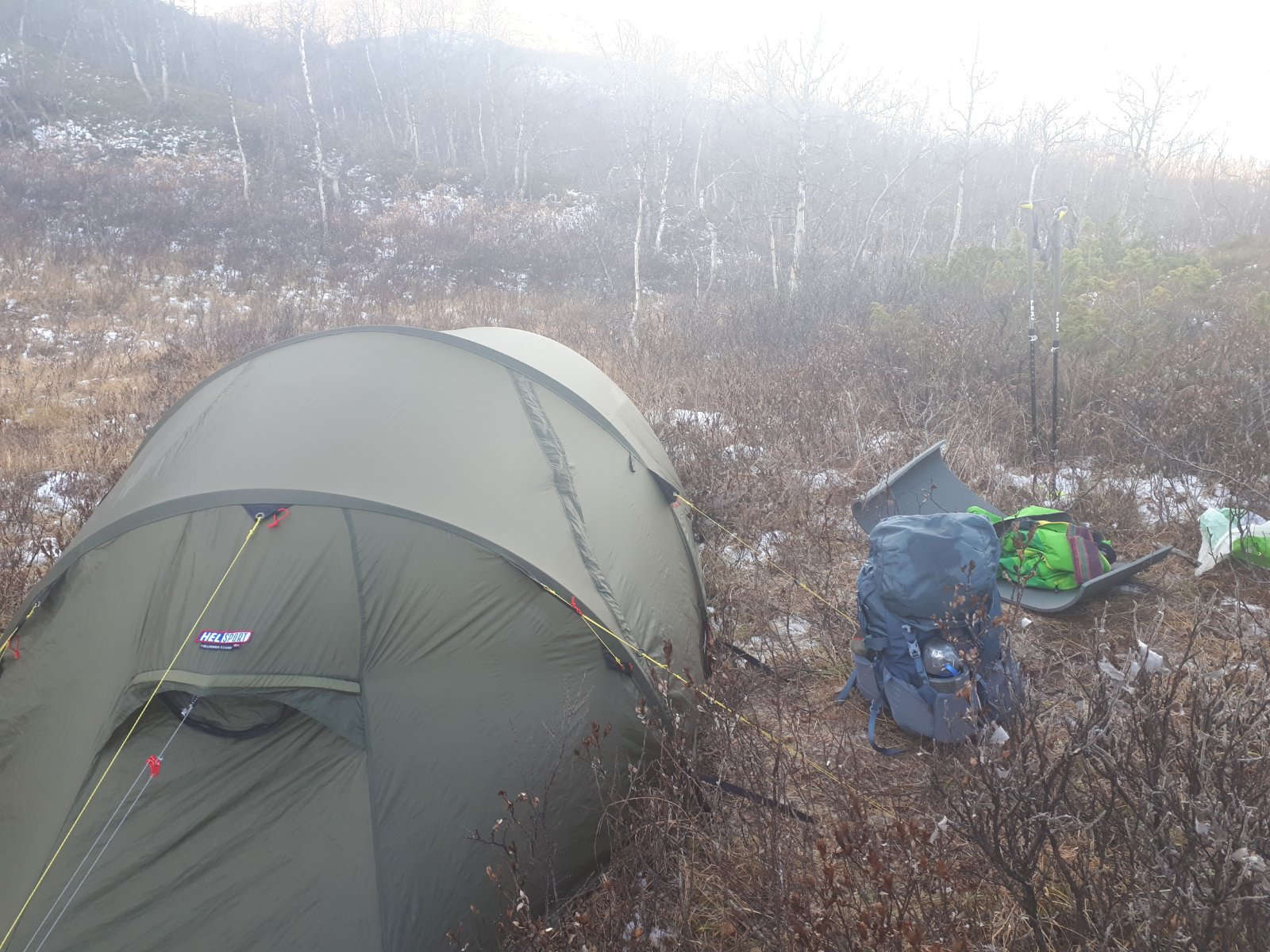 Heisann, mye bra innspill her ang poncho, dusje med klær og sko, "tørr ullpysjamas". Takker og bukker for alle svar. Takk for svar @Skogens Stønn Som jeg skrev visste jeg innerst inne at det var en del "tullevalg" jeg gjorde med tanke på utstyr, typ irrasjonelle valg: "Det går nok bra med så tynn sovepose" for eksempel. Eller at jeg valgte å gå over fjellet selv om det var meldt uvær. Jeg gjorde mange erfaringer som jeg tar med meg. "Bli hjemme" var egentlig et forsøk på litt humor Er helt enig i det med testing av utstyr, jeg er nok litt lat i den sammenhengen (Eller at jeg måtte erfare å bli såpass kald og våt på tur for å forberede meg bedre på tur.) Når det gjelder teltet så var det et viktig poeng som jeg ikke fikk med. Det blir fort at det blåser rett inn i selve inngangen til forteltet. (Nedenfor inngangsduken blir det fort en glippe.)
