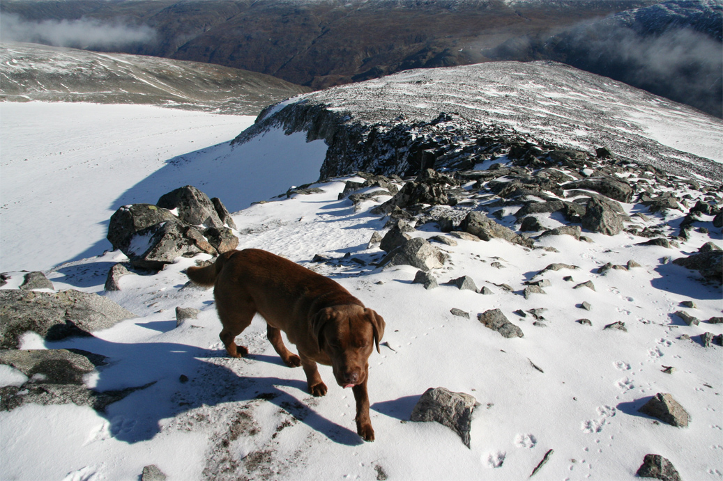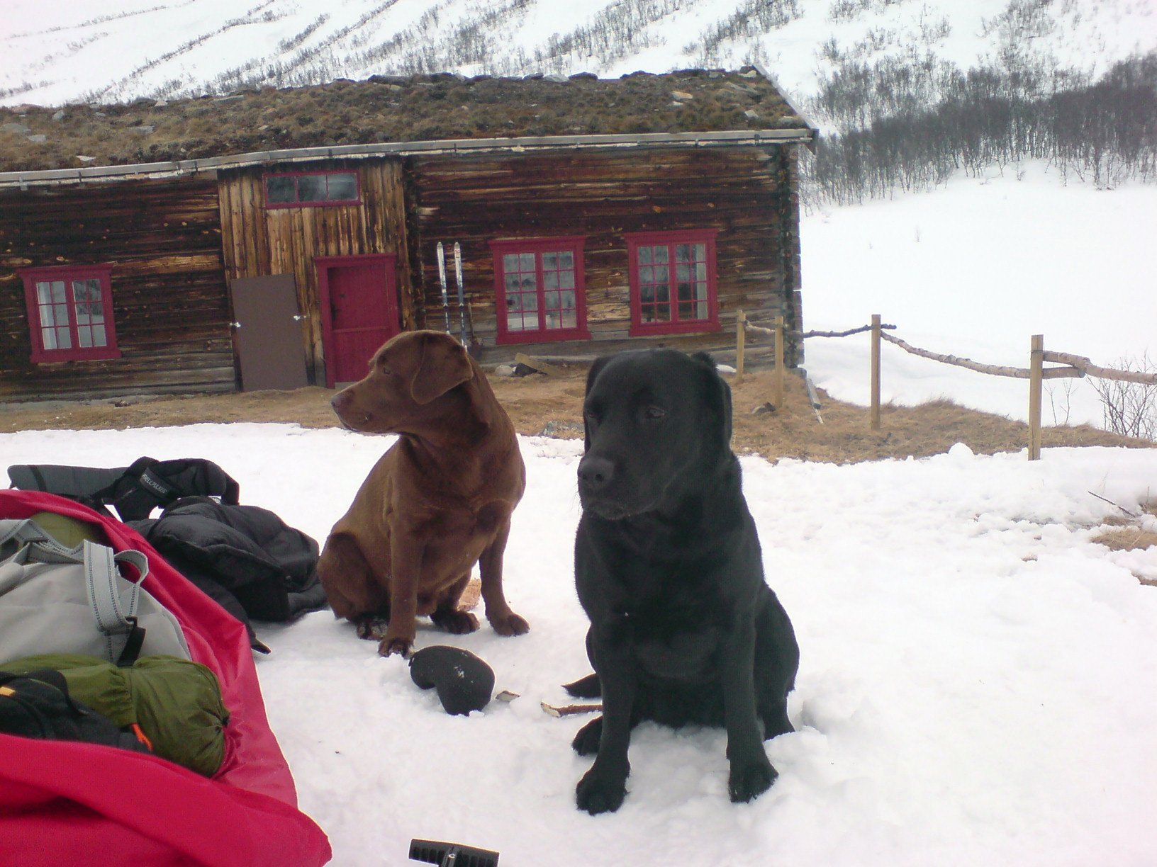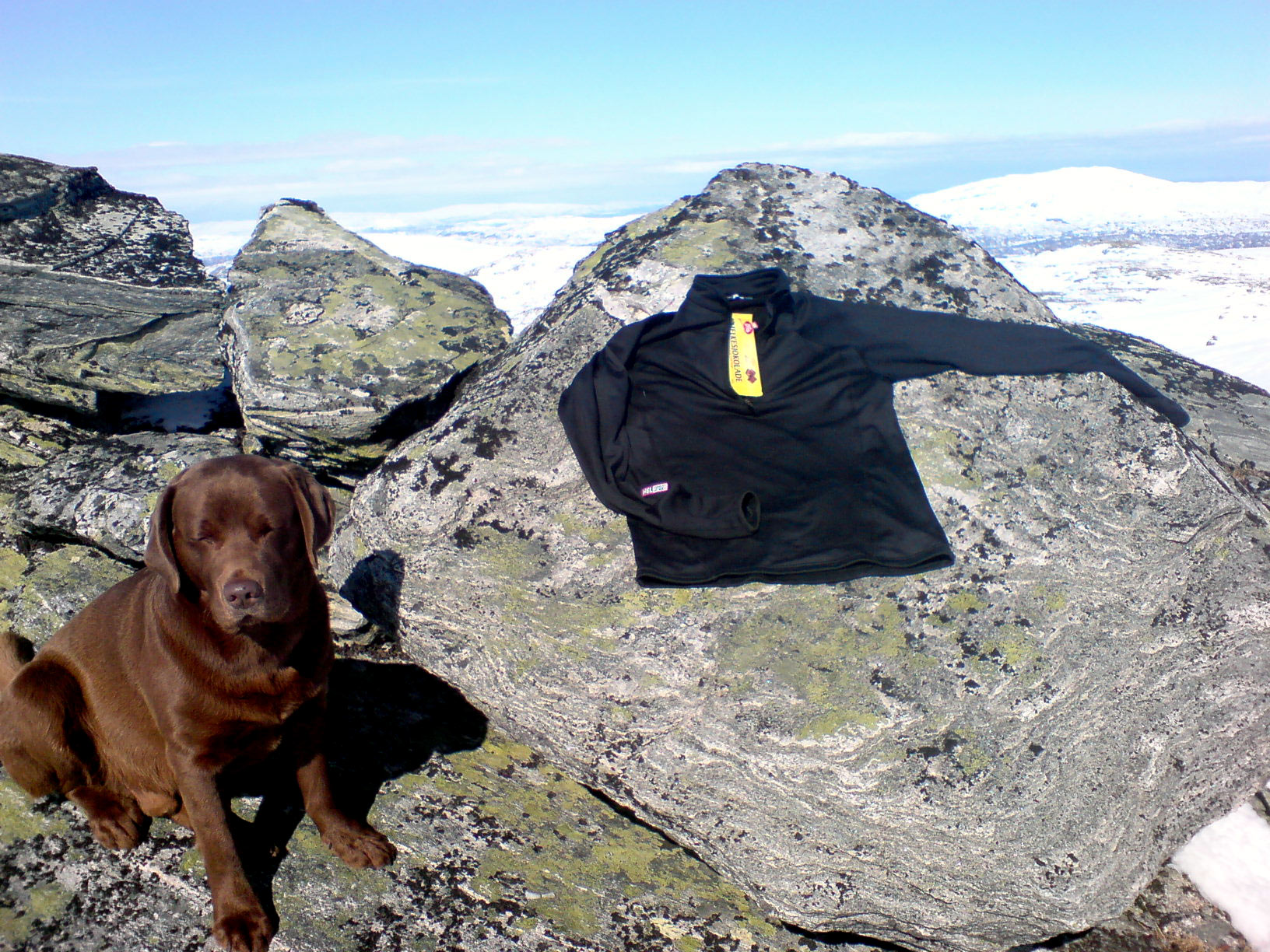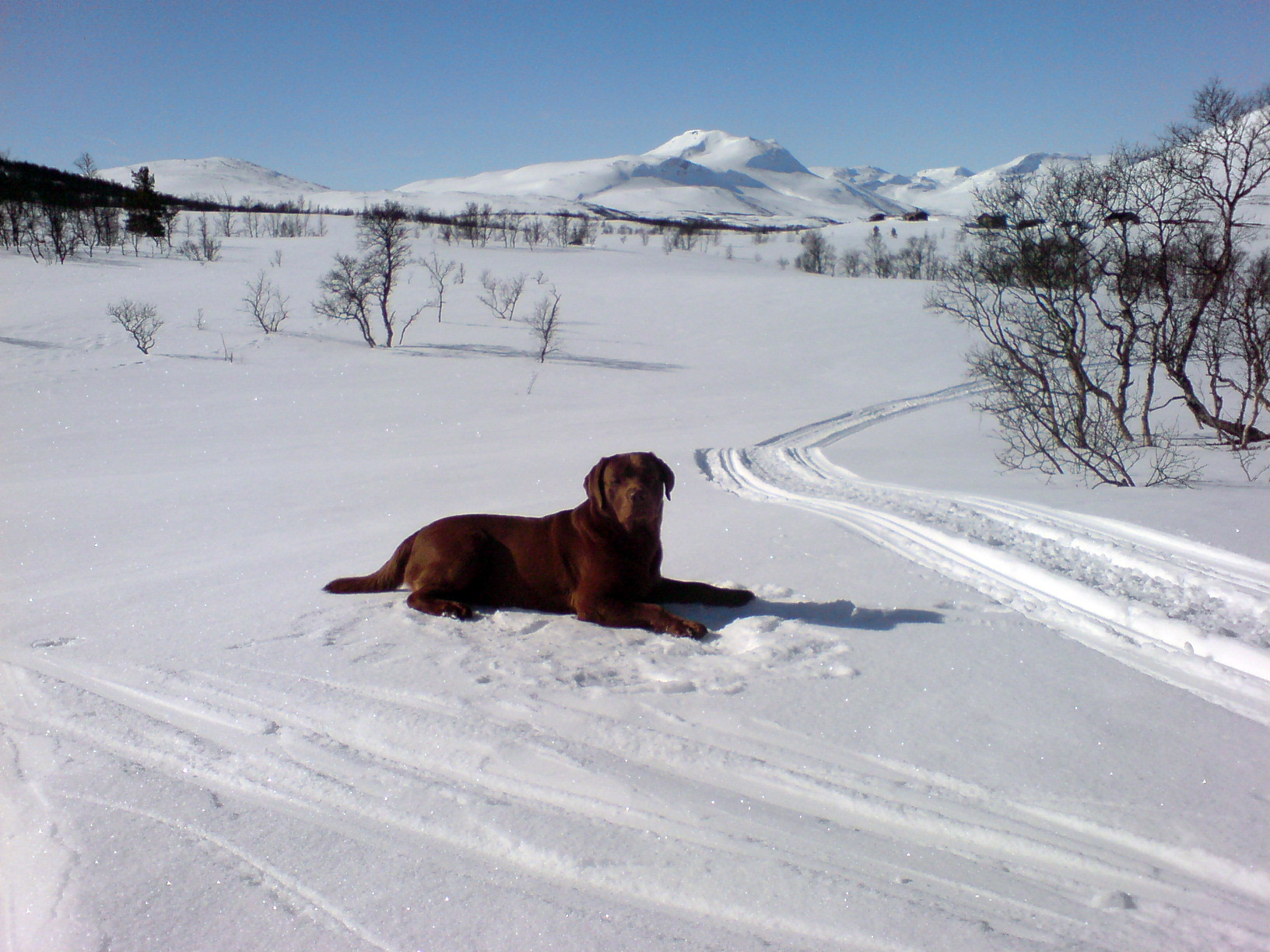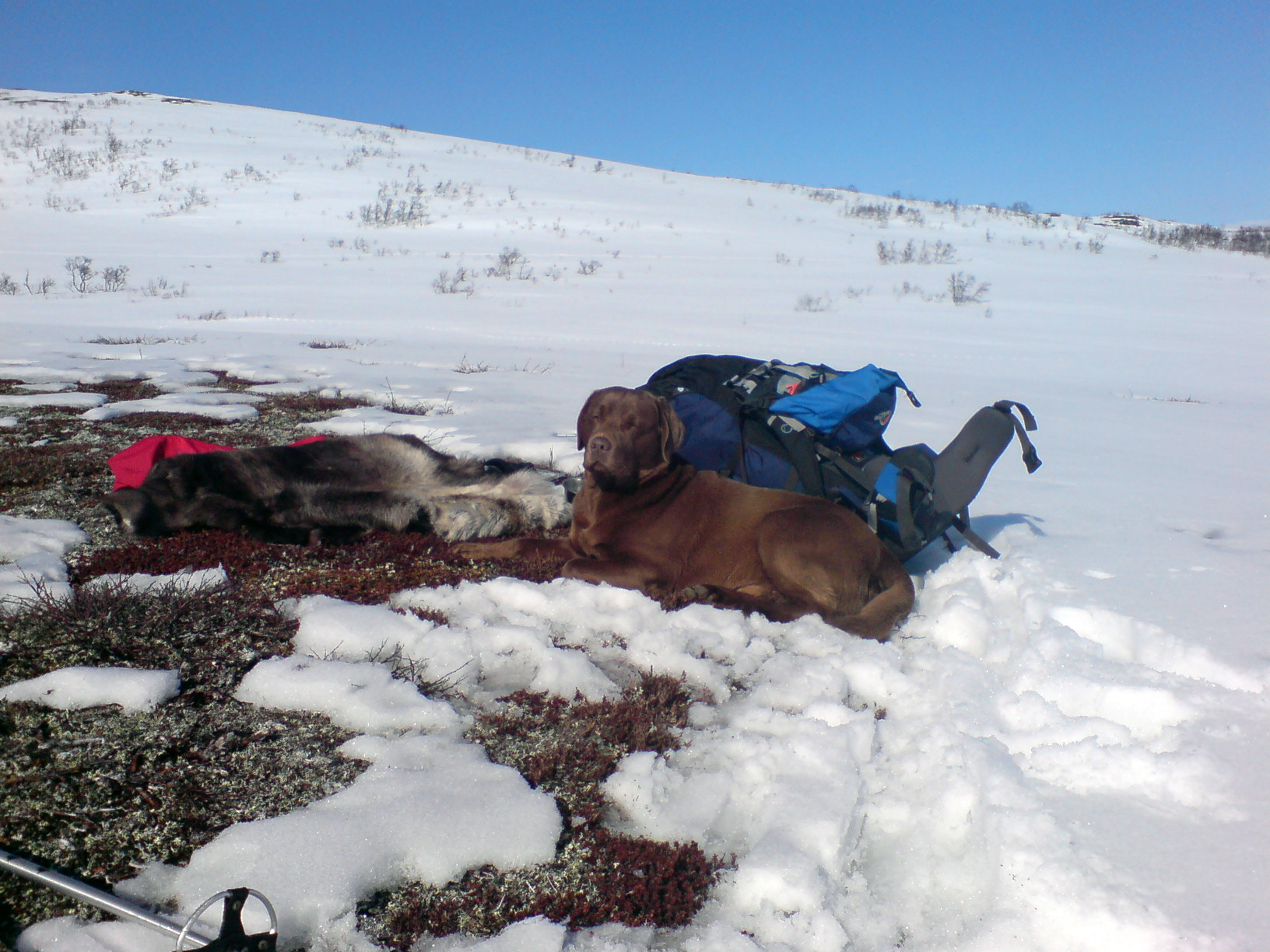Ja, føret var som sagt skikkelig tungt. Spesielt "nede" på flata de siste 2-3 km før p-plassen ved Skyte adm. Sola har vel stått bra på den siste tida, og hadde jeg hatt shortsen med, ville nok den blitt brukt både torsdag og fredag. På vei oppover stoppet vi som sagt ved et par "hytter" ved Svanålægret, og der sovna vi begge to på en barflekk. Det var vel kanskje turens høydepunkt....i tillegg til det å kjenne at man får skikkelig varme i teltet på kvelden, og om morgenen slik at frostrøyken forsvinner, ..eller å gå de siste 10-15 metrene opp til toppen,....eller å gå ut av teltet sent på kvelden å få seg Snøhetta-silouetten i solnedgang....eller å nok en gang ha kjempevær fra ende til annen.....eller kanskje å finne frem den iskalde pepsimaxflaska som lå i bilen etter at vi kom tilbake....hvem vet. Det var nok langt flere høydepunkter i løpet av turen enn rapporten min gir inntrykk av, men i går kveld, føltes det rett og slett slik ut. Tror også at Vesttoppen kan være et bedre valg både med tanke på utsikten videre sør & vestover, og også det å komme "nærmere" Stortoppen. Har jo etterhvert fått en følelse av at det faktisk mange ganger kan gi en bedre opplevelse å heller stå på en lavere topp, enn på den høyeste. ...og "den kule hunden" Phil, er alltid med på tur. Han er kanskje ikke den typen hund man forventer å treffe i fjellet, eller oppe i høyden, men han blitt en utholdelig labrador på snart 3 år. Min utfordring med ham, er at jeg må bremse litt og holde igjen, for det gjør ikke han. Det kan til tider gå litt fort nedover og det kan føre til at han tråkkker gjennom og skader beina. Han er tross alt 37,5kg, og det siste jeg vil er å måtte bære krabaten ned fra et eller annet fjell....derfor blir også pulken med...... I tillegg er han stort sett alltid enig med meg når vi skal ta avgjørelser underveis..... Er spent på hvordan det er der "oppe" om sommeren, og hvordan det evt er å dra på teltur i områdene rundt Svanåtindan & Skredahøin.