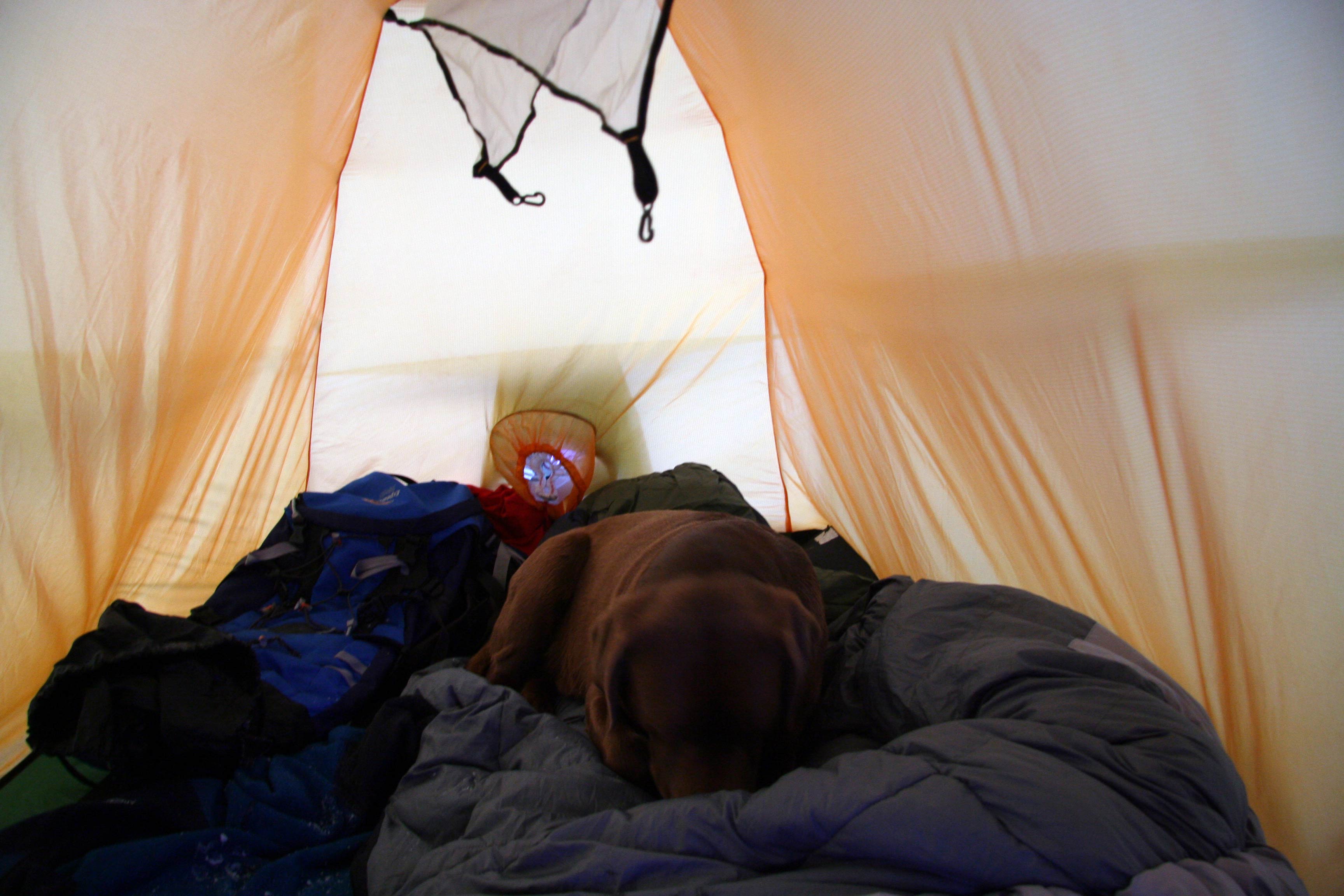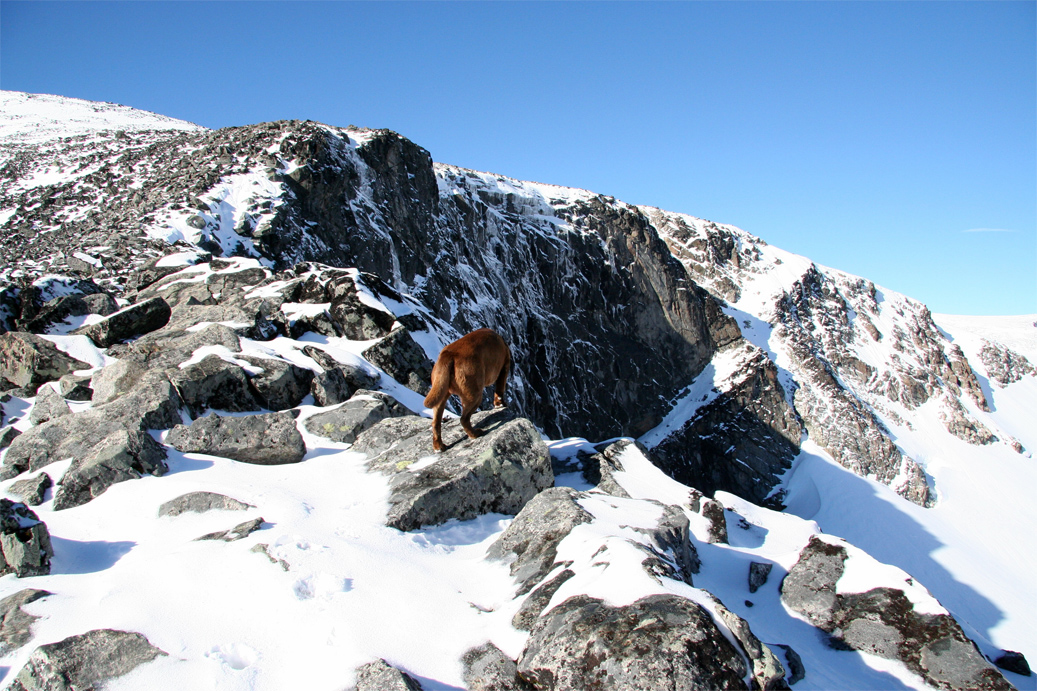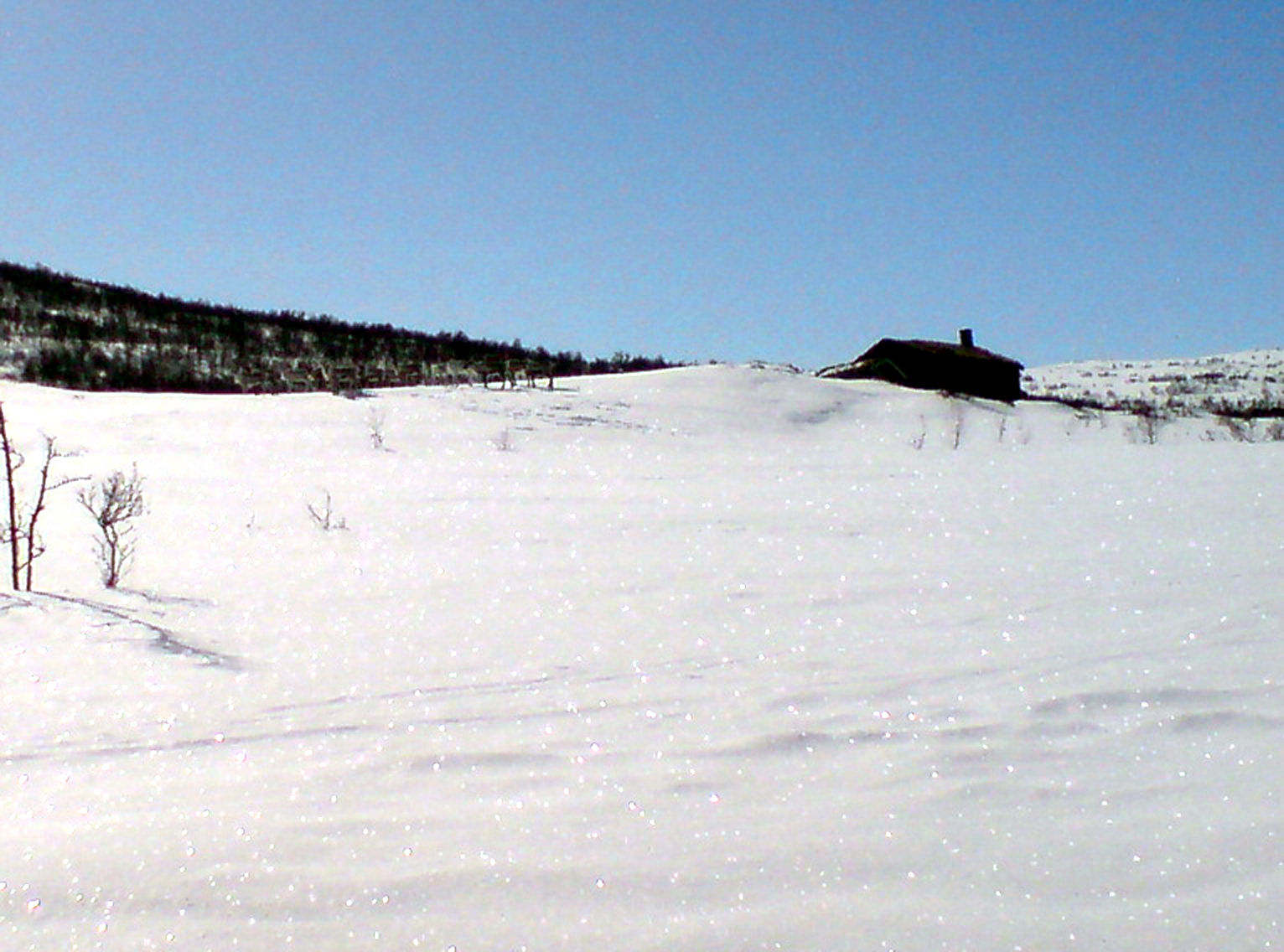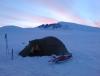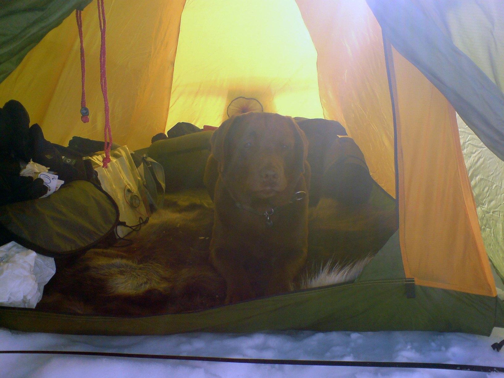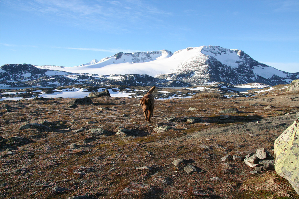 Ja, føret var som sagt skikkelig tungt. Spesielt "nede" på flata de siste 2-3 km før p-plassen ved Skyte adm. Sola har vel stått bra på den siste tida, og hadde jeg hatt shortsen med, ville nok den blitt brukt både torsdag og fredag. På vei oppover stoppet vi som sagt ved et par "hytter" ved Svanålægret, og der sovna vi begge to på en barflekk. Det var vel kanskje turens høydepunkt....i tillegg til det å kjenne at man får skikkelig varme i teltet på kvelden, og om morgenen slik at frostrøyken forsvinner, ..eller å gå de siste 10-15 metrene opp til toppen,....eller å gå ut av teltet sent på kvelden å få seg Snøhetta-silouetten i solnedgang....eller å nok en gang ha kjempevær fra ende til annen.....eller kanskje å finne frem den iskalde pepsimaxflaska som lå i bilen etter at vi kom tilbake....hvem vet. Det var nok langt flere høydepunkter i løpet av turen enn rapporten min gir inntrykk av, men i går kveld, føltes det rett og slett slik ut. Tror også at Vesttoppen kan være et bedre valg både med tanke på utsikten videre sør & vestover, og også det å komme "nærmere" Stortoppen. Har jo etterhvert fått en følelse av at det faktisk mange ganger kan gi en bedre opplevelse å heller stå på en lavere topp, enn på den høyeste. ...og "den kule hunden" Phil, er alltid med på tur. Han er kanskje ikke den typen hund man forventer å treffe i fjellet, eller oppe i høyden, men han blitt en utholdelig labrador på snart 3 år. Min utfordring med ham, er at jeg må bremse litt og holde igjen, for det gjør ikke han. Det kan til tider gå litt fort nedover og det kan føre til at han tråkkker gjennom og skader beina. Han er tross alt 37,5kg, og det siste jeg vil er å måtte bære krabaten ned fra et eller annet fjell....derfor blir også pulken med...... I tillegg er han stort sett alltid enig med meg når vi skal ta avgjørelser underveis..... Er spent på hvordan det er der "oppe" om sommeren, og hvordan det evt er å dra på teltur i områdene rundt Svanåtindan & Skredahøin.