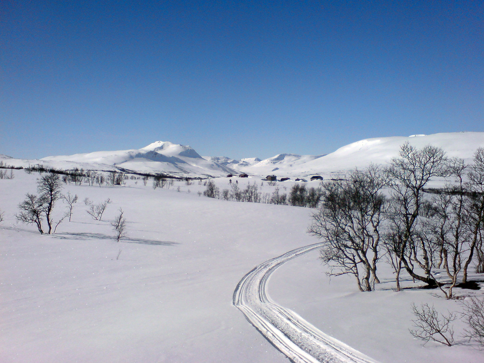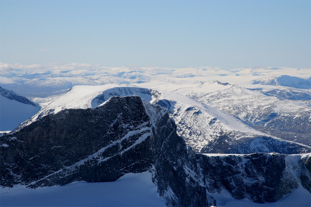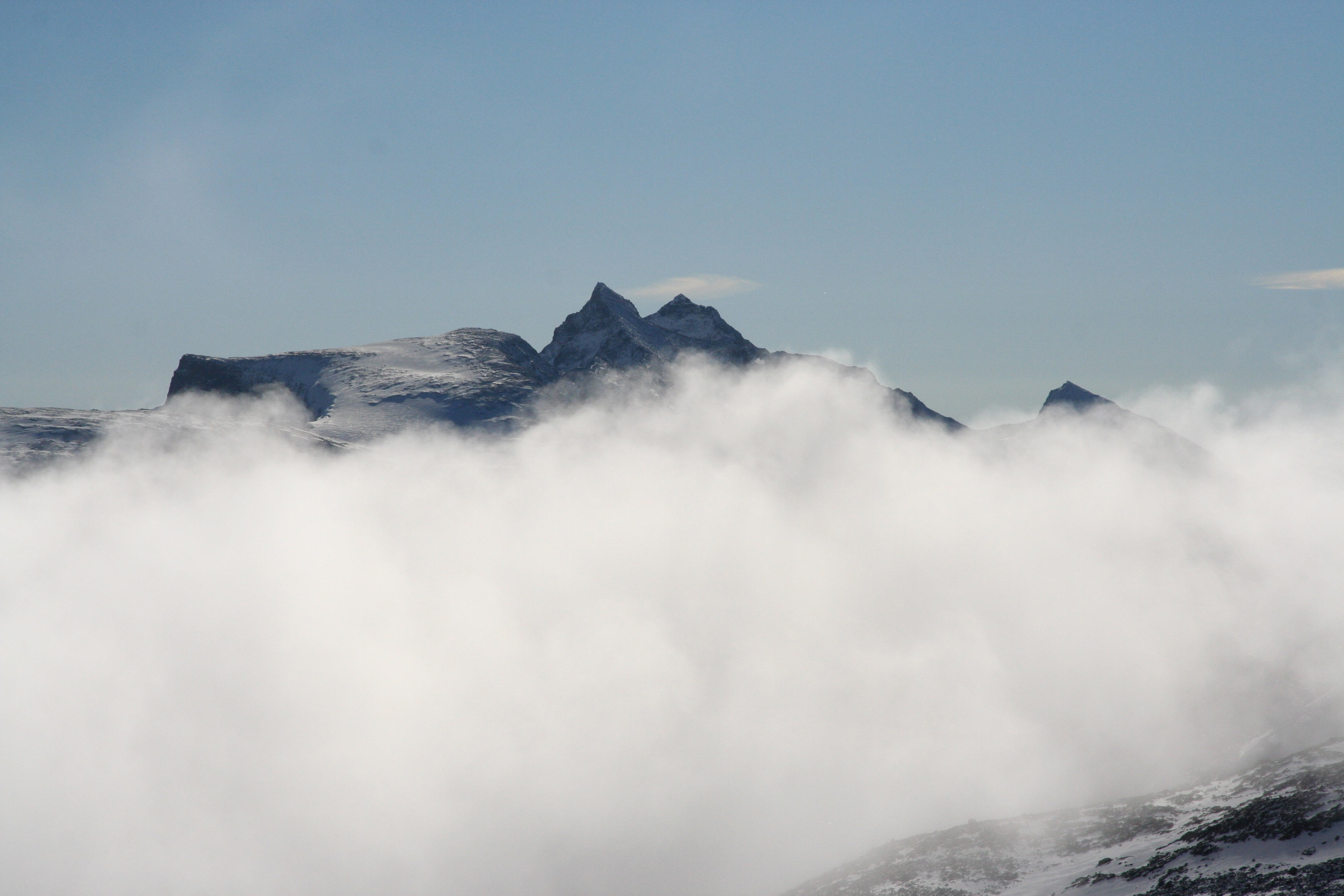 Har brukt de siste 2 timene av kvelden til å prøve å ikke la irritasjonen over "skytefeltet" på Hjerkin gå utover rapporten, og skal prøve å ikke nevne det...... Endelig ble det torsdag, og det var klart for nye eventyr. Værmeldinga var, som vanlig, strålende, og Snøhette var målet. Hadde ikke bestemt meg for hvor vi skulle starte, men hadde flere alternativer. Kongsvold, Grønbakken & Hjerkinn, men skulle forhøre meg ang forholdene først. Kjørte fra hjemmefra ca 10:30 , og kjørte hjemmefra igjen ca 1050. Hadde glemt GPSn, og måtte hente den. Oppdal var førset mål, og der skulle jeg kjøpe nye frontfester til fellene. har G3 exp.skins, men frontfestet er litt i breisete laget, slik at ved løs og tung snø, så kommer det lett snø melleom fella og skisålen. Gutta på MxSport på Oppdal fiksa det, og gav meg tips om å starte fra Hjerkin. I og med at jeg skulle drasse på pulken, ville det være en mye lettere rute. Da valget ble tatt, var så Snøheim neste mål, og teltet ble pakket ned i pulken sammen alt annet jeg skulle ha med. I min iver ettter å komme avgårde, la jeg ingen plan for turne, annet enn at jeg skulle gå "rett frem, samme hve jeg støtet på". Dvs korteset vei til Snøheim. Klokka hadde rukket å bli 14:30 da jeg tok de førset takene ut fra parkeringa ved Skyteadm., og allerede etter ca 100m, ante jeg konturene av en tung tur. Snøen var pill råtten, bløt, og det var et slit fra førset stavtaket. Jeg slet meg over Haukbergsmyrin, med kurs for Svanålægeret, og må ærlig innrømme at det gikk på motivasjonen løs. Til tross for breie ski, 78-56-60, så ble det en kamp mot alle de kreftene som ville skia mine til livs....Vel fremme ved en barflekk ved Svanålægeret, ble det en skikkelig pause, og klokke hadde rukket å bli "fantastiske" 17:30. Sola steika godt ennå, og både jeg og Phil, tok oss en dupp i solen....30 min senere var det på`n igjen, og vi fortsatte videre. Vi fulgte skispora , og fulgte Stridåi-dalen opp den siste biten. Da vi endelig kom frem til Snøheim var klokka ca 20:00. Dvs 5,5timer på ca 13-14km. Teltplass ble etablert, og så var det bare å sette i gang med snøsmelting. Vi spiste kveldsmat, og Phil slukna ca 21:30, mens jeg måtte nyte kvelden og knipse litt bilder. Det var et nydelig vær, og ikke et vindpust, og det lå an til å bli en kald natt. Og kald natt ble det, men jeg lå trygt og varmt inne i min Helsport Raudfjorden i bare undertøye, mens Phil lå som vanlig på dunjakka. I tillegg hadde vi både reinskinn og 14mm underlag, så vi hadde ingenting å sutre over. Neste morgen våkna jeg allerede ca 5:30. Måtte ut å sjekke forholdene, og som ventet, iskladt. Sola var på vei opp, og foran meg stod Snøhettamassivet og ventet på oss. Vi skulle opp på Stortoppen, og det skulle vi gjøre tidligst mulig, slik at forholdene skulle være best mulig. Ca 7:30 satte vi kursen for Snøhetta, og tror du fa...meg ikke at snøen var like råtten her, som lengere nedenfor Snøheim. Turen bortover forbi Stridatjørning og mot stigningen brukte vi nesten en time på, og turen fra i går satt godt i kroppen. Da vi begynte å "klatre", ble det litt bedre forhold, men tungt var det uansett. Vi tok en pause på ca 1700moh, og noe unødvendig utstyr ble lagt igjen. Vi fortsatte videre oppover, og flere og flere "konturer" av fjell snek seg frem. Det så ut til at Snøhetta var det eneste fjellet som ikke lå inne i morgendisen... Ved 1900moh, ble det en ny pause, og her ble det helt seriøst vurdert å bryte. Beina var helt døde, og vi hadde dårlig med drikke igjen. Men det ble raskt besluttet at her skal vi jammen meg ikke gi oss nei. Like ved der "stiene" fra Snøheim & Reinheim møtes, ble skiene satt igjen. Det så ut til at det kunne bli litt kronglete nedkjøring, og jeg fortsatte uten skia. I og for seg et greit valg, men fra ca 2000moh og oppover, ble det litt "fokkete" og jeg sank litt ned for hvert steg. Jeg syntes jo at stigningen opp Langfjellet var lang og bratt, men denne var ikke noe dårligere den heller. Jeg måtte virkelig jobbe med motivasjonen, og vi kom oss til topps ganske så nøyaktig klokka 9:47. Da hadde jeg ca 0,5liter vann igjen, som vi delte broderlig. Det første som slo meg da jeg var opp, var : Dette kunne jeg ha spart meg....maken til drittfjell.......og hvilken IDIOT har plassert hytta si her ????!!!!! For å være litt seriøs så må jeg ærlig innrømme at Snøhetta ikke vil havne blant mine favoritter. Selve toppen er jo totalt ødelagt av "hytta", fjella rundt er ikke av de helst spektatuklære, og desuten var føret bedritent.....men det skal ikke ødelegge følelsen av å stå på toppen av det høyste fjellet utenfor Jotunheimen. Slik jeg ser det er Snøhetta vakrere jo lengre unna den du er...men her er det vel mange som er uenige, og det er jo helt ok for meg. På toppen ble det lett etter motiv, men den berømte disen lå rundt over alt, med unntak av de aller nærmeste. Da vi hadde fått tatt de vi trengte og skrevet oss inn i boka, satte vi kursen nedover igjen. Nedturens høydepunkt var selvfølgelig å få kjørt en del telemarksvinger nedover, og ca klokka 12:00 var vi tilbake ved teltet ved Snøheim. Der ble det en liten pause, og vi spiste litt lunch. Pulken var pakket og klar til avgang ca 13:30, og planen var å skli ned på ca 1,5timer. Hadde håpet at sola ikke hadde fått gjort nok skade for dagen, men der tok jeg feil. Snøen var håpløs, og Phil gikk gjennom hele tiden. Jeg bestemte meg derfor for å følge veien ned og tilbake til bilen. Veien var delvis snøfri, og der det lå litt snø, ver det mye fastere, så Phil ikke gikk gjennom. Dermed kunne ha bruke vegen, mens jeg gikk på ski utenfor. De første 3-4km gikk kjempegreit, men etter hvert føltes det ut som om vi gikk, og gikk, og gikk, og gikk, uten at noe kom nærmere. Og de siste 2-3km, var snøen pill råtten. Tilbake til bilen ca 15:30, hadde vi vært "borte" i 25 timer, og GPSn viste 41km. I bi