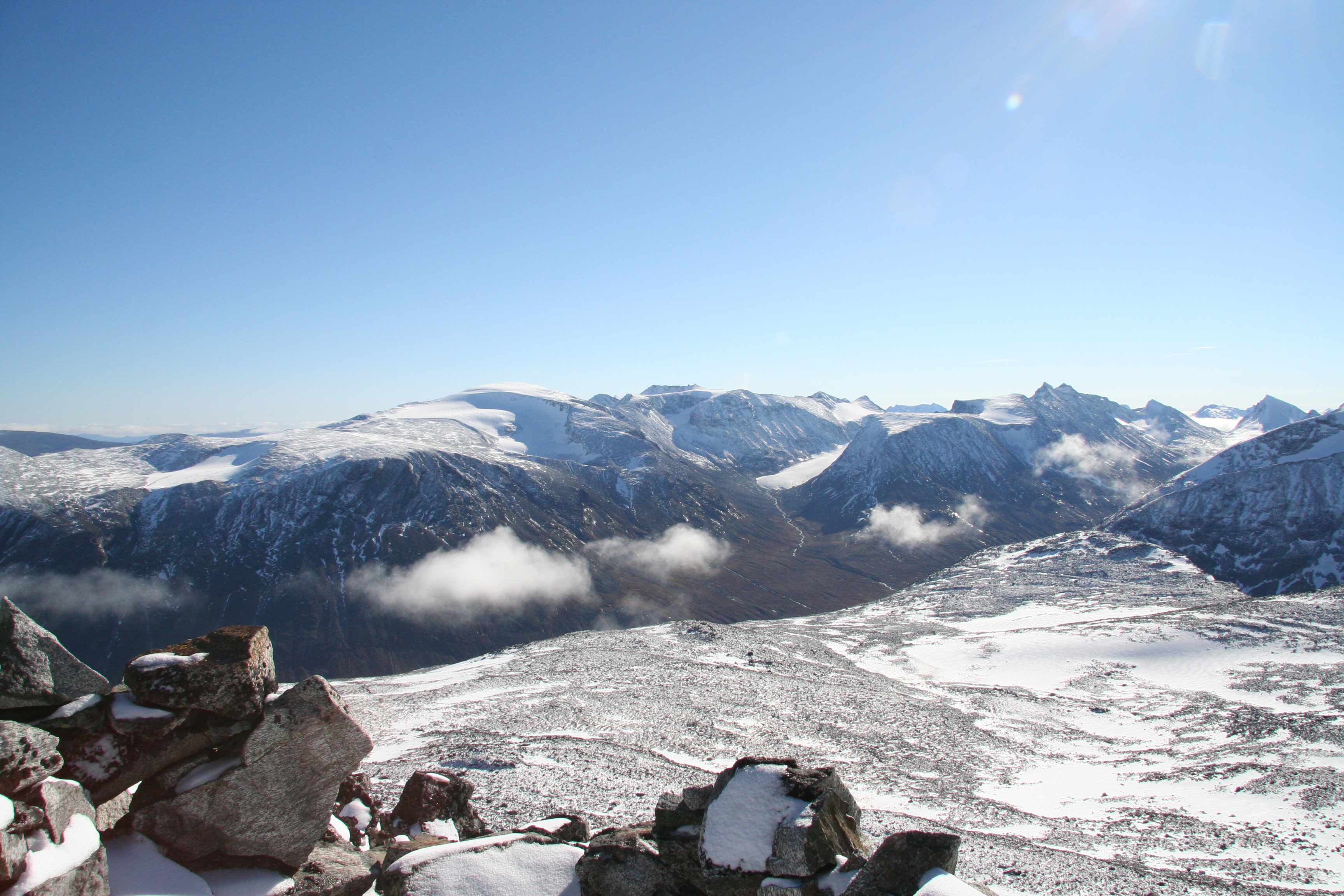 Bedre sent enne aldri... Siden "Fjellfinn" har påpekt at min ortografi har et noget større potensiale, skal jeg prøve å la bildene tale for seg i denne rapporten.....i tillegg skal jeg prøve å ta det litt rolig når jeg skriver, slik at bokstavene havner på rette sted. Har tross alt 4årig lærerutdannelse, så det skulle være en grei sak egentlig.... Nok om det. I høst skulle vi til Bergen for å delta på hundeutstilling med Phil. Som nybakt Viltsporchampion, måtte han ha premiering fra utstilling ettter at han fylte 2 år, og dermed skulle vi avslutte sesongen med en Bergenstur. Værmeldinga for Jotunheimen var bra, og vi dro fra Trondheim onsdag 26 sept. Hadde booket oss inn på Jotunheimen Fjellstue, og der fikk vi et kjempeflott hunderom i andre etasje. Vi ankom Fjellstua ca ved 20 tida på kvelden, og da var det selvfølgelig bekkmørkt. Vi hadde egentlig ikke bestemt oss for hva vi skulle gjøre dagen derpå, men hadde en liten plan om å gå opp på Loftet, som ligger like ved. Etter en liten kveldstur tok jeg en prat med betjeningen, og fikk klar beskjed om at jeg burde gå helt til topps, og gå opp på Piggen. Hvis jeg ikke gjorde det, kunne jeg finne meg et annet sted å sove neste natt....Beskjeden jeg fikk var like klar som været var da vi voknet ganske tidlig torsdag morgen. Soloppgangen mot Hestbreapiggan var et vakkert syn fra rommet, og himmelen var skyfri. Det hadde vært minusgrader på natta, så rimet lå over hele bilen. Vi spiste frokost, og pakket sekken, før vi satte kursen mot Spiterstulen. Bilturen dit var i og for seg en flott nok naturopplevelse i seg selv, og etterhvert som sola kom opp, og vi kjørte innover Visdalen, viste dalen seg med tilhørende fjell seg frem fra sin beste side...tror jeg. På Spiters var det en del skoleklasser, og vi besetmte oss for at vi skulle komme oss avgårde før dem. Sekken ble klagjort, og vi satte avgårde i et tempo som selvfølgelig var alt for høyt. Etter ca 30 min tok vi igjen en klasse fra Askim vg skole, som vi slo følge med videre oppover til det flata ut på vei opp mot Svellnose. Derfra gikk vi alene videre. Været var fantastisk, og som debutant i Jotunheimen, ble jeg overveldet over hvor vakkert det var. Snøkledde hvite fjelltopper i alle retninger, og sola varmet godt. Vi tok oss en liten pause like før toppen av Svellnose, før vi fortsatte videre mot Keilhaustopp. Piggen fremstod i en vakker snødekt drakt, og jeg så at det var en del folk på vei nedover fra toppen. Underlaget var til tider ganske hardt og på vei opp til Svellnose, Keilhaustopp og selve Piggen, måtte jeg sparke beina inn i skaren for å få feste. Jo nærmere vi kom, jo mer imponert og overveldet ble jeg av omgivelsene. Ikke nok med at det var strålende sol, men det var vindstille også.Må ærlig innrømme at lårene var ganske slitne da vi skulle ta den siste "bakken" opp mot toppen, og selvfølelsen ble ikke akkurat styrket da Phil fant ut at han skulle begynne å leke seg. Da vi endelig kom til topps, var vi helt alene, og det i seg selv var en mektig følelse. Utsikten var helt sinnsyk, og vi så Snøhetta langt i det fjerne. Siden det var mitt aller førset besøk på Galdhøpiggen, hadde jeg liten eller ingen peiling på hvilke fjell vi så, men for å si det slik: Vi så samtlige......uansett himmelretning. Etter ca 45min kom de første elevene fra Askim vg skole til toppen, og vi tilbrakte ca 30 min sammen med dem. Vi tok en hel del bilder, og spiste litt, før vi satte kursen tilbake mot Spiterstulen igjen. ca klokka 17 var vi tilbake ved bilen, og nok en gang erfarte jeg at sekken var overfyllt av masse ting som jeg ikke trengte.... Vi kjørte innom Lom for å handle litt, før vi dro tilbake til Jotunheimen Fjellstue, og en treretters...Da vi sovnet , ganske tidlig, var i allefall jeg fylt av mange utrolige inntrykk fra turen. Neset morgen viste seg å bli like vakker som den forrige. Og vi stod opp i rett tid. Etter frokost skulle vi kjøre til Bergen, og turen videre over Sognefjellet ble en opplevelse i seg selv. Morgensola var i ferd med å vekke alle "kjempene" som hadde fått på seg vinterdrakten. Med kameraet i fanget, ble det mange fotopauser på veien, og jeg tror vi brukte nesten 3 timer til Sogndal. Smørstabbtindan var et imponerende syn, og det samme var Fanaråkken og en hel haug med andre fjell , som for meg var, og fortsatt er "ukjente". Det var utrolig deilig å gå ut av bilen i friks morgenluft, 1-2 minusgrader og se at sola fikk stadig mer å si. I etterkant har turen og opplevelsene satt seg fast i ryggmargen, og at vi skal tilbake er helt sikkert. Foreløpig står det en ukes teltur på panen i høst, men hvor har vi ennå ikke bestemt. det behøver nødvendigvis ikke å være så mye topper involvert, men jeg regner med at fristelsen blir for stor til å unngå at det blir noen innslag av toppturer også. Har ikke 100% kontroll på hvilke fjell jeg har "navngitt", så til dere som kan dette, kom gjerne med kommentarer og rettelser.